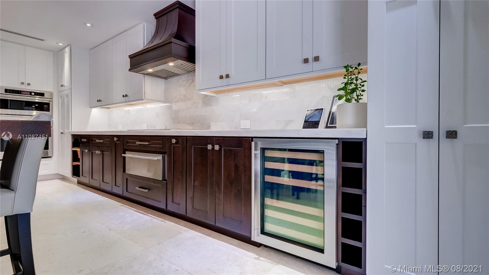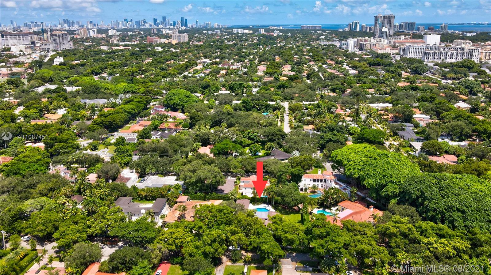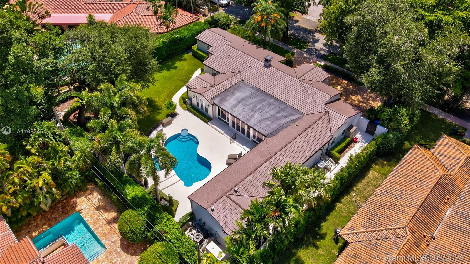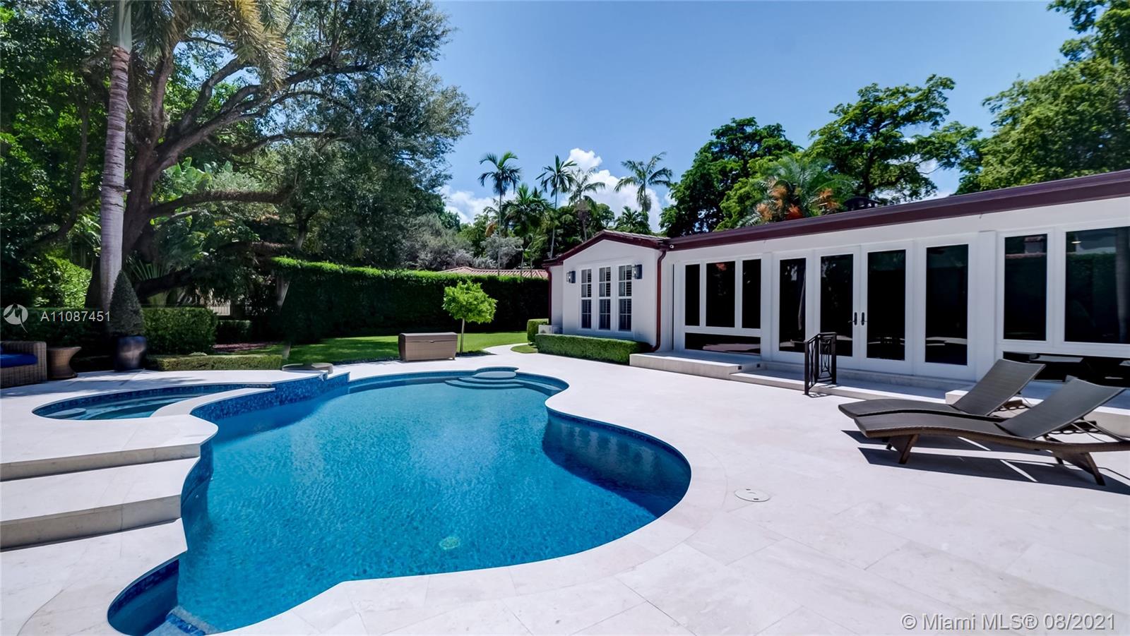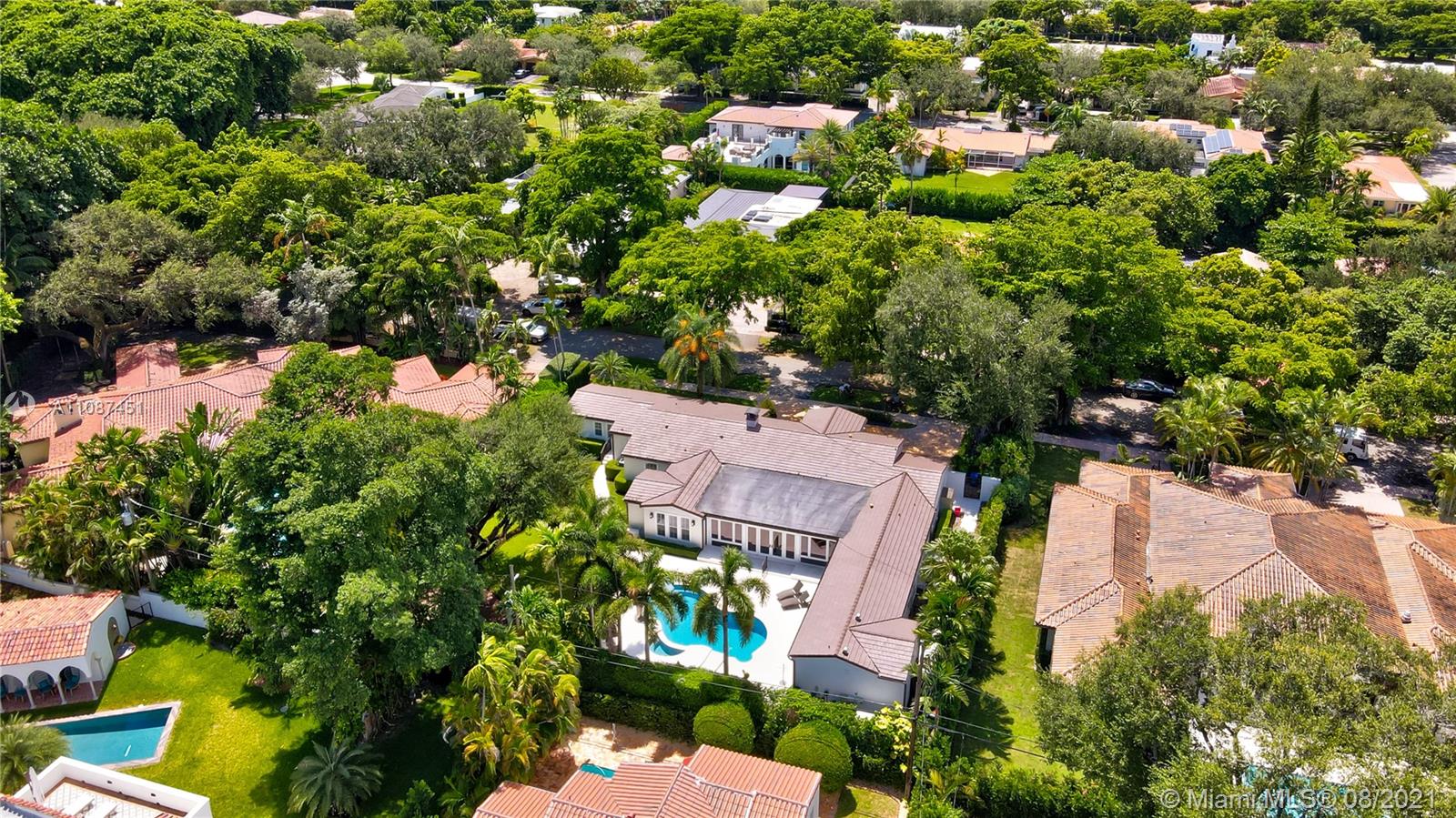 Unique opportunity in the heart of coveted Coral Gable’s Golden Triangle. 1930's renovated 5 Br 4 Ba home on quiet tree-lined 16,500 sqft lot. Property includes newly-built indoor/outdoor entertainment room w/ impact glass sliding doors, full bar & lynx grill + automatic roll down screen. State-of-the-art kitchen w/ subzero/WOLF, Miele appliances, oversized kitchen island w/ galley workstation sink and custom-integrated table, ideal for entertaining. Exquisite shell-stone and oak hardwood flooring. Large great room w/ floor-to-ceiling windows overlooking pool and yard area, offers plenty of natural sunlight. Lush landscaping w/ custom lighting. Extra features: Automatic standby generator w/ 500-gallon underground propane tank, 8 security cameras, Swat repellent integrated system & more!