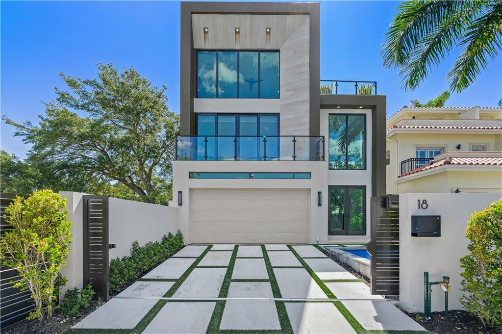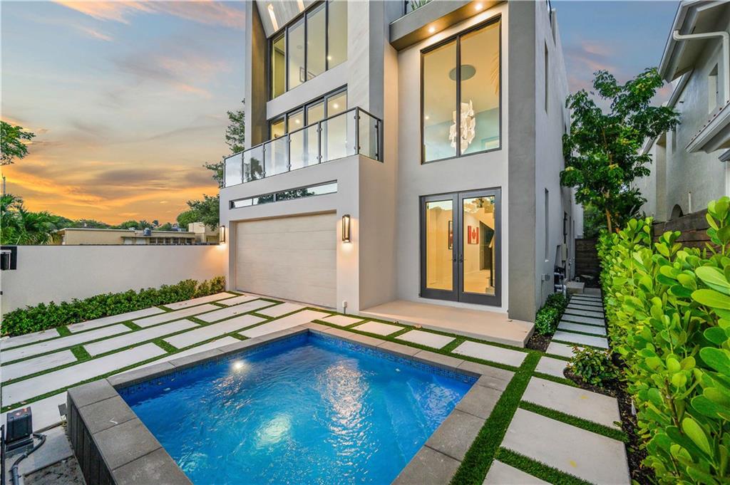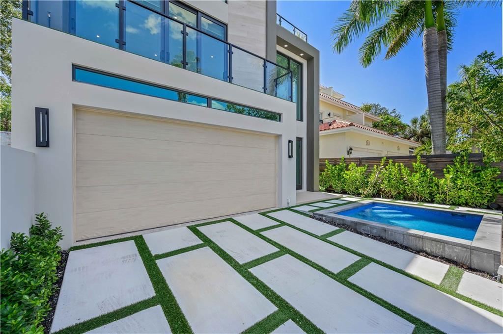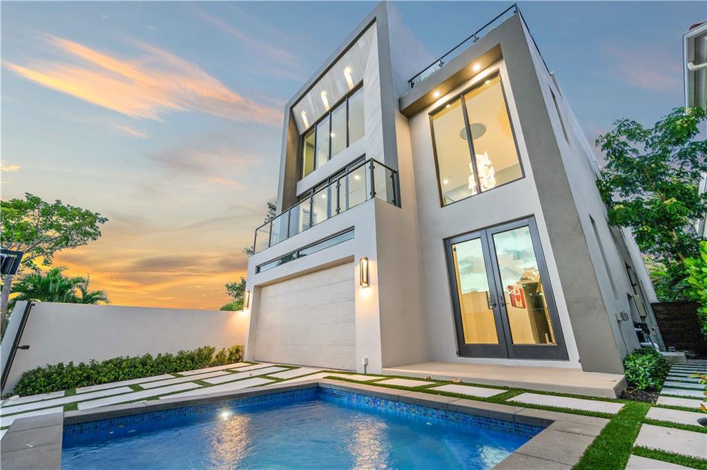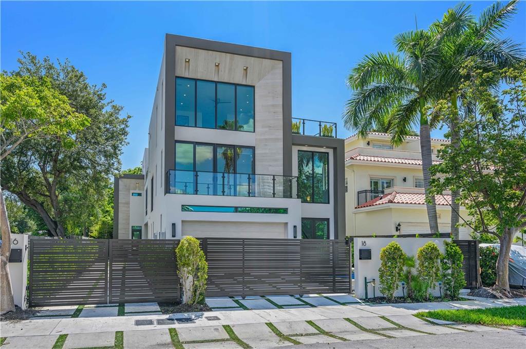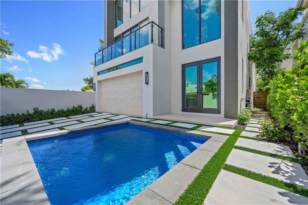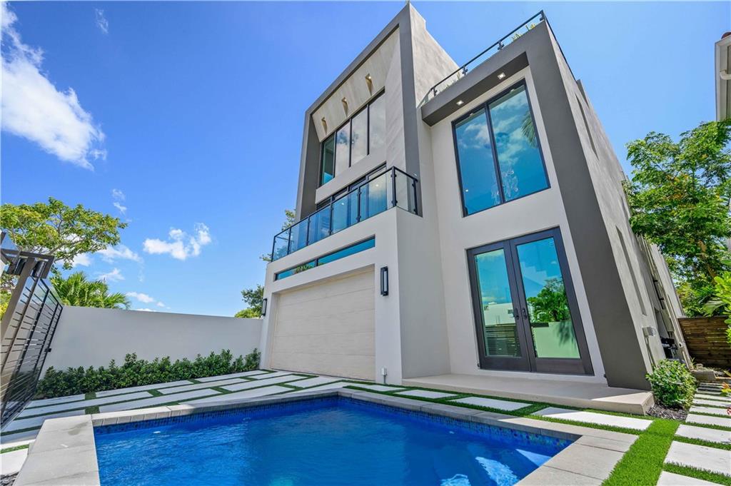 Instant Gratification! A ready to move into new 2021 Las Olas neighborhood pool home. This house is cool, modern and light filled with many technology and design upgrades. Two story foyer, main floor living, dining kitchen with breakfast island, powder room and laundry. Walls of glass provide dramatic city skyline views. The living room opens to an open balcony. The top floor is dedicated to the primary suite, and accesses a roof level terrace with gas grill and more fabulous views. All three levels are served by elevator. Gated drive, a splash pool and two car garage (over 10 ft height) has epoxy pebble flooring and slat wall storage system. An electric outlet is in place for EV charging. [Information is from 3rd party sources including BCPA and is believed accurate but not warranted].
