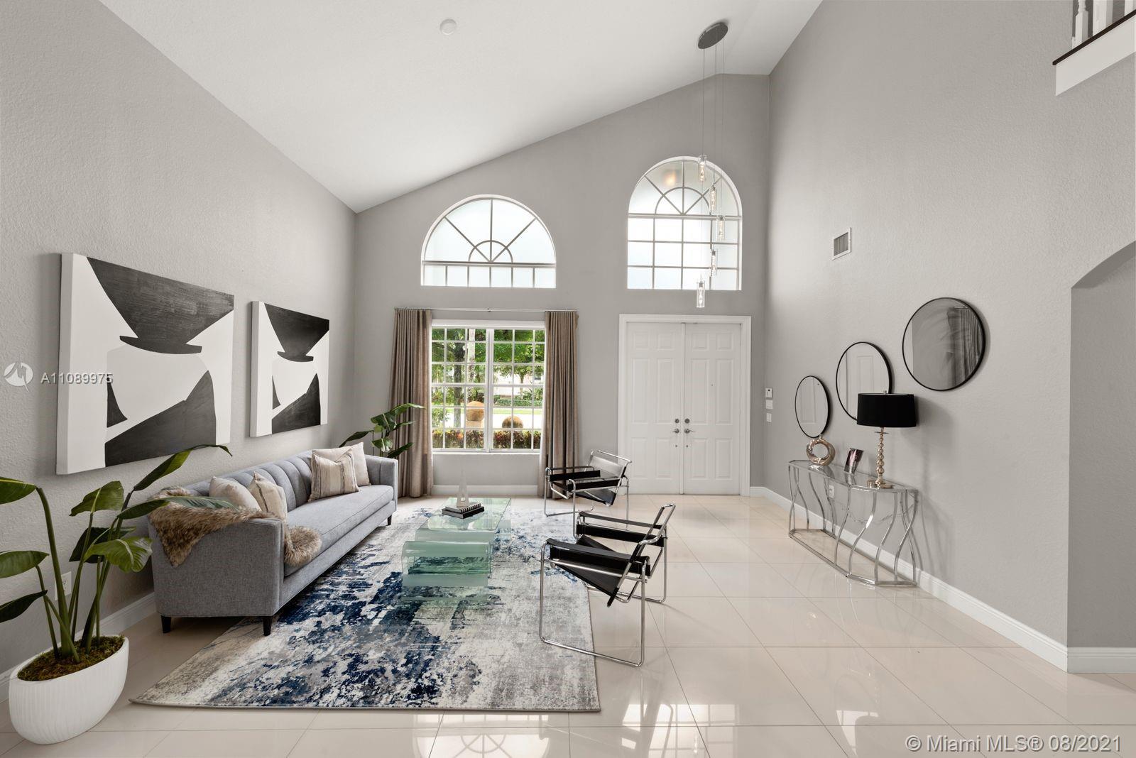 Absolutely stunning wide lake views from this desirable Sunset Falls pool home. Enter into the formal living room with breathtaking high ceilings allowing in abundant natural light. Elevated dining area leading into the beautifully remodeled kitchen with an oversized island & quartz countertops. Enjoy endless pool & lake views from the large family room that leads out to the patio where you can enjoy one of a kind sunsets on one of the largest lakes in Miramar. The master has a sitting area, bathroom with huge walk in shower & custom closets. Huge master bedroom balcony perfect for morning coffee with a water view! Jack & Jill upstairs bedrooms & a bedroom with bathroom & half bath downstairs make for a perfect layout. Gated community with a pool, exercise room, tennis, basketball & parks