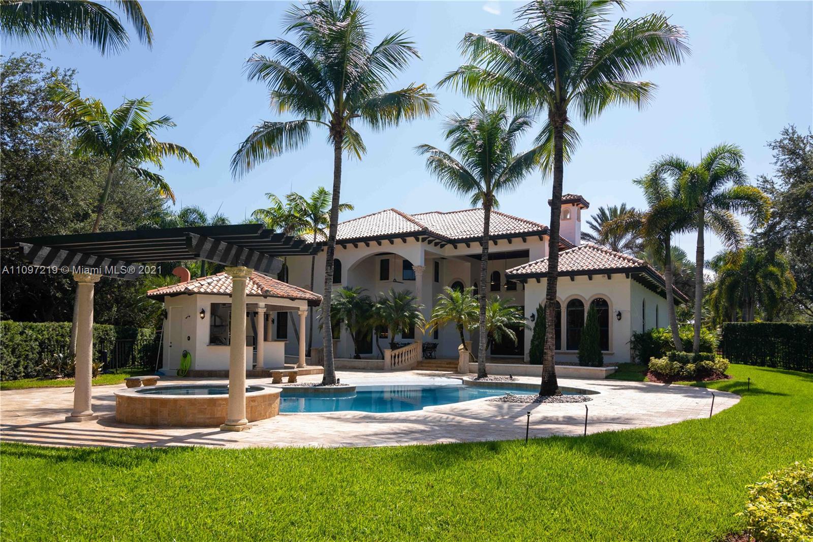 Amazing Mediterranean mansion in Davie.Oversized master bedroom on ground floor with sitting area, three walk in closets,beautifully remodeled master bathroom. Wet bar with Wine Cellar and Humidor. Large game room/gym.Home office with attached bath. Real wood fire place.Completely remodeled kitchen with beautiful Quartz tops, high end Bosch, Thermidor and Subzero appliances.Three designer bedrooms upstairs all with attached baths and walk in closets.Wood and marble flooring throughout.Guest house with brand new kitchen. Impact windows and doors.Gas Generator with in ground gas tank that can power the house for days LED lights throughout the house. summer kitchen with bar.Huge backyard with gorgeous lake views.Resort style walk in saltwater heated pool with Jacuzzi.Community Tennis court.