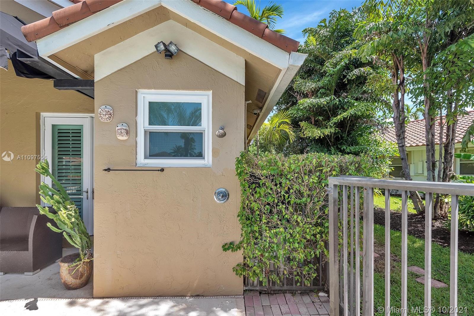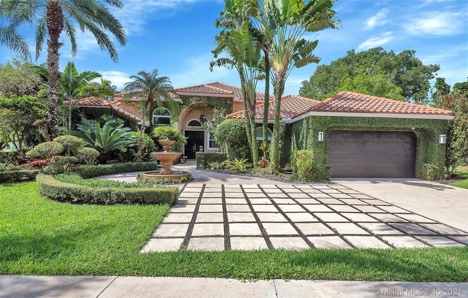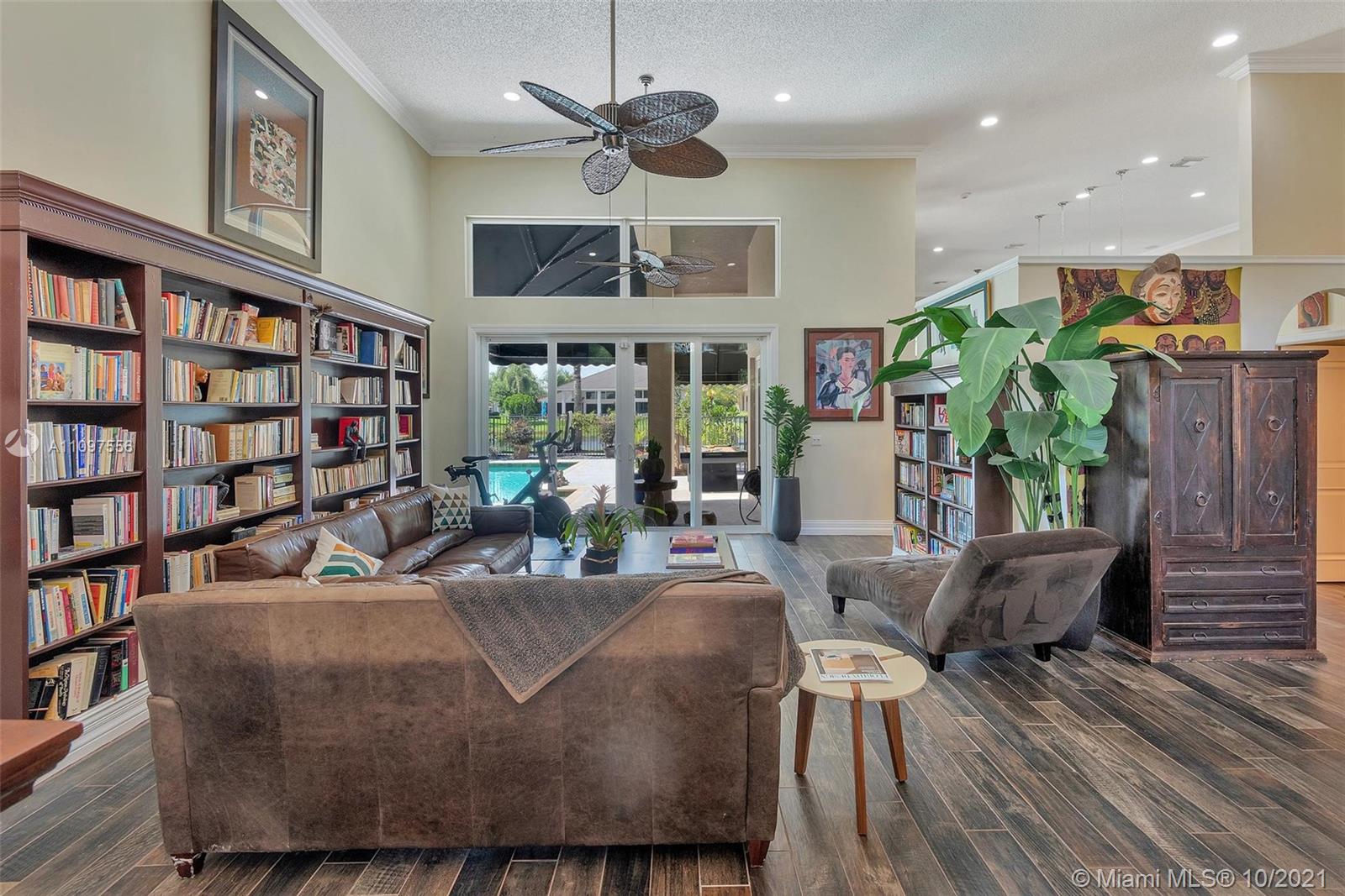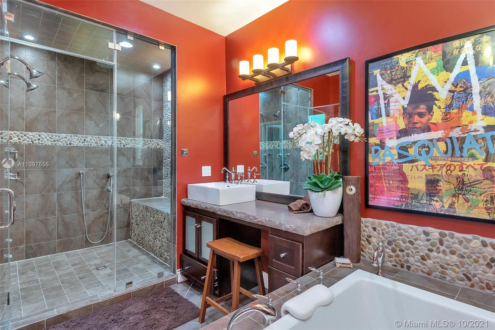 Spectacular lakefront estate in prestigious boutique Palm Island! This luxury home is a single-story it has a heated pool, fully fenced back yard, steam shower in primary bath, cabana half bath, outdoor shower, and a totally private picturesque view! The property had a huge living area, a separate dining area, a bonus Florida room. Spacious 3-split floor plan w/high ceilings, crown molding, electric water heater, plantation shutters, indestructible wood look floors, custom closets, wet laundry room, Thermador appliances, gas stove, Miele Coffee maker in the gourmet kitchen with L shape Island, wet bar w/kegerator, LED lighting, newer roof, newer ACs, garage with wall ac unit, hurricane impact windows and doors, manicured landscape, huge driveway with 2 car garage & much more! A+ schools!