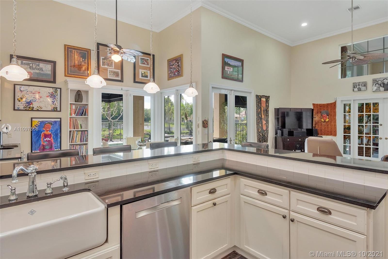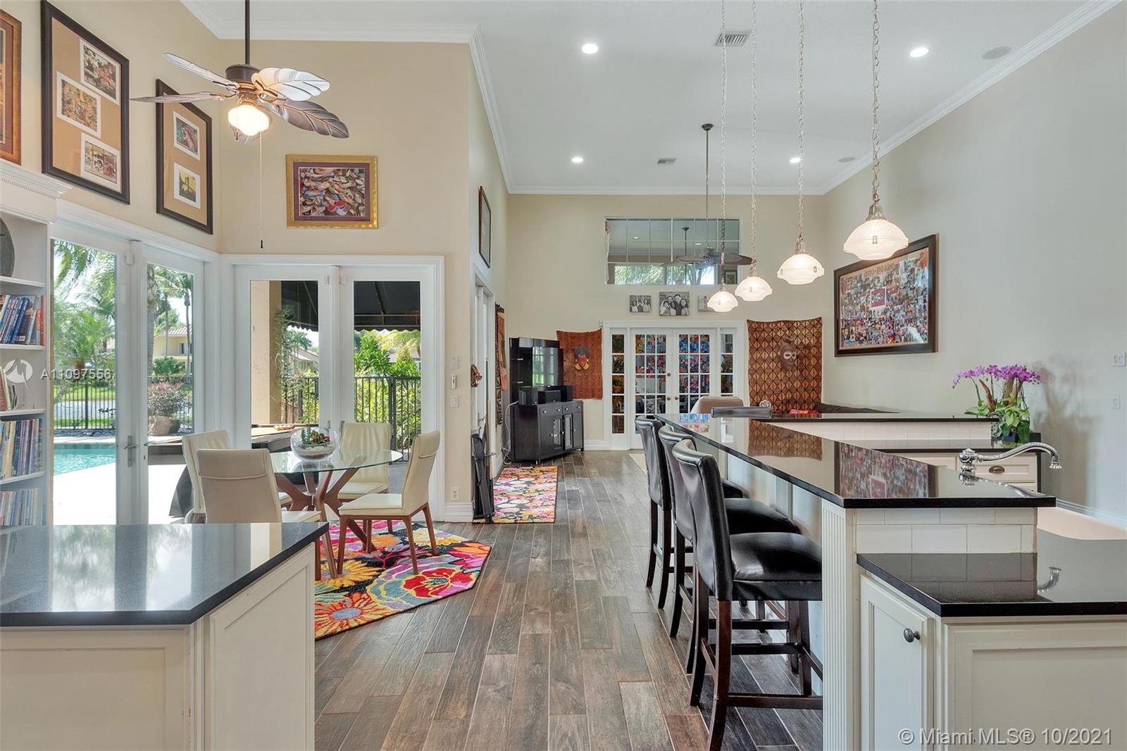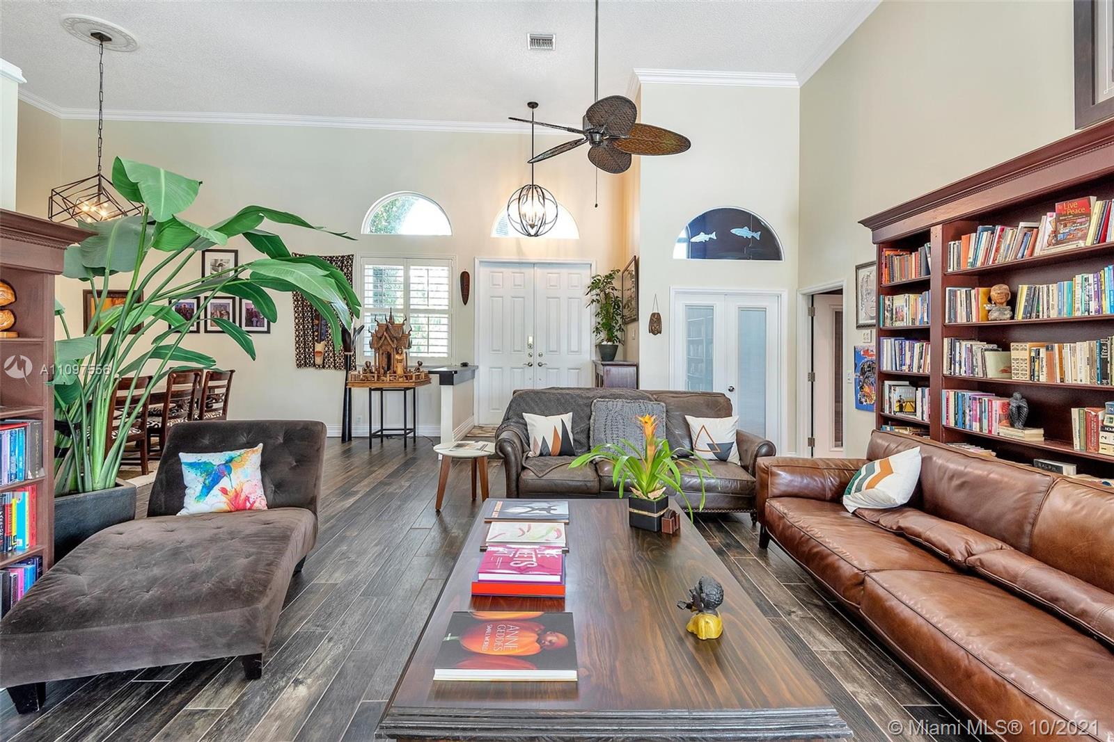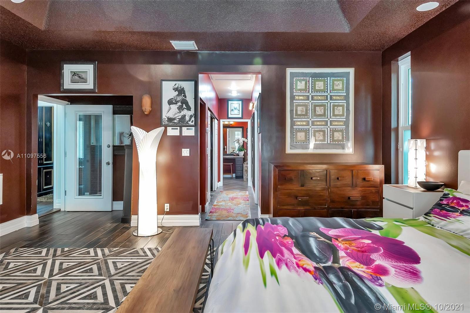 Spectacular lakefront estate in prestigious boutique Palm Island! This luxury home is a single-story it has a heated pool, fully fenced back yard, steam shower in primary bath, cabana half bath, outdoor shower, and a totally private picturesque view! The property had a huge living area, a separate dining area, a bonus Florida room. Spacious 3-split floor plan w/high ceilings, crown molding, electric water heater, plantation shutters, indestructible wood look floors, custom closets, wet laundry room, Thermador appliances, gas stove, Miele Coffee maker in the gourmet kitchen with L shape Island, wet bar w/kegerator, LED lighting, newer roof, newer ACs, garage with wall ac unit, hurricane impact windows and doors, manicured landscape, huge driveway with 2 car garage & much more! A+ schools!