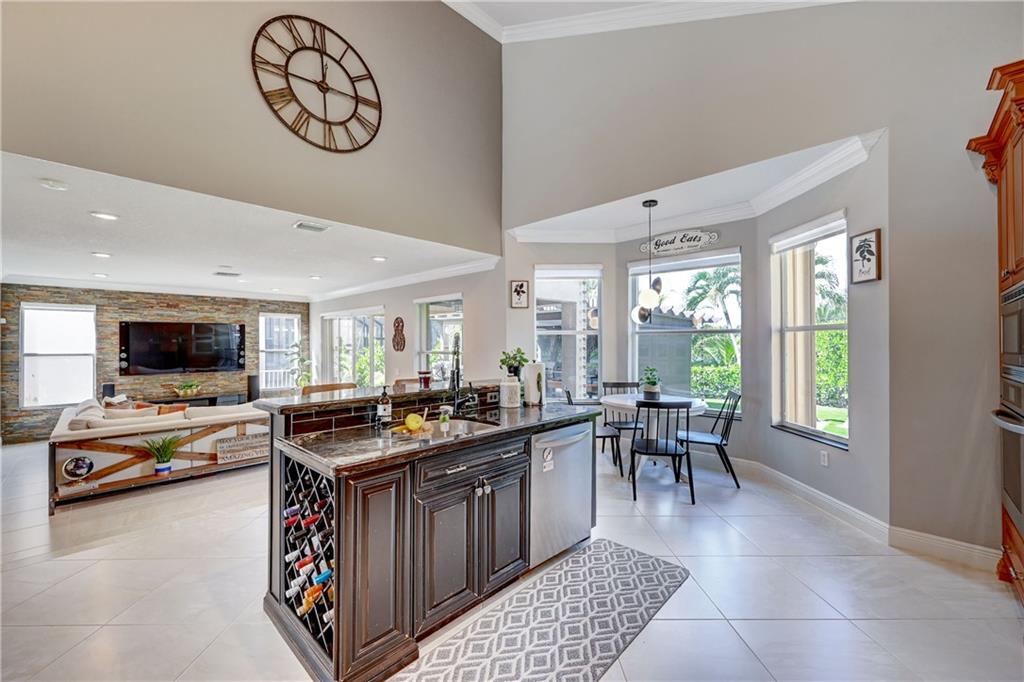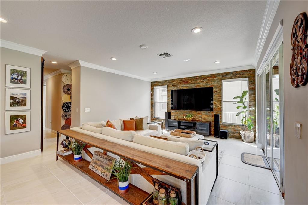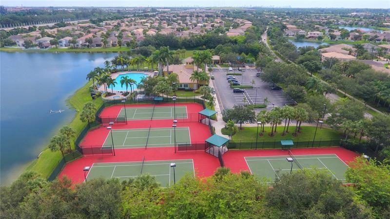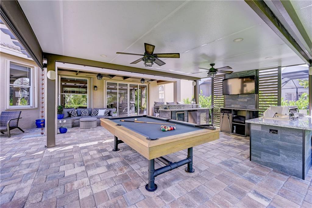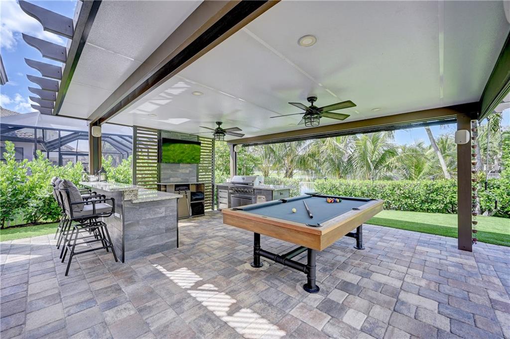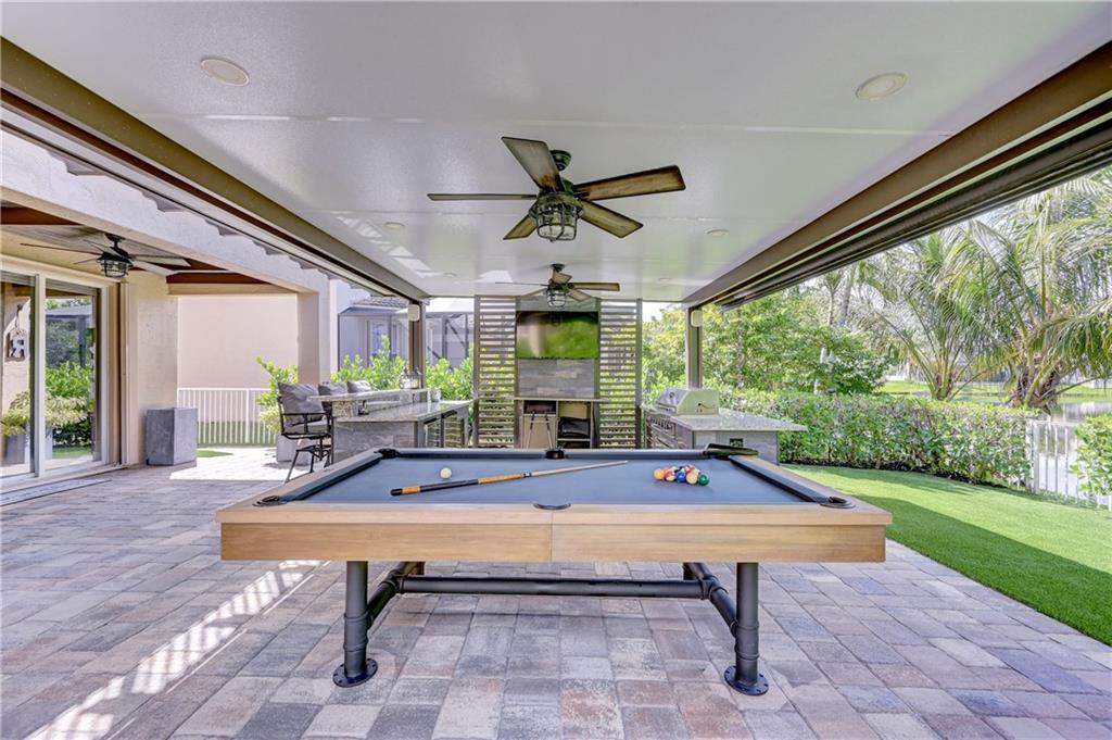 2978 sq ft home in gated community with natural light and custom upgrades throughout that include Cat5 cable and hurricane shutters. Modern floor plan with large living spaces and vaulted ceilings. Kitchen has granite counters, stainless 3-door fridge (Samsung), dishwasher, built in oven, stove and microwave (LG). 2 new central A/C units (Carrier) with Smart Thermostats. New exterior paint. Master bed has his/her bathrooms with shared shower, his/her walk in closets that measure 10'x5' and 7'x5' and French doors onto a balcony. Entertainer's paradise with privacy landscaping, putting green, Pergola with shade screens (can be lowered/raised), recessed lighting, TV, grill, fridge and pool table with table top/ping pong. Low HOA fee @ 145/mo (includes internet, pool, gym, 24hr security)