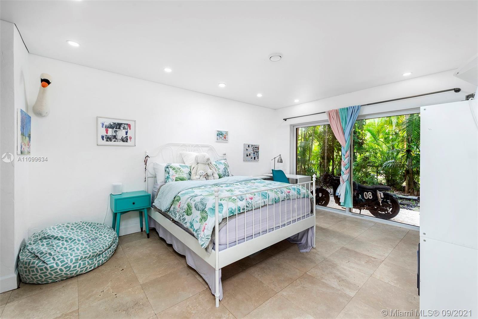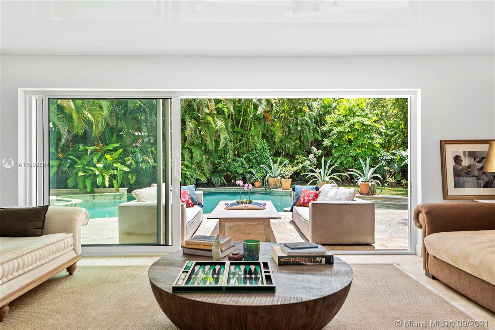 Once in lifetime Miami Shores opportunity to live in a private, tropical oasis under majestic oaks overlooking a stunning, free form pool with beach, jacuzzi, and waterfall! This beautifully updated 4 bed 3 bath, midcentury modern residence offers 4 distinct outdoor living areas for your daytime and evening enjoyment. The open floor plan features large rooms with floor to ceiling impact sliding doors throughout that exaggerate the lush greenery that surrounds the residence for a true indoor / outdoor living experience. Gourmet kitchen with quartz counter tops and VIKING gas stove. Brand new master wing features luxurious walk-thru closet, custom dual sink vanity, oversized shower, and separate extra large soaking tub with a view of your private tropical oasis! 2 A/C units Gas water heater!