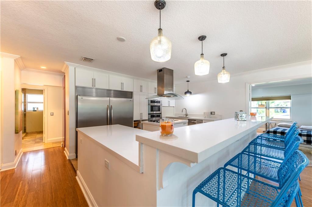 This open floor plan 3/2 home is perfectly located 1 home off Lake Santa Barbara. You are surrounded by multi million dollar homes. You get a glimpse of the ICW and fabulous views. This updated home offers a custom modern kitchen, high-end stainless appliances & breakfast bar, marble & real wood flooring throughout, updated baths, & impact windows/doors T/O. The home offers lots of charm & sense of class & style. Lovely corner w/lots of space to create your tropical private pool oasis(variance approval in the works) and just steps to the sand. A full set of plans for a 4th bedroom & bath comes with the sale. Walk or take your golf cart to all shopping, entertainment, golfing & miles of inviting white sandy beaches. Located in the multi million$ CRA redevelopment project. Ask for details