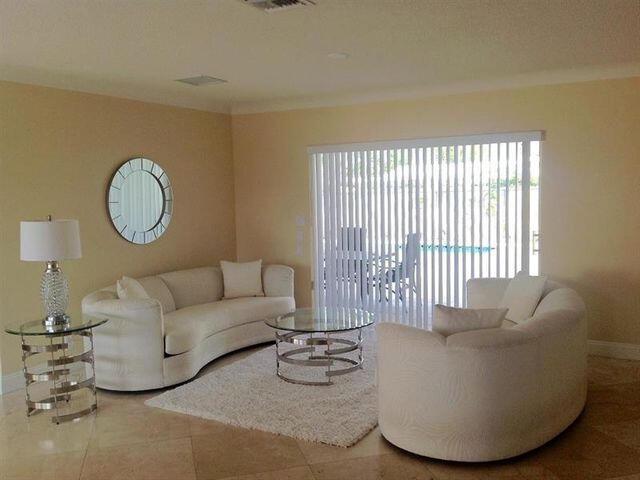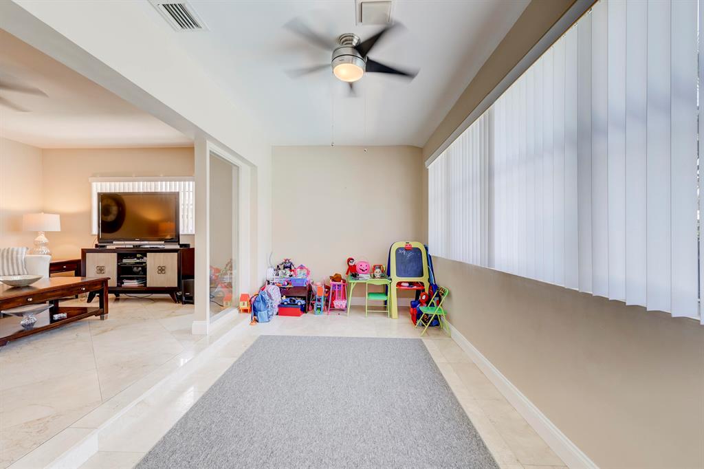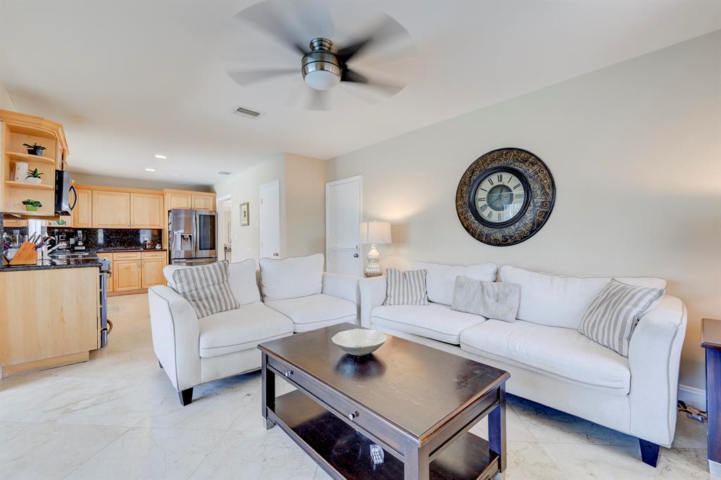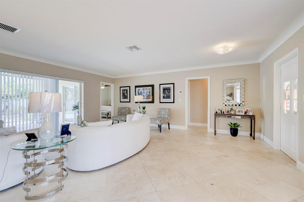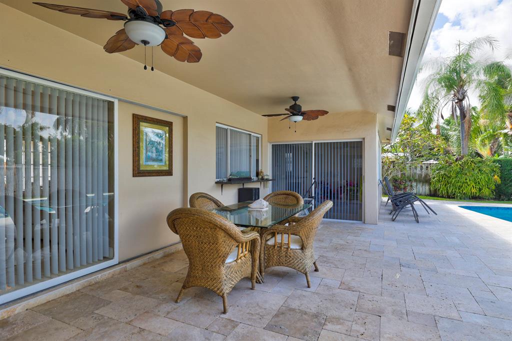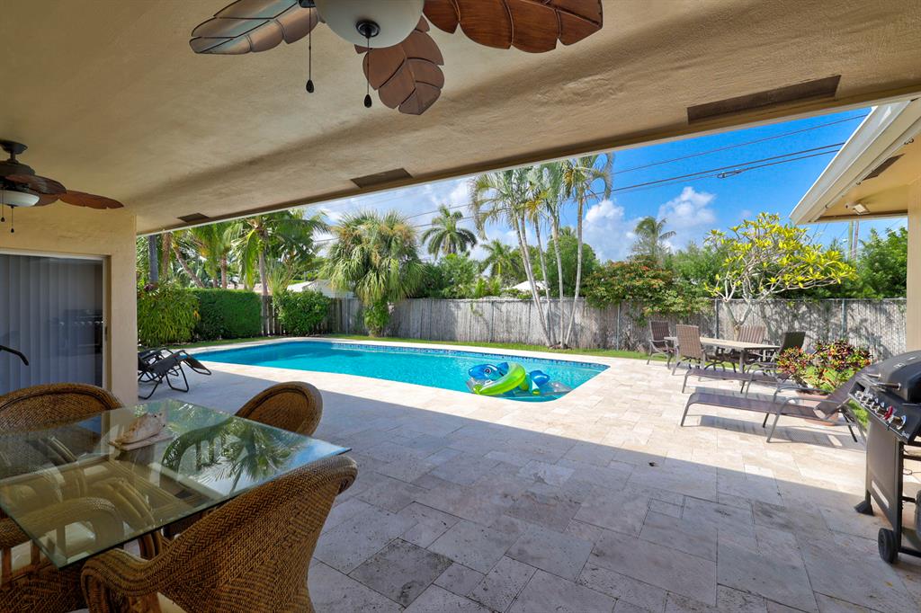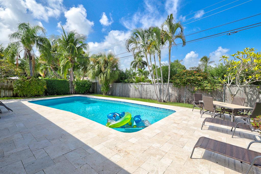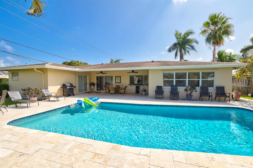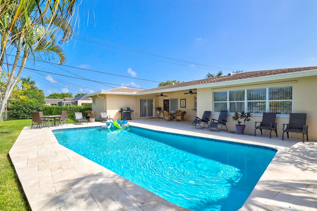 This beautiful updated well-maintained 3/2 pool home with a bonus room to use as an office, playroom or 4th bedroom is situated in a desirable area on a quiet low traffic street. Enjoy the ambiance of the front of this home with little gated front patio and a huge circle drive that fits 7 cars, or boat, RV, jet skis, etc and 2 car garage. The features include an awesome 1500' marble paver patio with covered area. Refinished diamond brite pool with new glass tile. Great for entertaining and BBQ's. Nice lawn area is all privacy fenced. The rooms are freshly painted with ceiling fans in every room. Granite kitchen stainless appliances. Conveniently located less than 2 miles to beaches & nearby shops, grocery, and restaurants. NO HOA, no monthly fees, NO Restrictions.