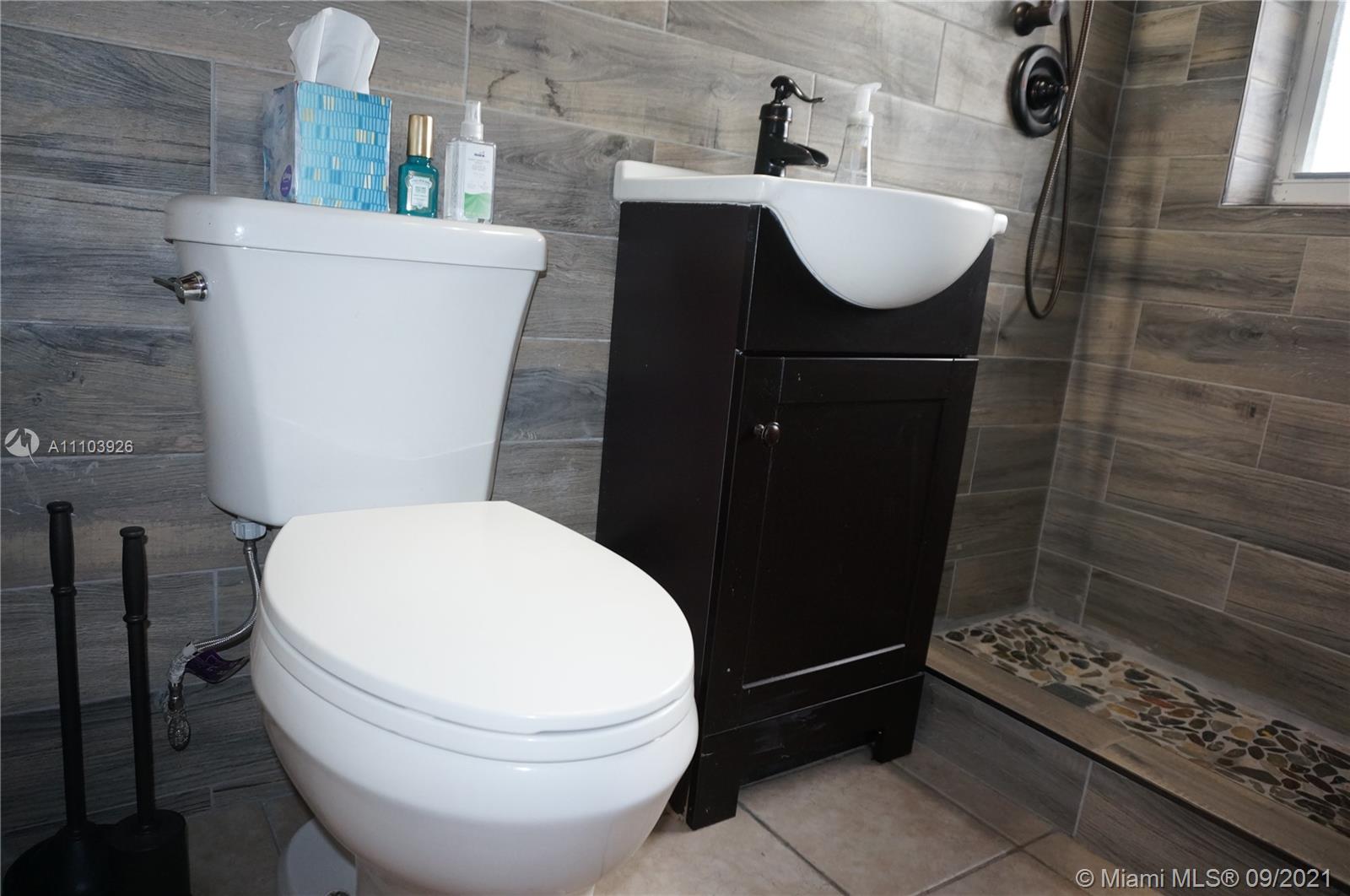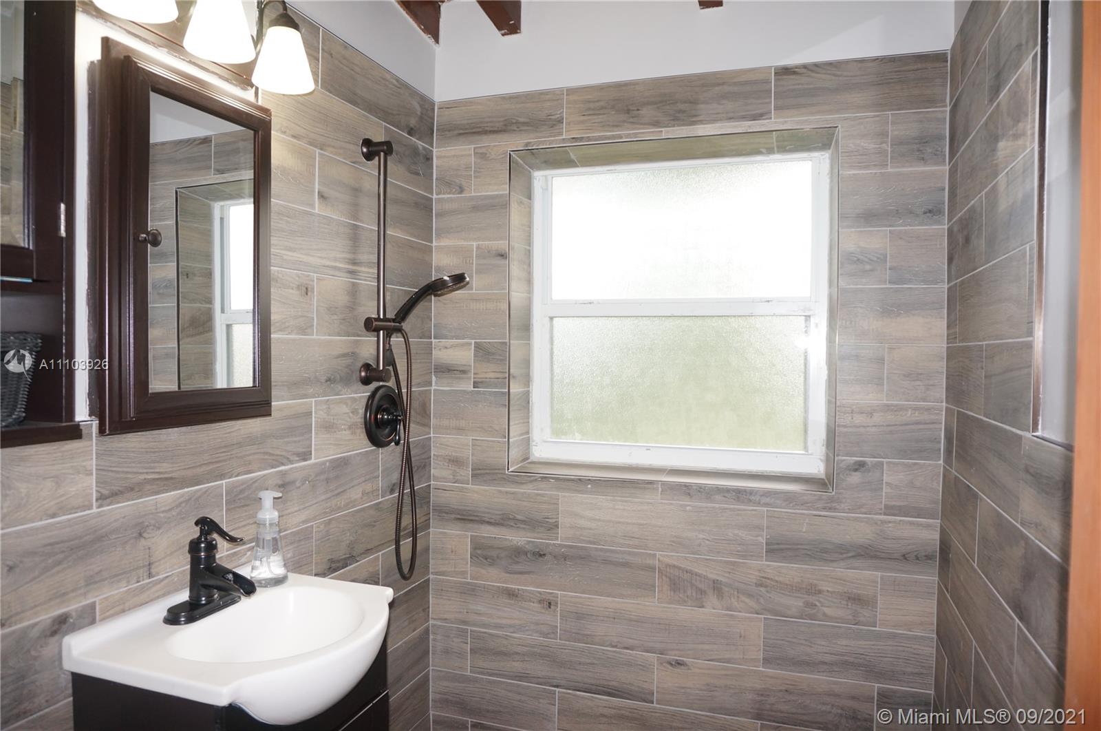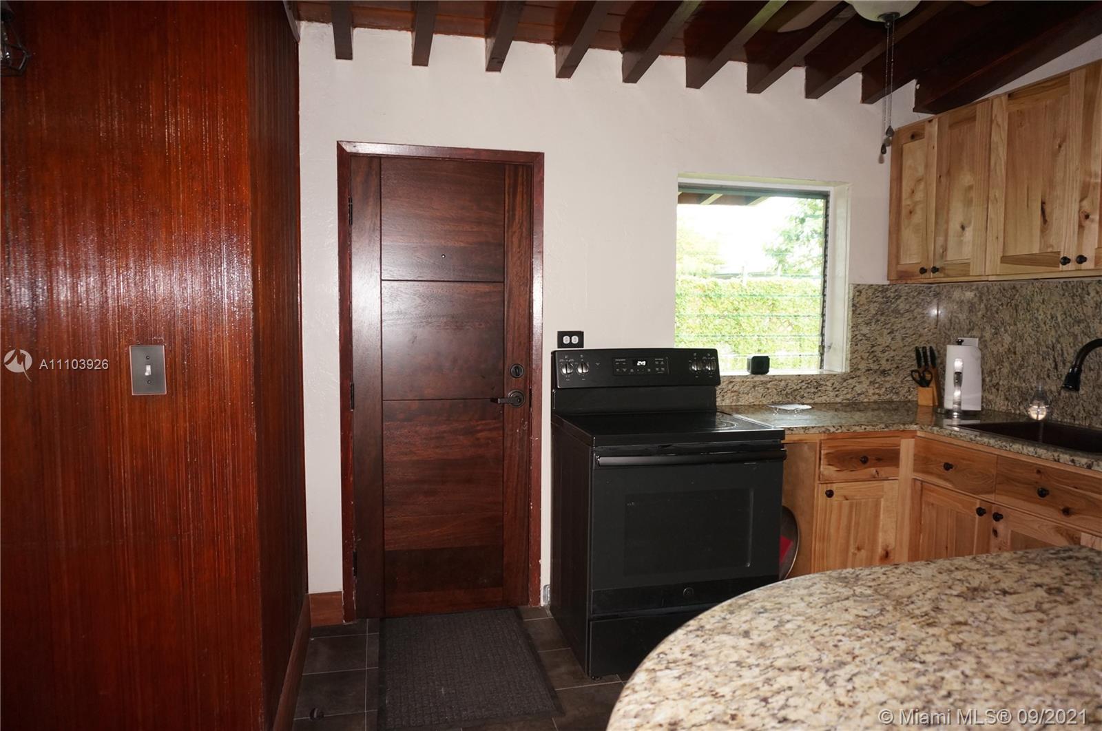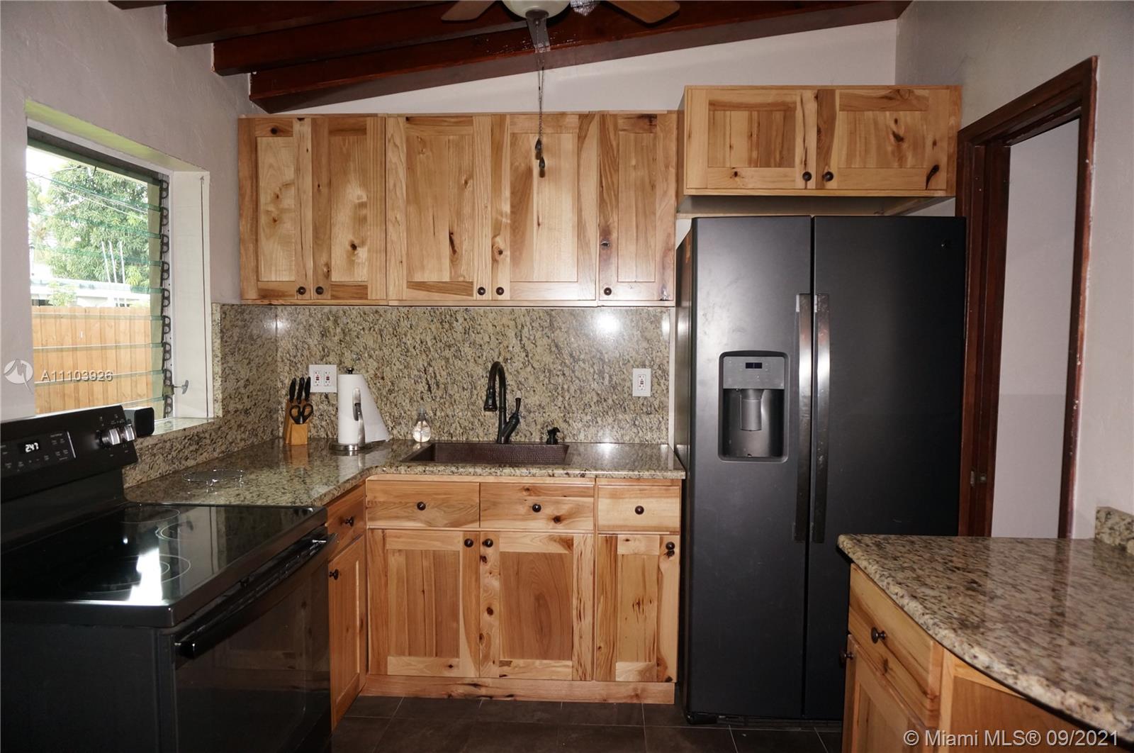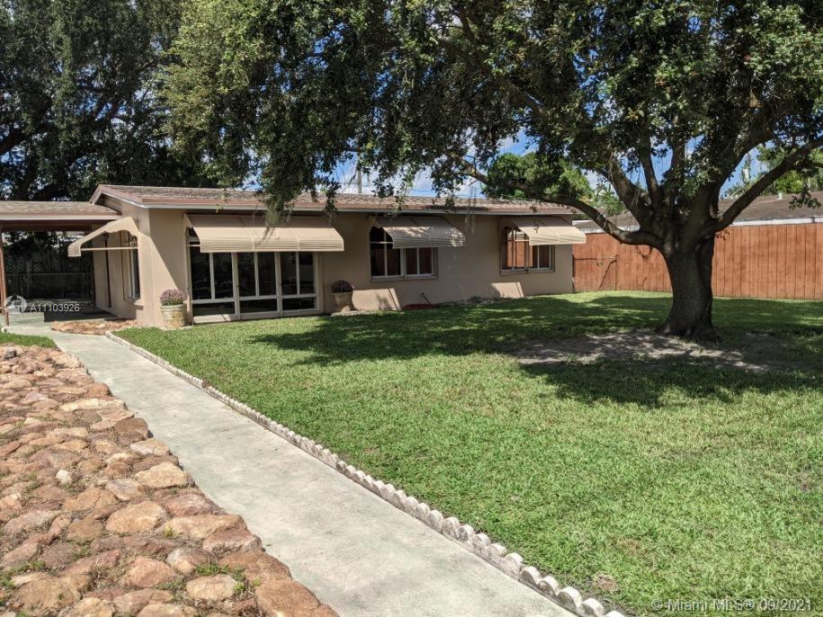 Great 3 bedroom home in Central Hialeah, fully fenced, and landscaped for privacy, home sits back on property, providing a large front yard. Park in the driveway, carport or on the street. Updated kitchen, floors, bathroom, but still maintains mid century character with lovely stained wood ceilings and entry wall. 3 nice sized bedrooms with new interior doors, and hardware. Vaulted ceilings provide a more spacious atmosphere. Walk into a foyer, that separates the living/dining areas. Kitchen boasts beautiful natural wood cabinets, large copper sink, granite countertops with snack bar, and a separate pantry. Back door to large wood privacy fenced back yard with enclosed laundry with washer and dryer,paver patio, room for bbq's and entertaining. Newer roof, electrical panel, w/h, a/c 2020