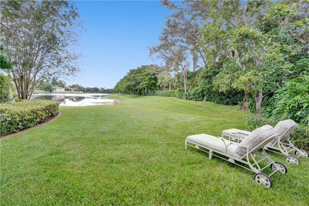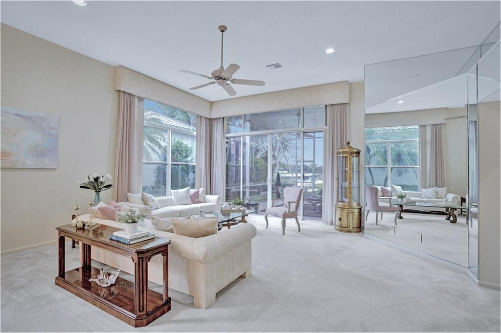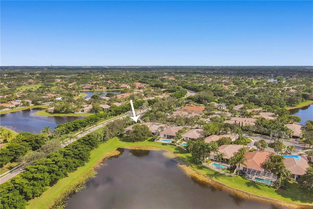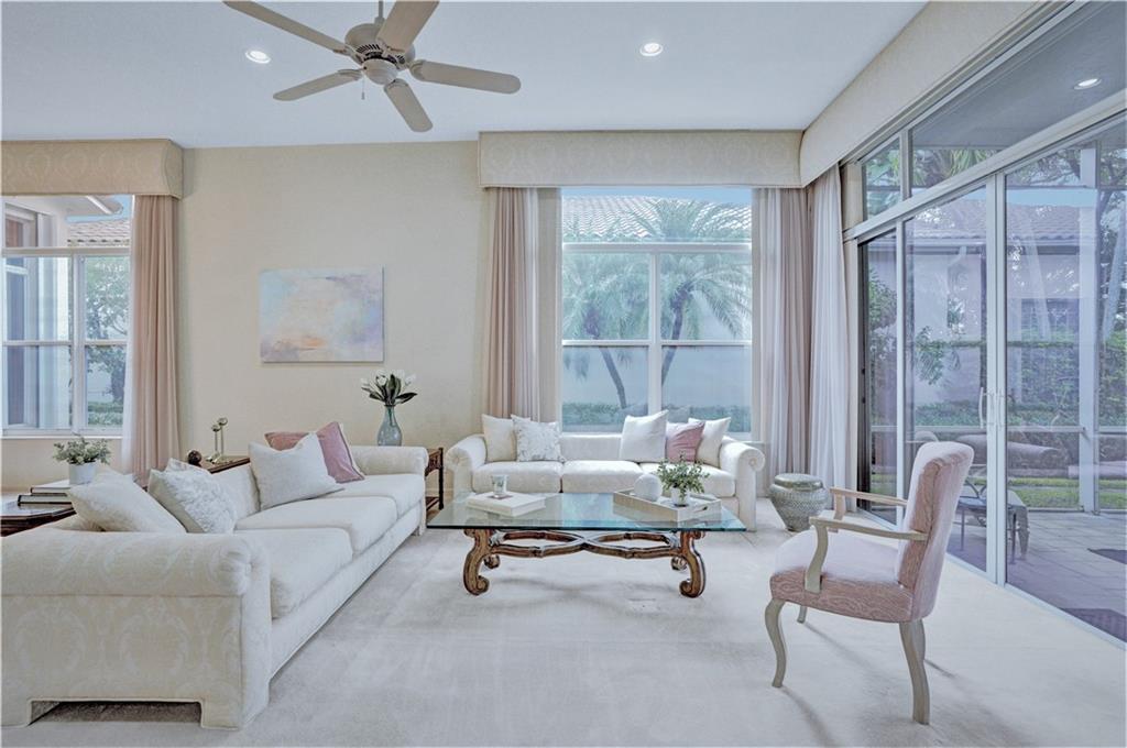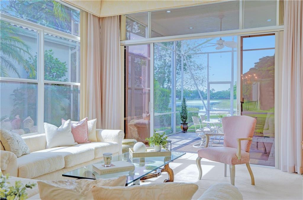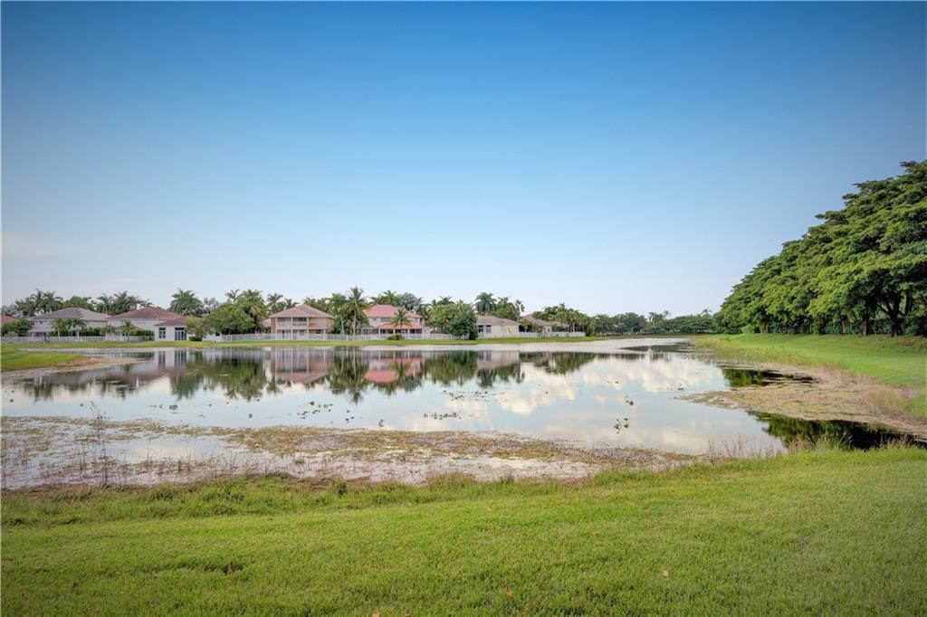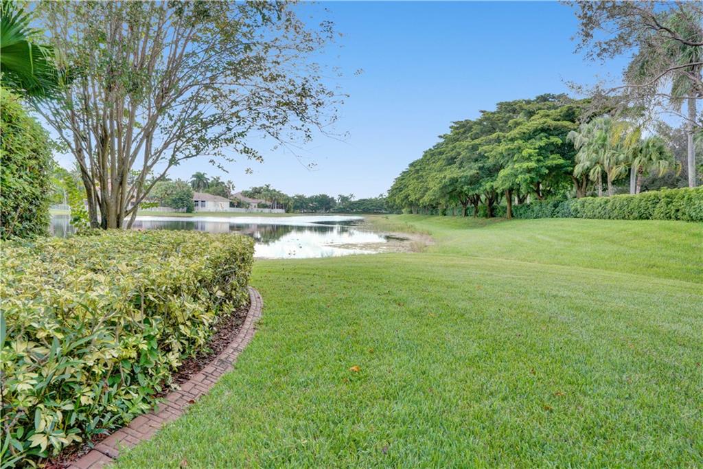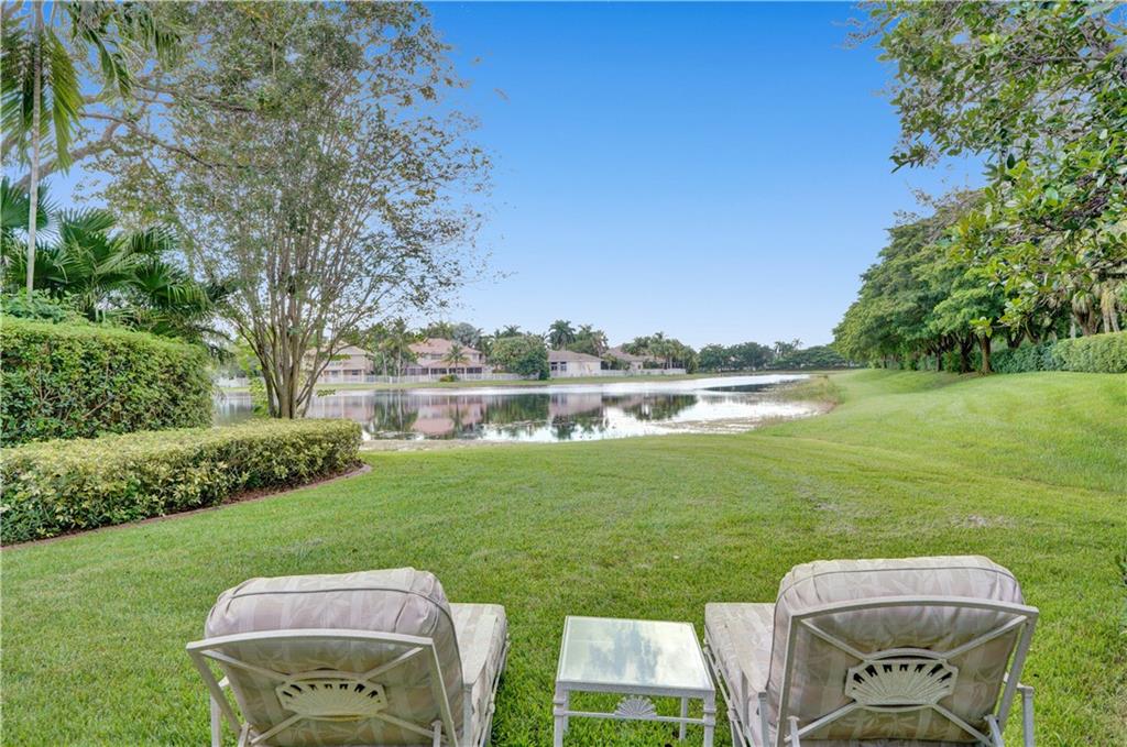 Nestled against a lush green berm on almost quarter acre with an expansive lawn that extends to the waters edge, this meticulously maintained 3/3/2CG single story LAKEFRONT home offers a maintenance-free lifestyle. Soothing shades of cream & soft pink tones exude a comfortable calm elegance. High ceilings & walls of glass create a light, bright, airy feel to the spacious great room, w/glass doors that open to the huge covered tiled patio, screened for year-round enjoyment! Huge master suite w/double walk-in custom closets & large master bath; 2nd Bed w/bathroom ensuite; 3rd Bed used as den. White-on-white kitchen w/double ovens & breakfast area. Designer chandeliers, new LED lights, accordions, plenty storage. Room for pool; golf up the road. Welcome to Weston Hills country club lifestyle!