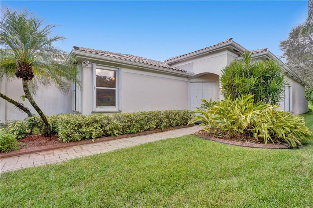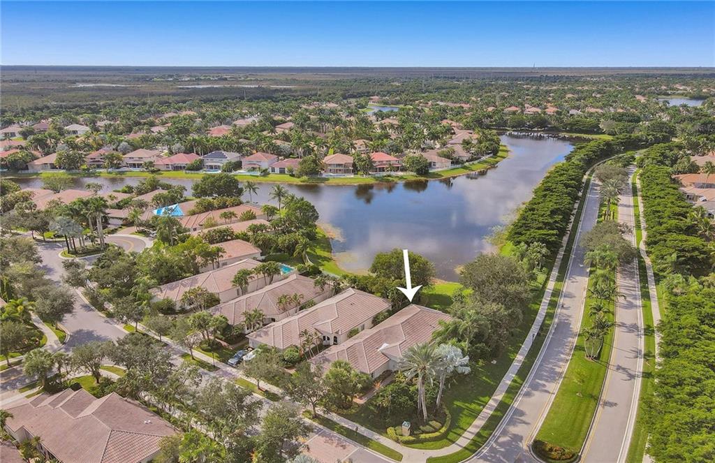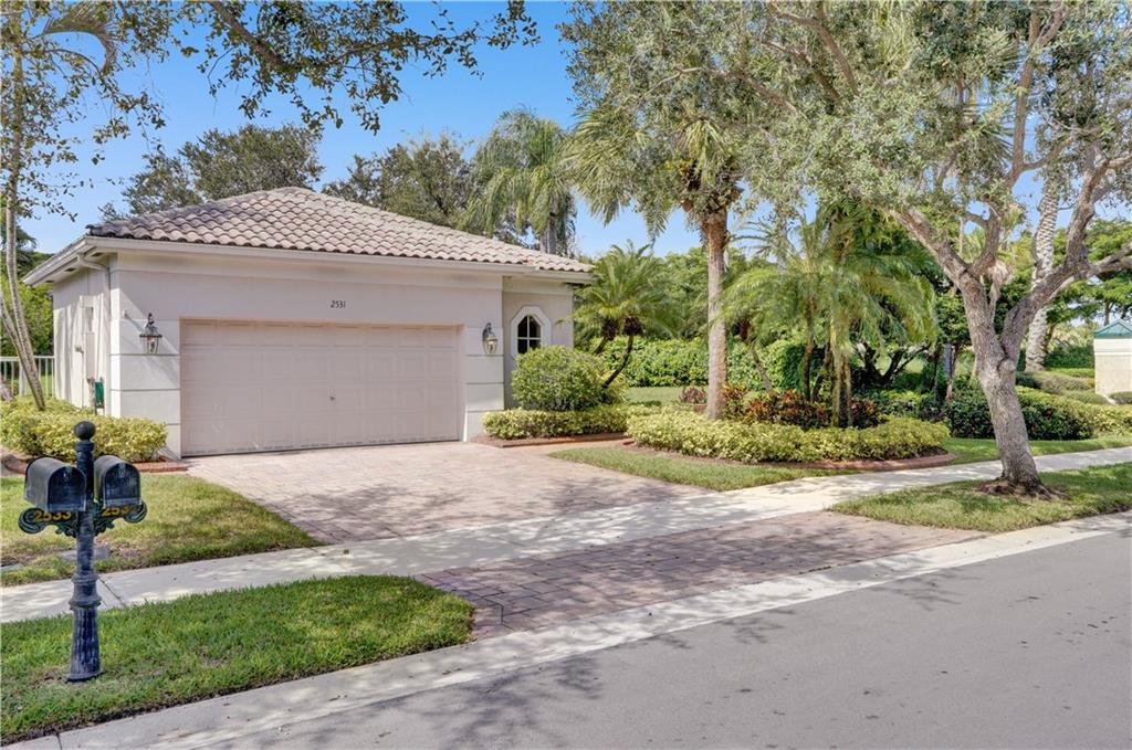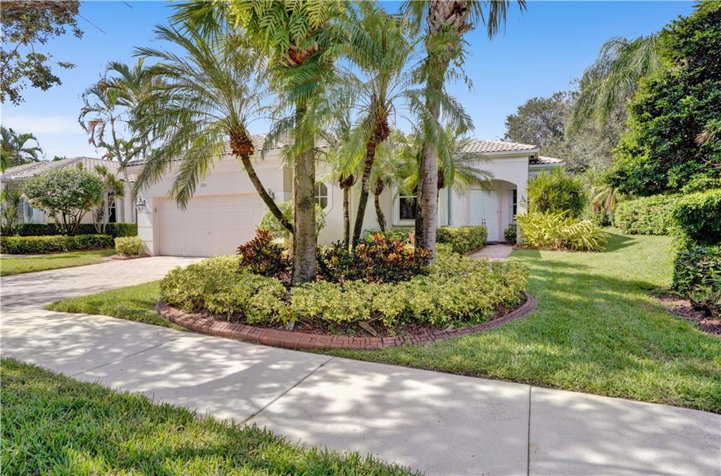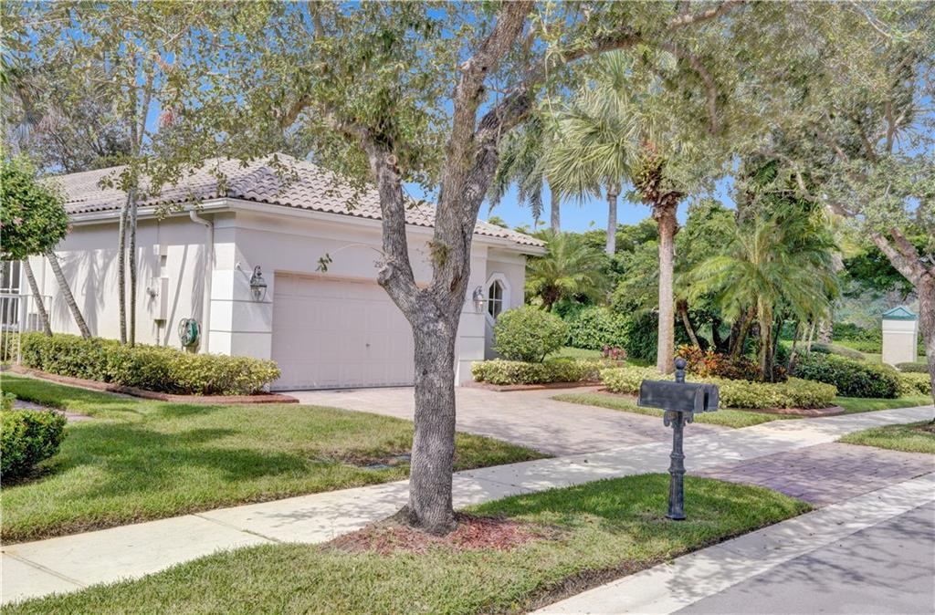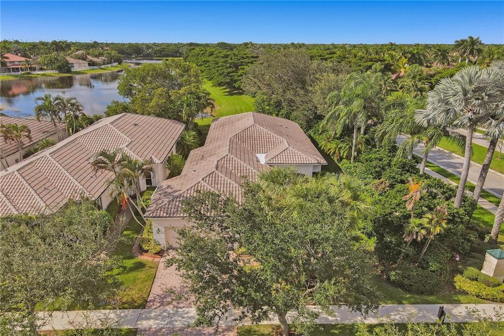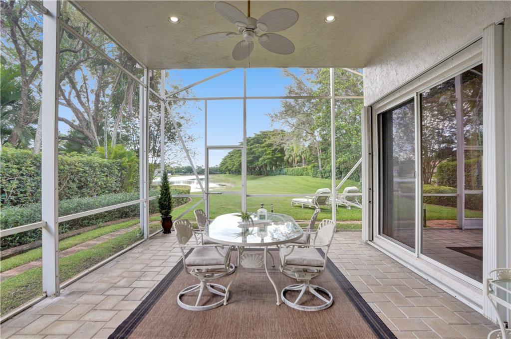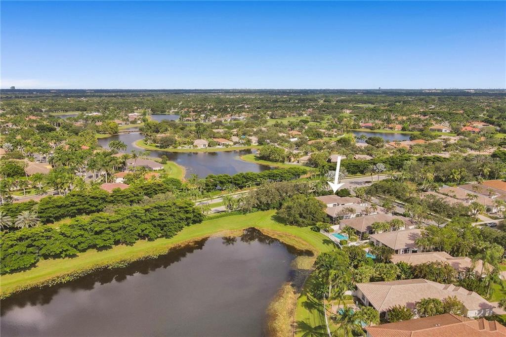 Nestled against a lush green berm on almost quarter acre with an expansive lawn that extends to the waters edge, this meticulously maintained 3/3/2CG single story LAKEFRONT home offers a maintenance-free lifestyle. Soothing shades of cream & soft pink tones exude a comfortable calm elegance. High ceilings & walls of glass create a light, bright, airy feel to the spacious great room, w/glass doors that open to the huge covered tiled patio, screened for year-round enjoyment! Huge master suite w/double walk-in custom closets & large master bath; 2nd Bed w/bathroom ensuite; 3rd Bed used as den. White-on-white kitchen w/double ovens & breakfast area. Designer chandeliers, new LED lights, accordions, plenty storage. Room for pool; golf up the road. Welcome to Weston Hills country club lifestyle!