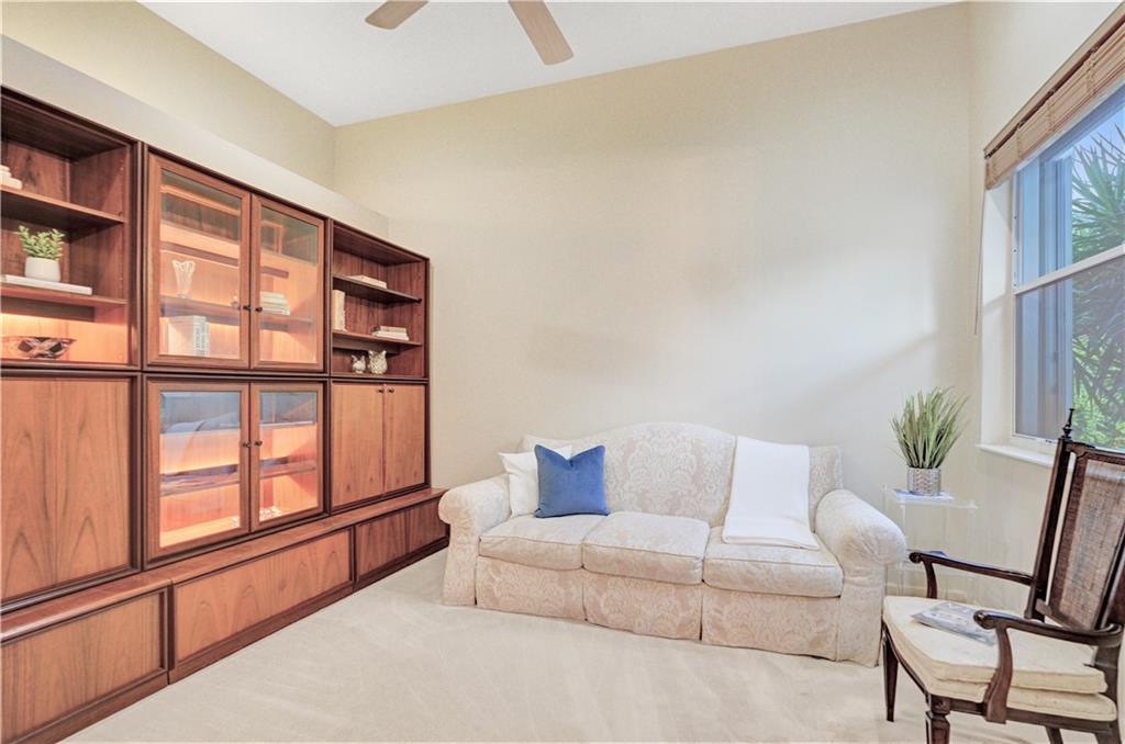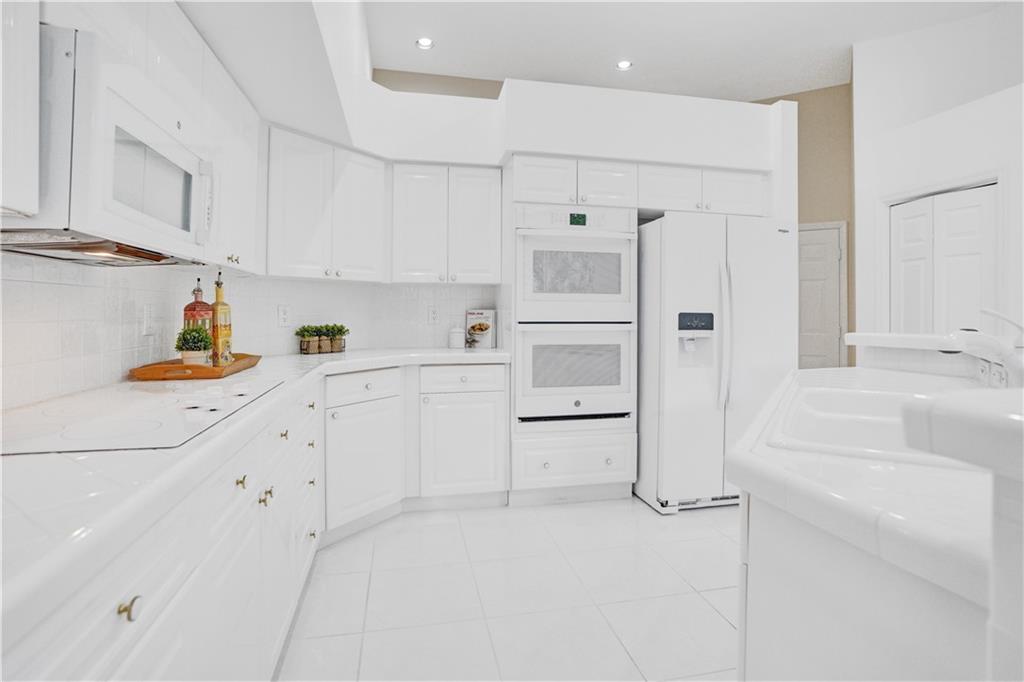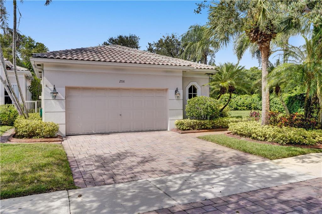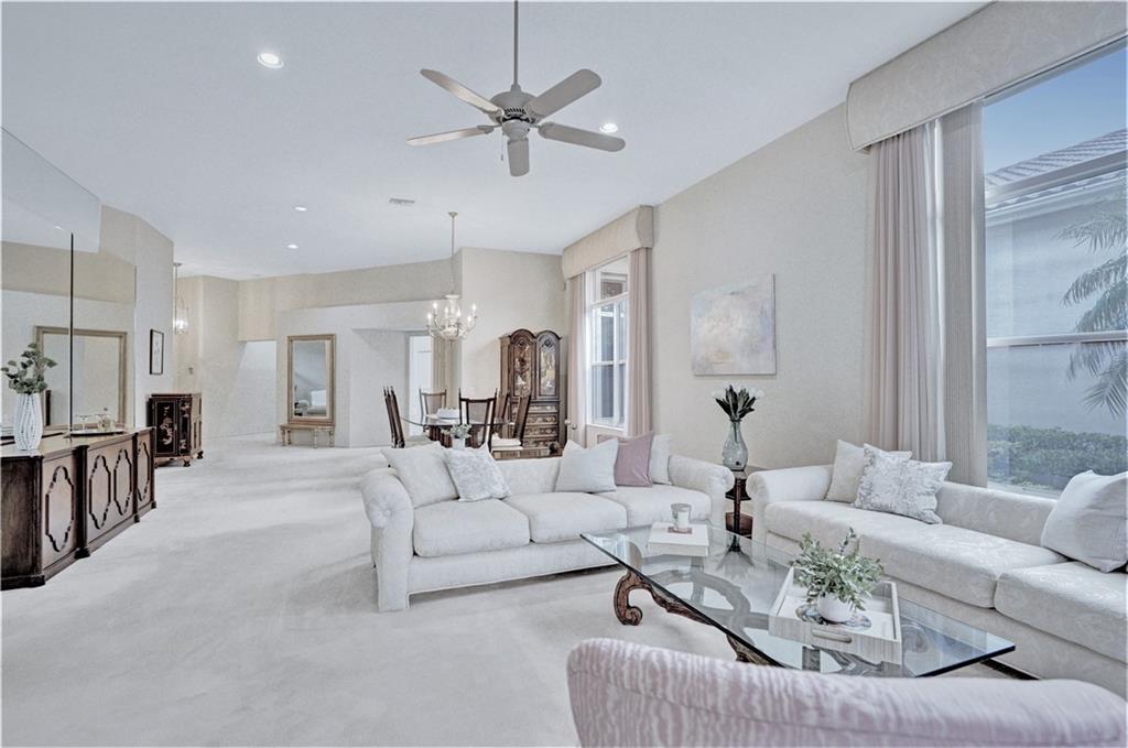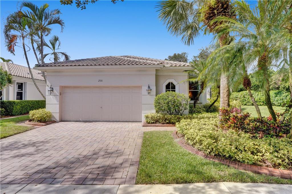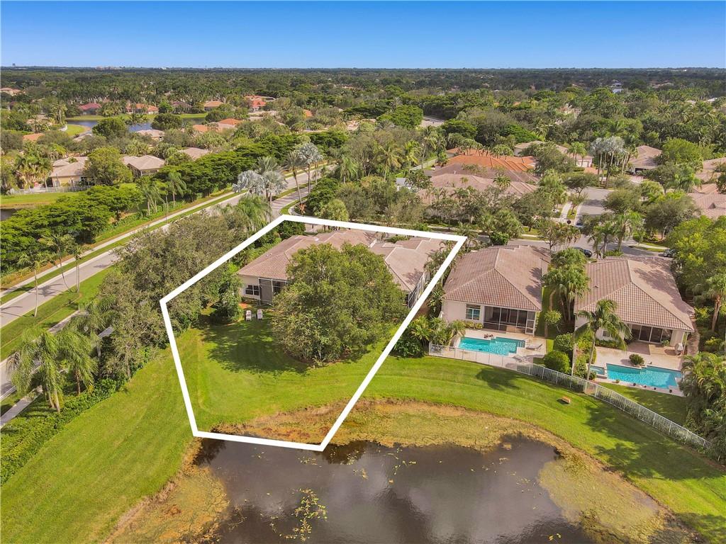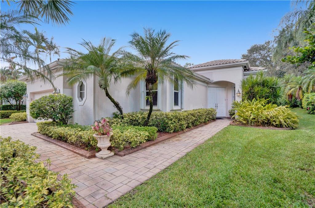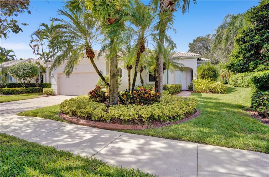 Nestled against a lush green berm on almost quarter acre with an expansive lawn that extends to the waters edge, this meticulously maintained 3/3/2CG single story LAKEFRONT home offers a maintenance-free lifestyle. Soothing shades of cream & soft pink tones exude a comfortable calm elegance. High ceilings & walls of glass create a light, bright, airy feel to the spacious great room, w/glass doors that open to the huge covered tiled patio, screened for year-round enjoyment! Huge master suite w/double walk-in custom closets & large master bath; 2nd Bed w/bathroom ensuite; 3rd Bed used as den. White-on-white kitchen w/double ovens & breakfast area. Designer chandeliers, new LED lights, accordions, plenty storage. Room for pool; golf up the road. Welcome to Weston Hills country club lifestyle!