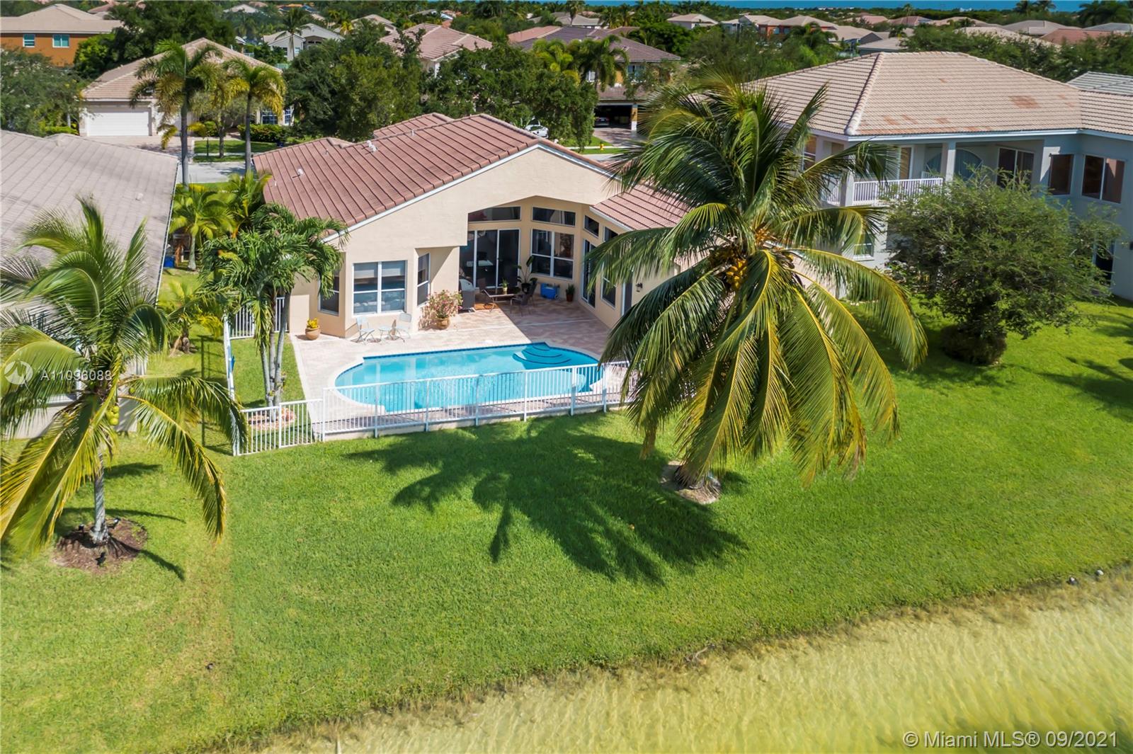 Welcome to the Sofia model, a sought after one-story home in the stunning resort community- Sunset Lakes. Upon entering, you're embraced by the sunlight shining throughout, center of the home features an elegant living room w/patio doors leading to the patio & pool area. Walking thru you'll notice dramatic coffered ceilings, inviting arched doorways w tasteful architectural accents. A warm inviting upgraded kitchen w adjacent breakfast nook are equipped w/extra storage, double oven, custom wood cabinetry, & granite counters. A true 5 bedroom w/a triple split plan, gives everyone private space to enjoy. Master suite is located on the west side of the home, w stunning pool & lake views. The custom oversized pool was recently resurface. Freshly painted exterior. This home is not one to miss!