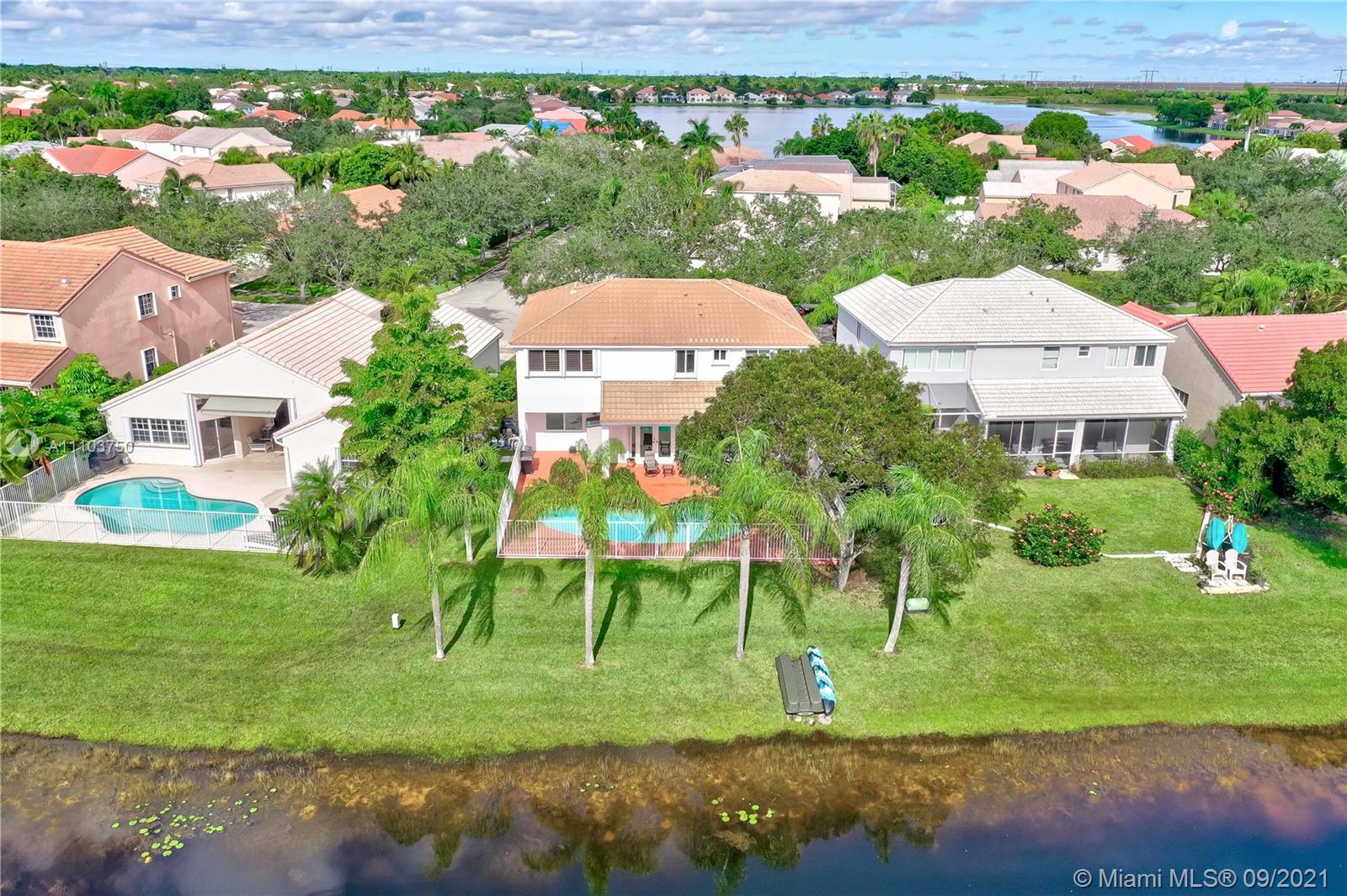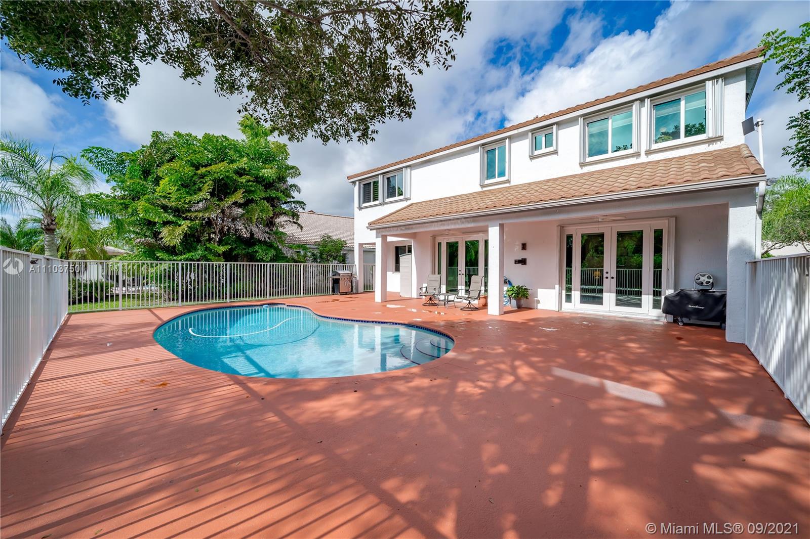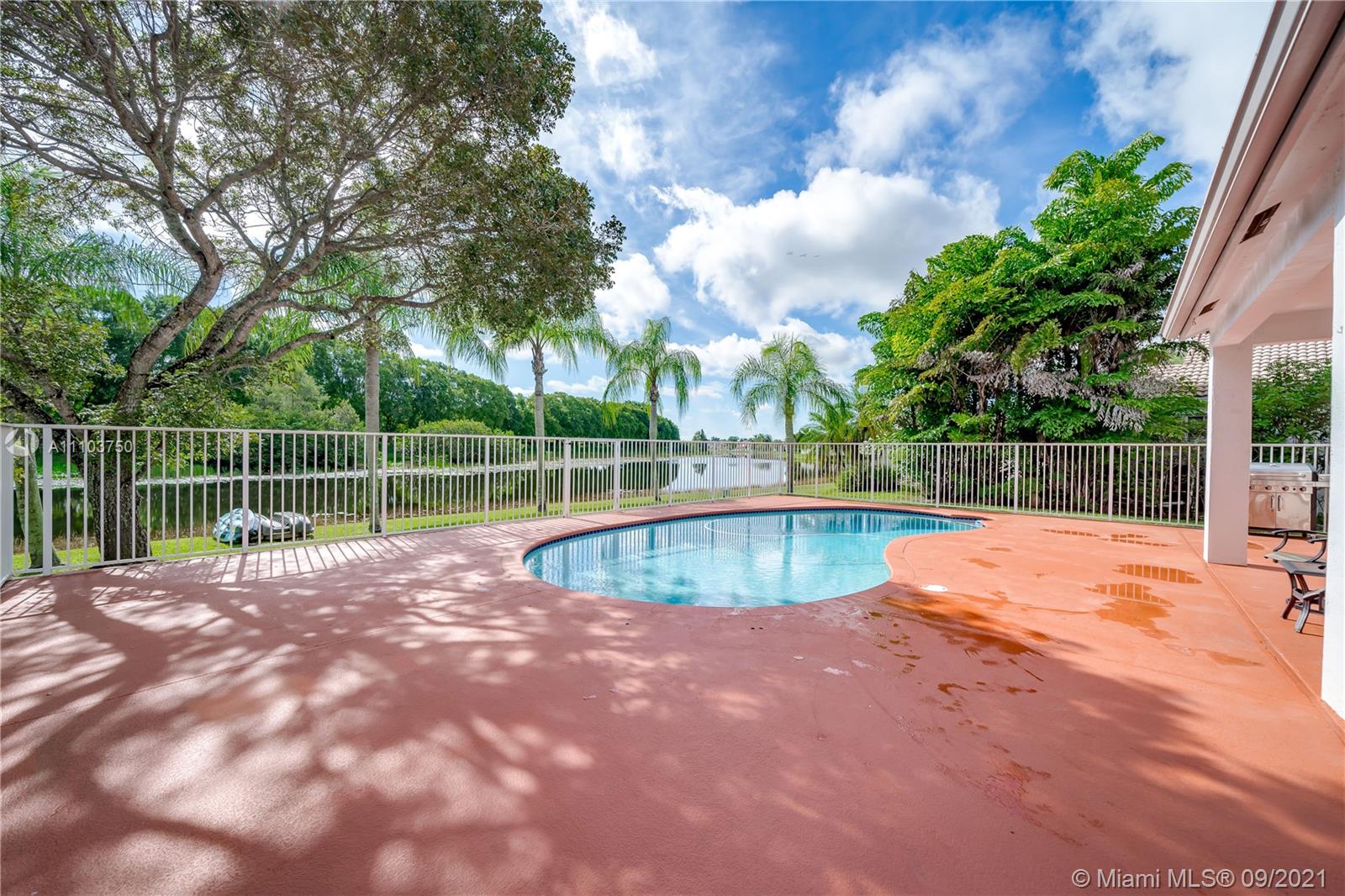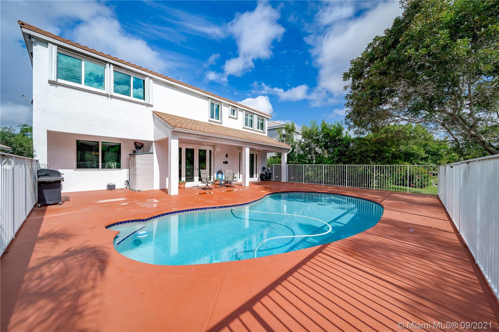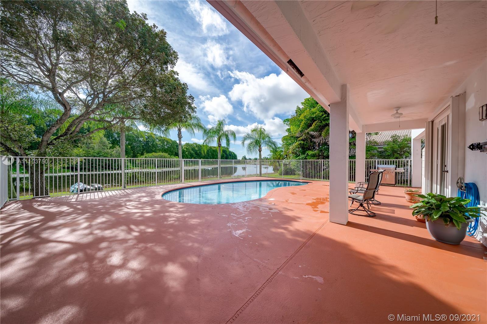 Gorgeous 5/3 plus den, pool & lakefront home located on a cul-de-sac in Guard gated community of The Falls! Impact glass windows & doors installed in 2020! Metal roof 2006. Tile flooring laid diagonally on first floor main living area. Deep baseboards, chair rail, & crown molding throughout. Bedroom & full bath on first floor. Remodeled kitchen features wood cabinetry, granite countertops & new appliances w/induction & convection stove/oven. Master bedroom has two walk in closets/ master bath with double vanity, soaking tub & separate shower w/steam & rain shower head. Additional bedrooms upstairs along w/large den, perfect for a playroom, office or movie room! AC 2016. Water heater 2015. Heated pool. A+ Rated schools. Community features pool, children's playground, full basketball court.