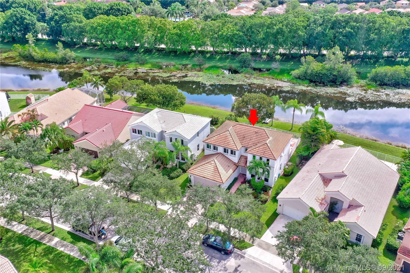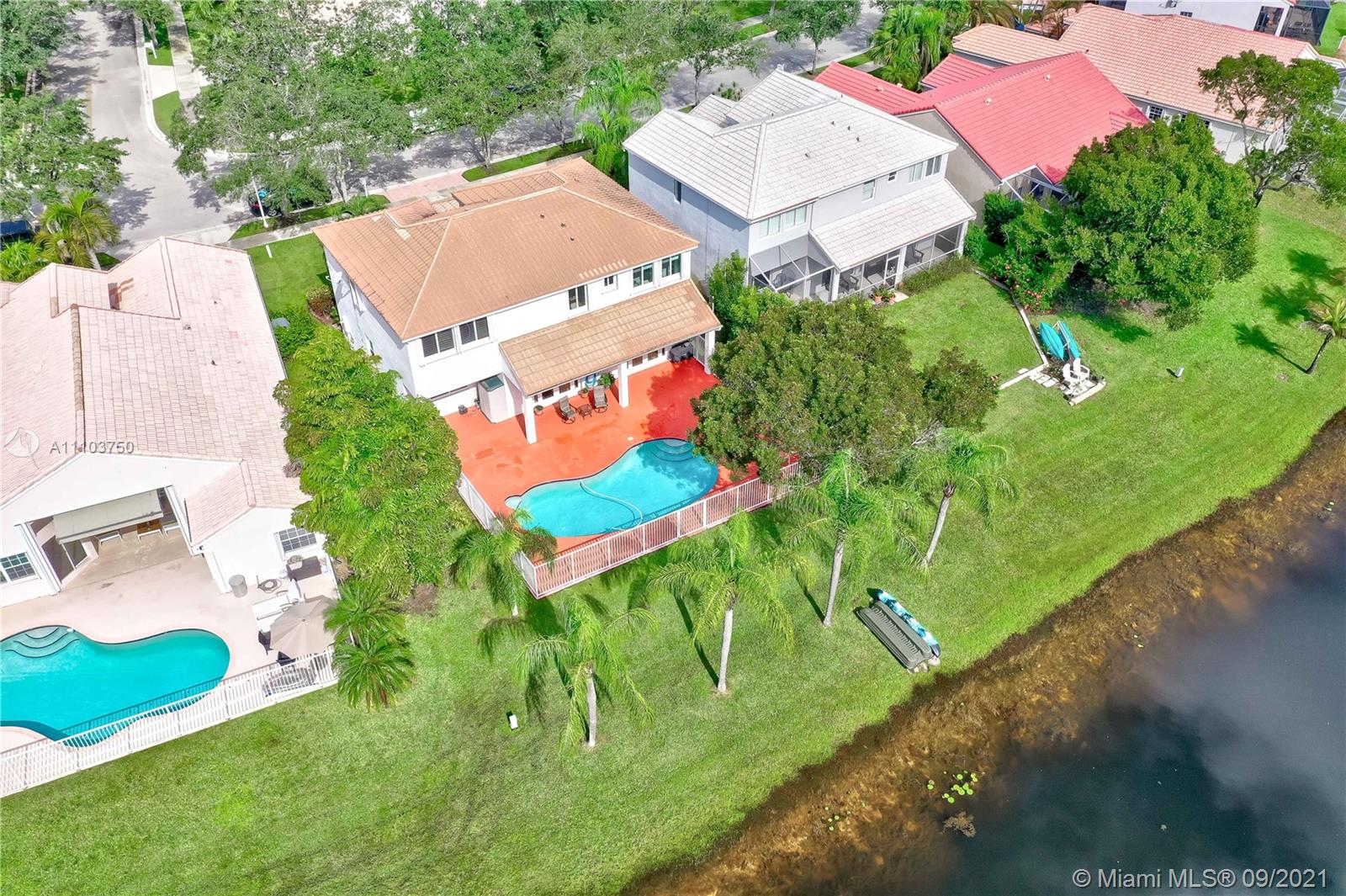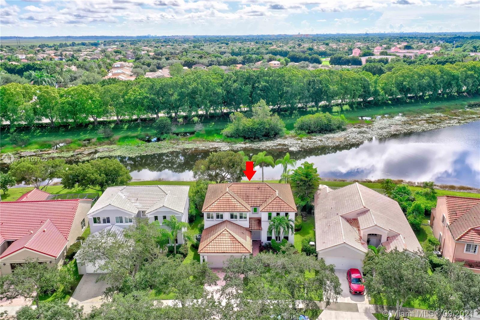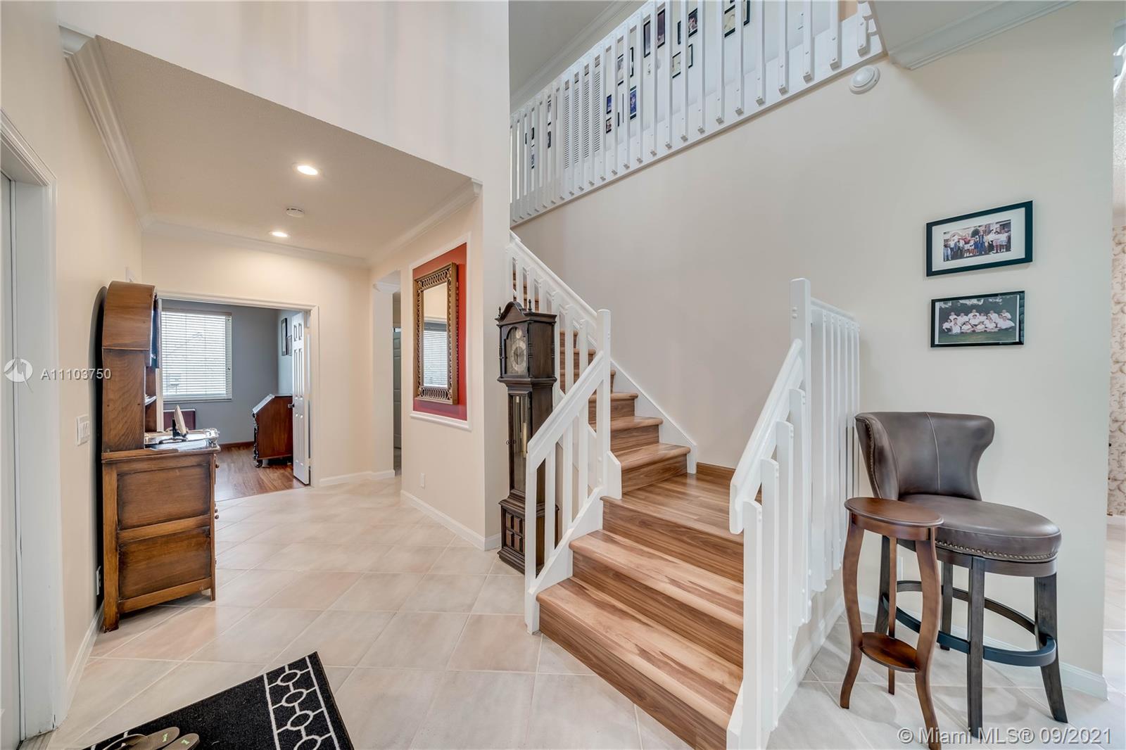 Gorgeous 5/3 plus den, pool & lakefront home located on a cul-de-sac in Guard gated community of The Falls! Impact glass windows & doors installed in 2020! Metal roof 2006. Tile flooring laid diagonally on first floor main living area. Deep baseboards, chair rail, & crown molding throughout. Bedroom & full bath on first floor. Remodeled kitchen features wood cabinetry, granite countertops & new appliances w/induction & convection stove/oven. Master bedroom has two walk in closets/ master bath with double vanity, soaking tub & separate shower w/steam & rain shower head. Additional bedrooms upstairs along w/large den, perfect for a playroom, office or movie room! AC 2016. Water heater 2015. Heated pool. A+ Rated schools. Community features pool, children's playground, full basketball court.