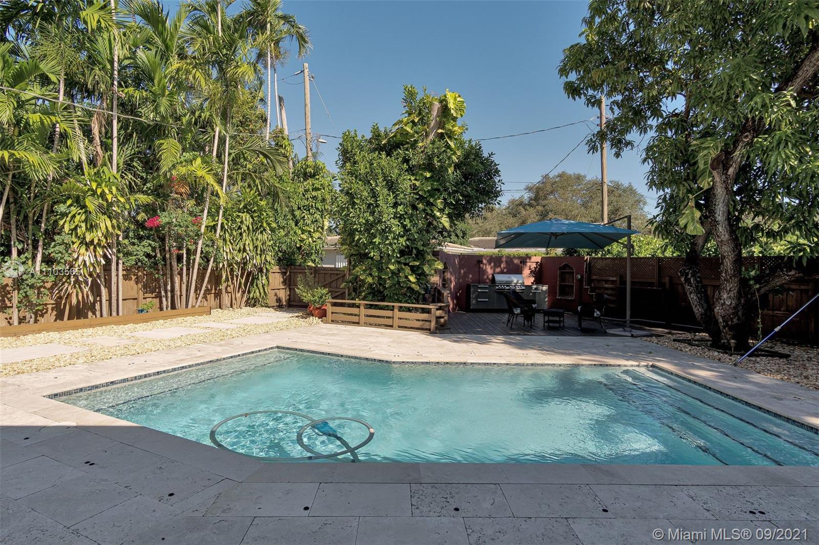 MIAMI SHORES OASIS, COMPLETELY WALLED AND FENCED.....LARGE LOT, VERY PRIVATE. BEAUTIFUL POOL AND OUTSIDE ENTERTAINING AREA, VERY TROPICAL. 3 BEDS AND 2 FULL BATHS, ATTACHED ONE CAR GARAGE. TOTALLY UPDATED, TOP TO BOTTOM. COVERED FRONT PORCH AREA, GREAT FOR RELAXING. SUPER OPEN FLOORPLAN WITH GREAT VIEWS OF THE GARDEN AND POOL AREA. ORIGINAL WOOD-BURNING FIREPLACE IN THE LIVING ROOM. BIG UPDATED AND OPEN KITCHEN WITH EATING BAR AND ROOM FOR STOOLS. GREAT BEDROOM SPLIT. MASTER BEDROOM IS GIGANTIC WITH TWO WALK-IN CLOSETS AND A SPA-LIKE BATH. MASTER BEDROOM HAS ACCESS TO THE POOL. NEWER ROOF, PLUMBING, AND ELECTRIC, A/C. IMPACT WINDOWS, SECURITY SYSTEM, IRRIGATION SYSTEM. VERY CONVENIENT LOCATION, SUPER CLOSE TO EVERYTHING.