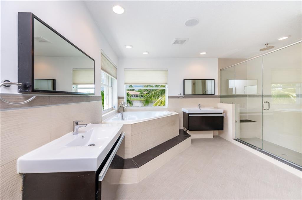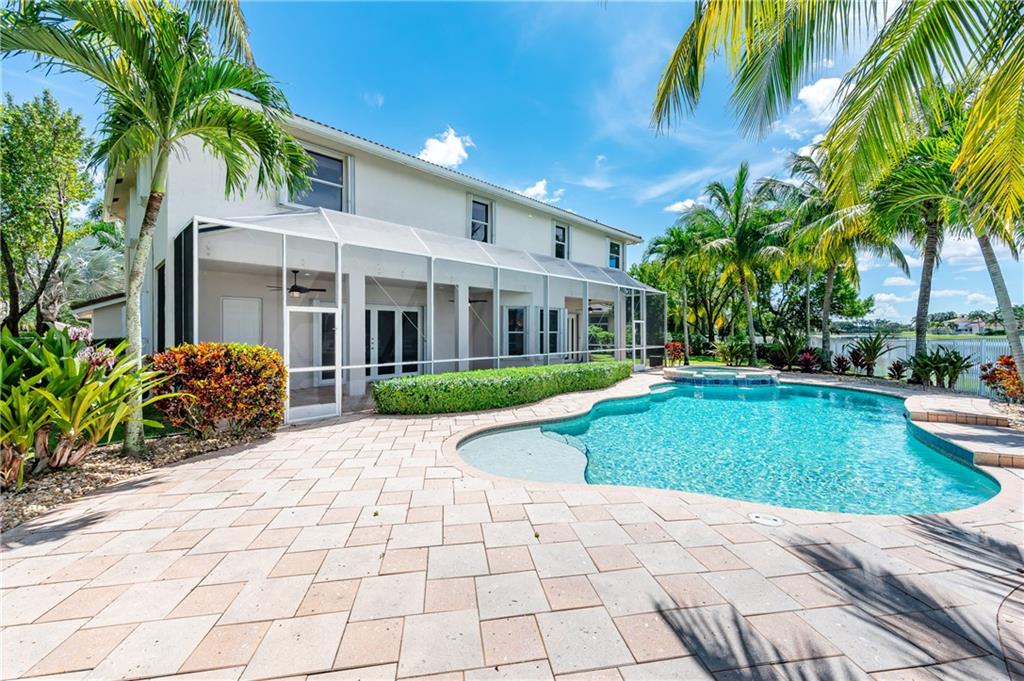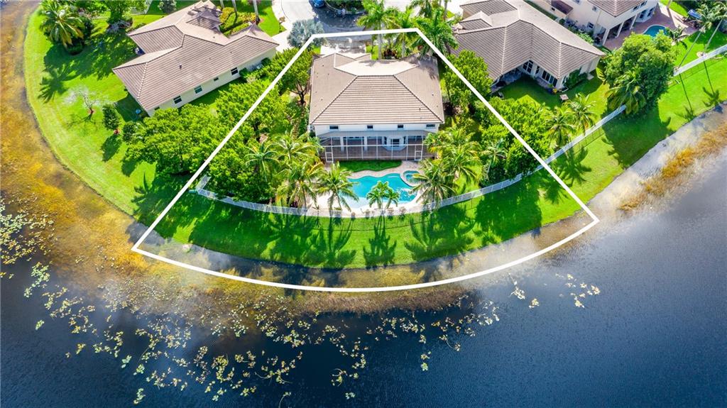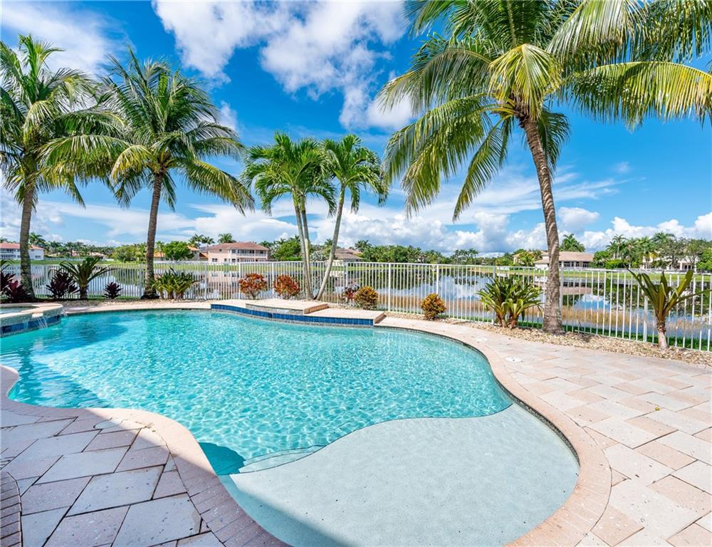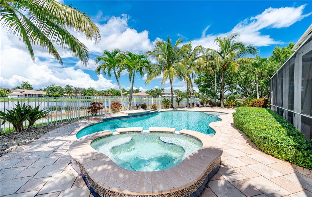 Situated as a large corner lot on the lake with the best view in Savanna, this luxurious location includes a spacious tropical designed garden, large covered patio, pool, and heated Jacuzzi, complimenting the west facing lake view and all its spectacular sunsets, perfect for outdoor entertainment. This house has been meticulously maintained and updated, located in a quiet cul-de-sac. Upon entering the two story house, you will be greeted by spectacular views and natural light flowing from the oversized windows and high ceilings. This home offers a modern floor plan; large living room with an open kitchen to family room and dining room. The lower level offers a guest bedroom with a complete cabana bathroom and laundry room. A truly hidden gem! Move in and enjoy.