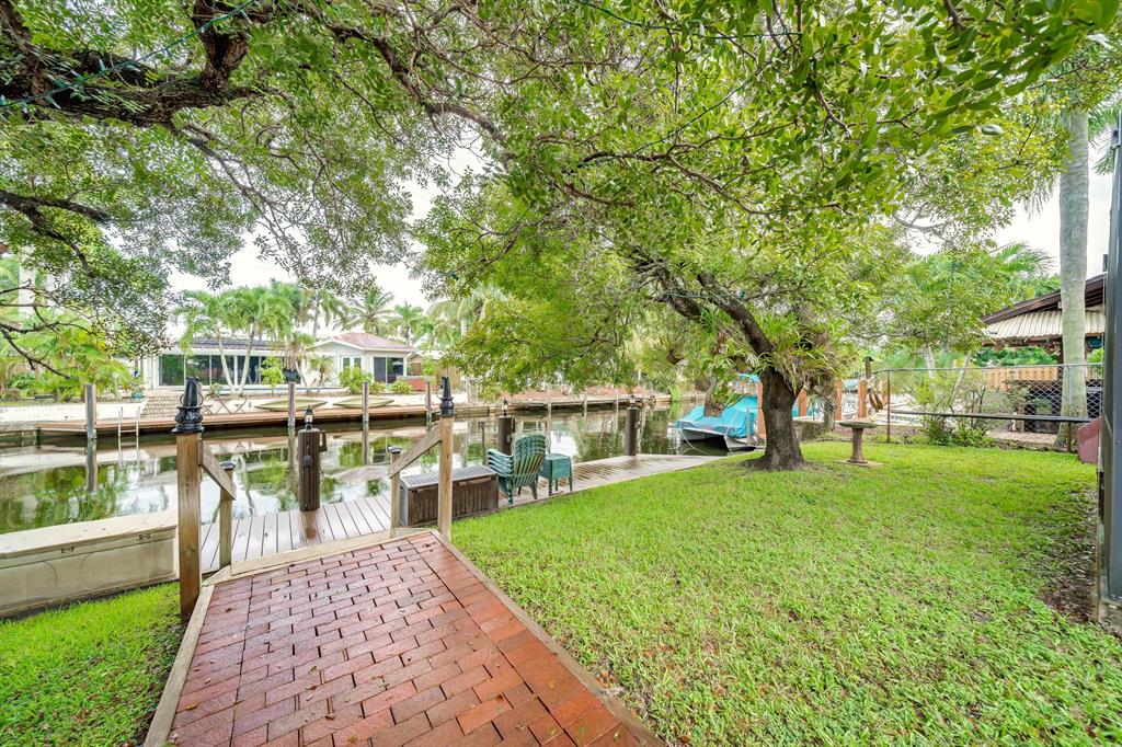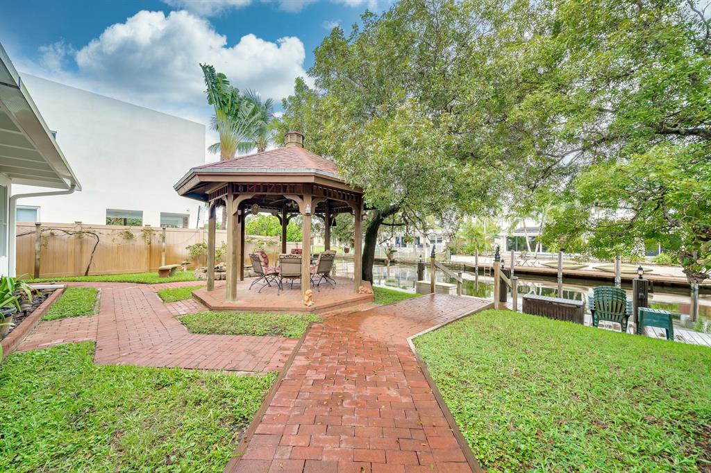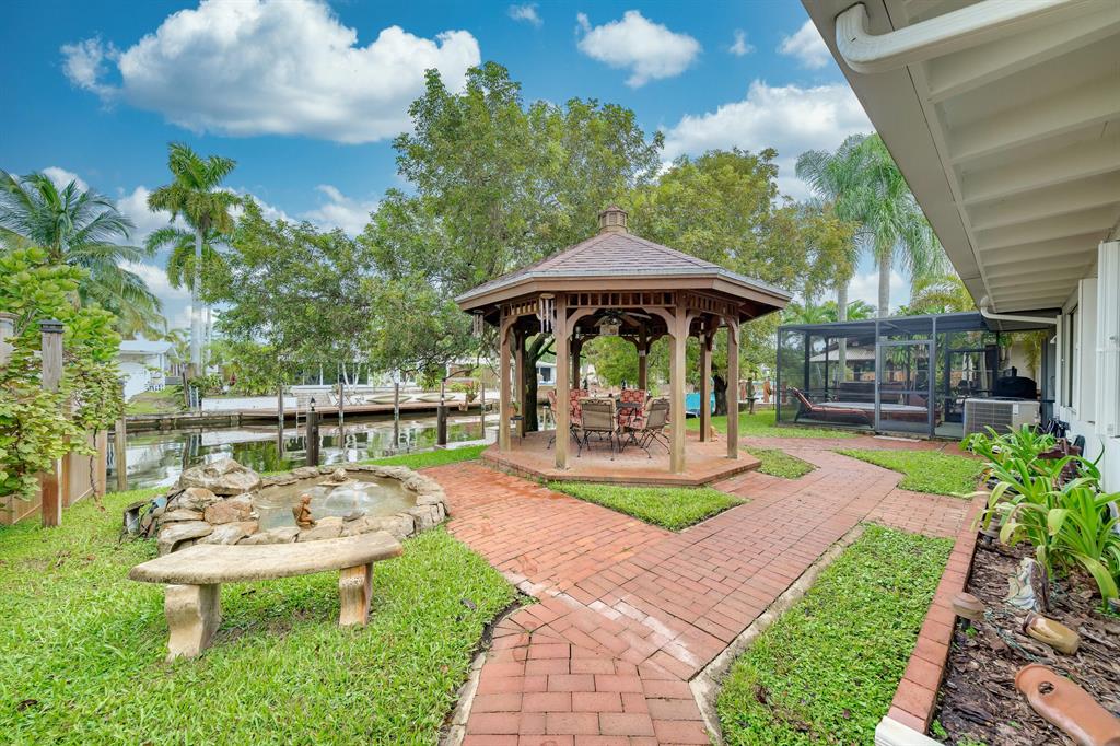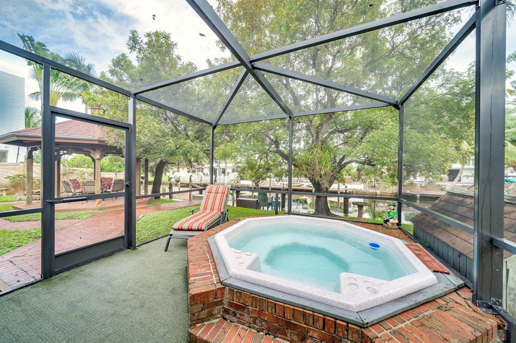This charming and meticulously maintained 3/2 home is on a deep water ocean access canal with no fixed bridges. This property has the ideal backyard exposure facing east. Keep your boat parked in your backyard on a new 45 foot Trex composite dock with electric that can hold up to a 60 foot boat. Enjoy your breakfast or evenings underneath the Gazebo overlooking the water or sit in your roofed screened patio or even take a dip in the spa. This stunning property offers an open floor plan with cathedral beamed ceilings, wood burning brick fireplace; upgraded kitchen with solid cherry wood cabinets with maple interior shelving and granite counter tops. The master bathroom has an upgraded walk in shower with beautiful Italian porcelain tile, double shower fixtures on each end and a custom bench