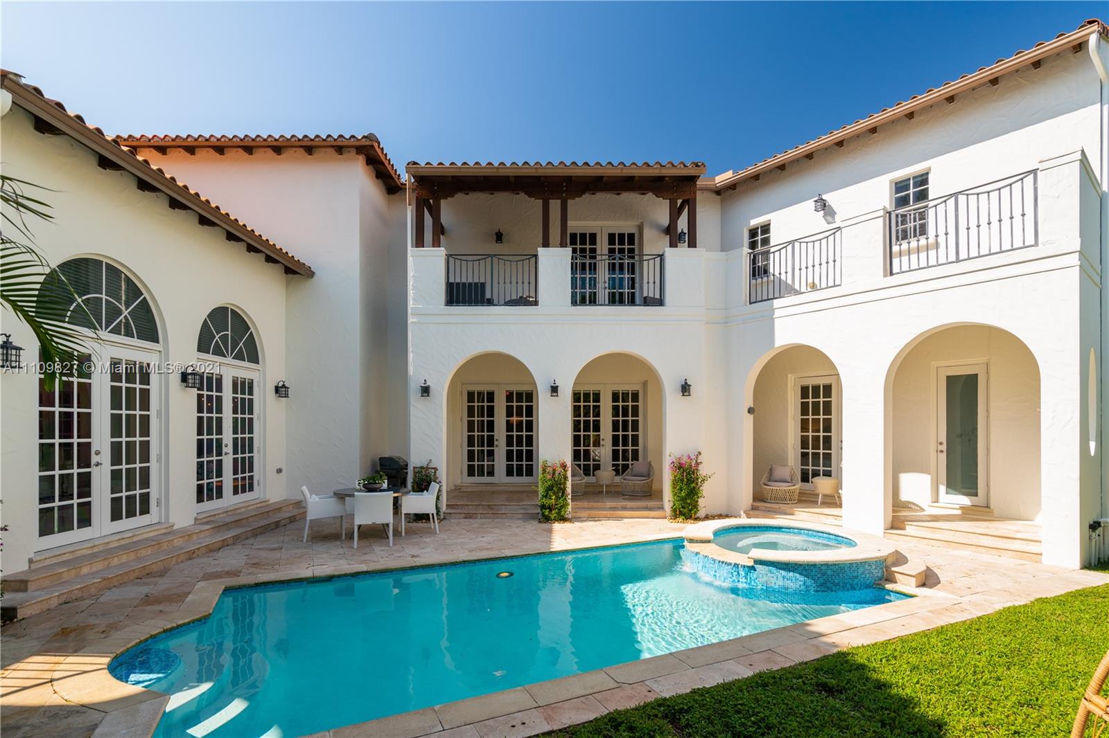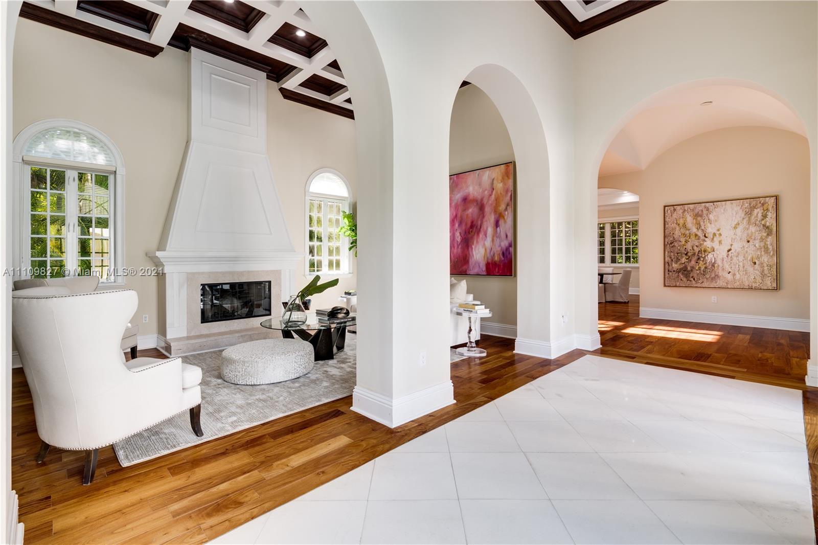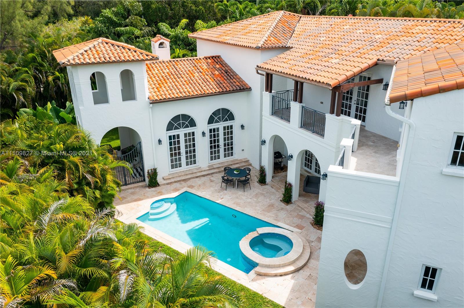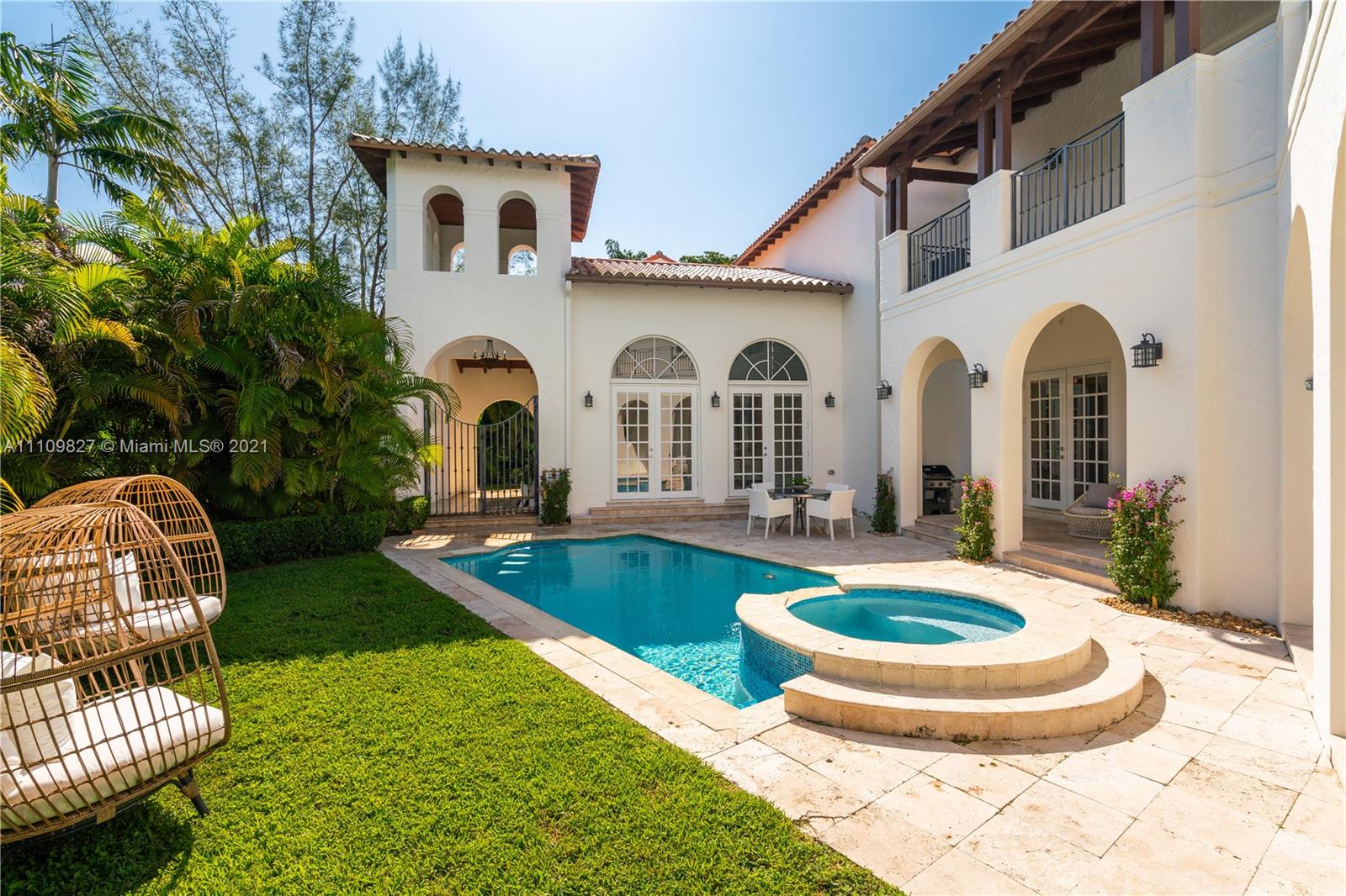 There's a magical intersection where Coral Gables and Coconut Grove meet, there you'll find this Tuscan-inspired residence that plays tribute to classical Mediterranean architecture while embracing modern sensibilities. Built in 2008, this handsomely designed two-story home impresses all with gleaming hardwood floors, fireplace, coffered ceilings, bold arches, and a charming ambiance. The formal dining room is large and gracious and adjoins a large kitchen/family room with an eat-in bar. All bedrooms are ensuite. The primary bedroom has two full baths and two generously sized walk-in closets - perfect for storing copious amounts of resort wear that you will undoubtedly wear year-round in the glorious pool and patio area. Impact doors/windows & room for elevator. A Very Special Home.