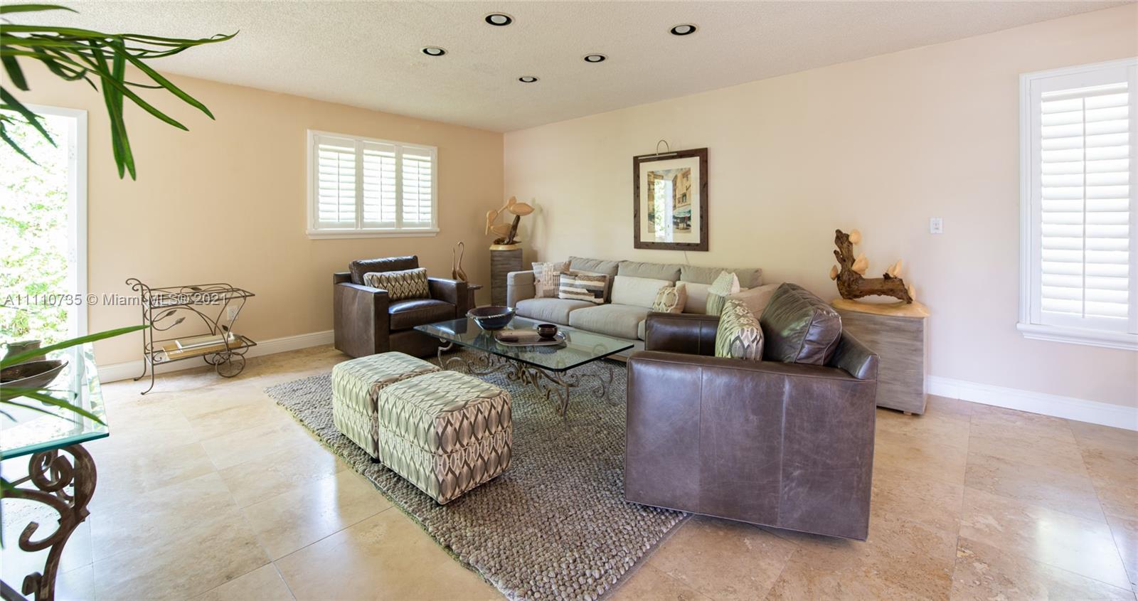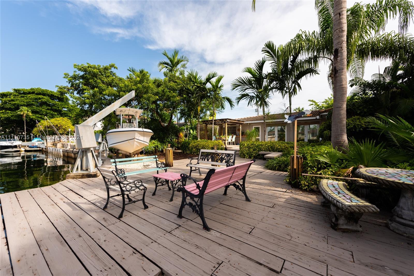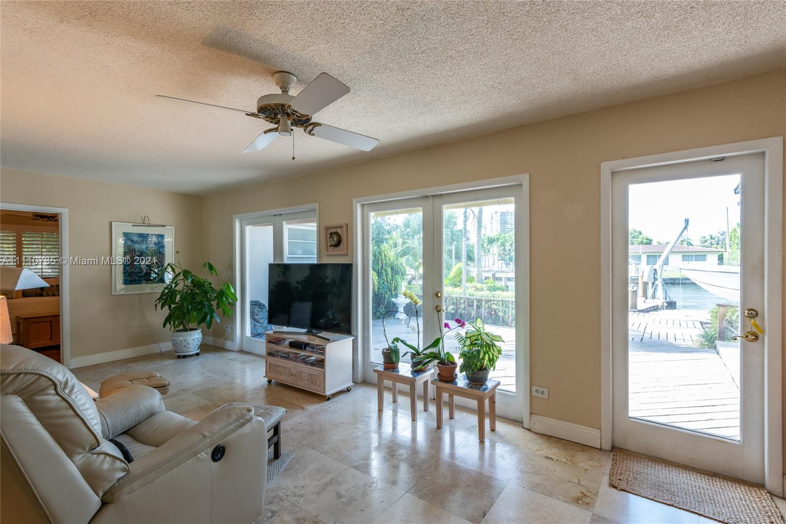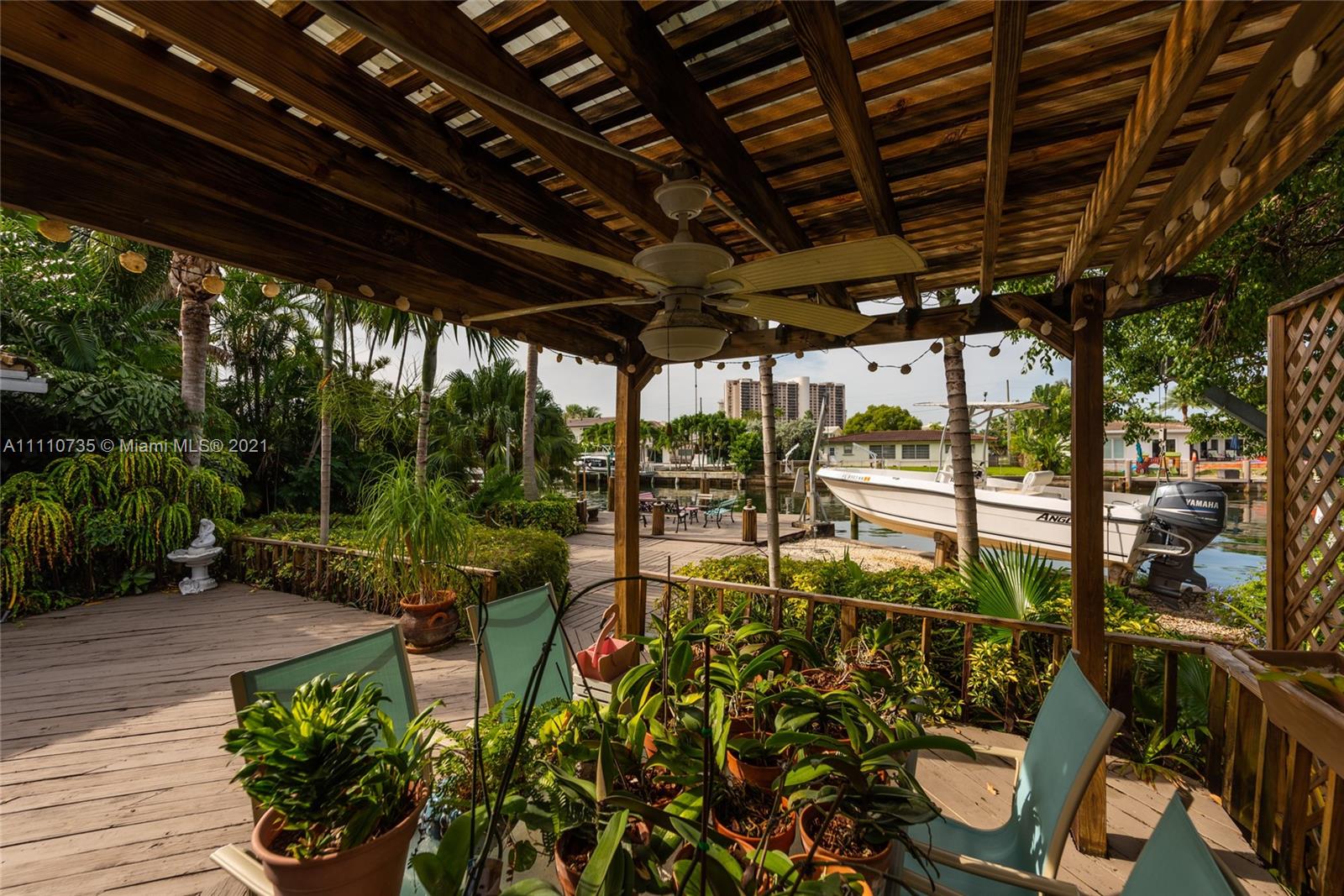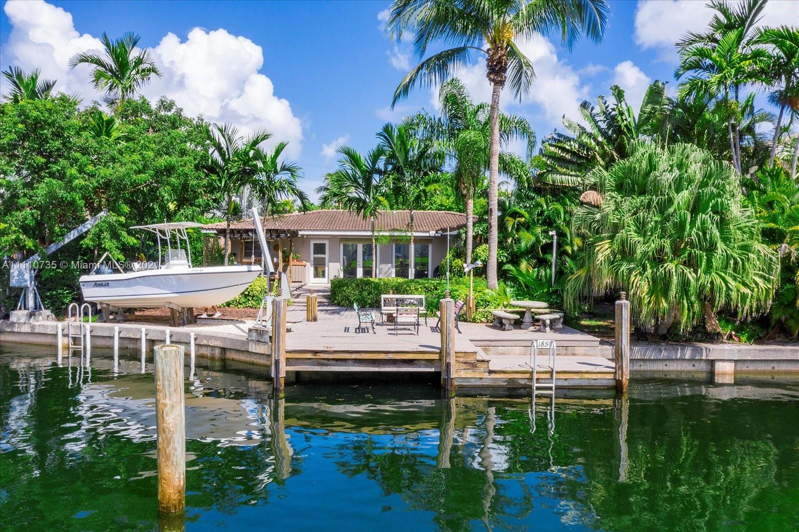 Beautiful light, bright, and airy 3-bedroom 2-bath waterfront home with backyard southwest exposure in gated Sans Souci Estates. Open floor plan and French doors ideal for indoor/outdoor living. Marble floors in living area and wood floors in bedrooms. Eat-in kitchen with granite countertops, wood cabinets, and stainless-steel appliances. Outdoors is a Floridian paradise with gazebo, wood deck and lush tropical foliage overlooking the tranquil waterfront with bay breezes. Private dock and davit on 75 feet of protected deep canalfront with ocean access and no fixed bridges.