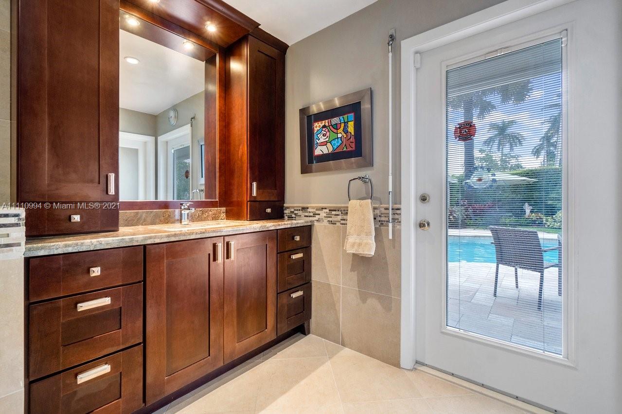 Chic modern 3 bedroom and 2.5 bath pool home in sought after Hollywood, Home boasts over 2200 sq ft of bright and open floor plan. Recent renovations include kitchen with Wolf range and oven, Sub Zero refrigerator and Miele dishwasher. Rounded it out is separate laundry room with Maytag washer and dryers! Baths updated as well. Gorgeous marble flooring throughout. Private pool lanai features "sand bar" in pool with umbrella and lush landscaping for a private experience. Steps to golf course, shopping and dining!
