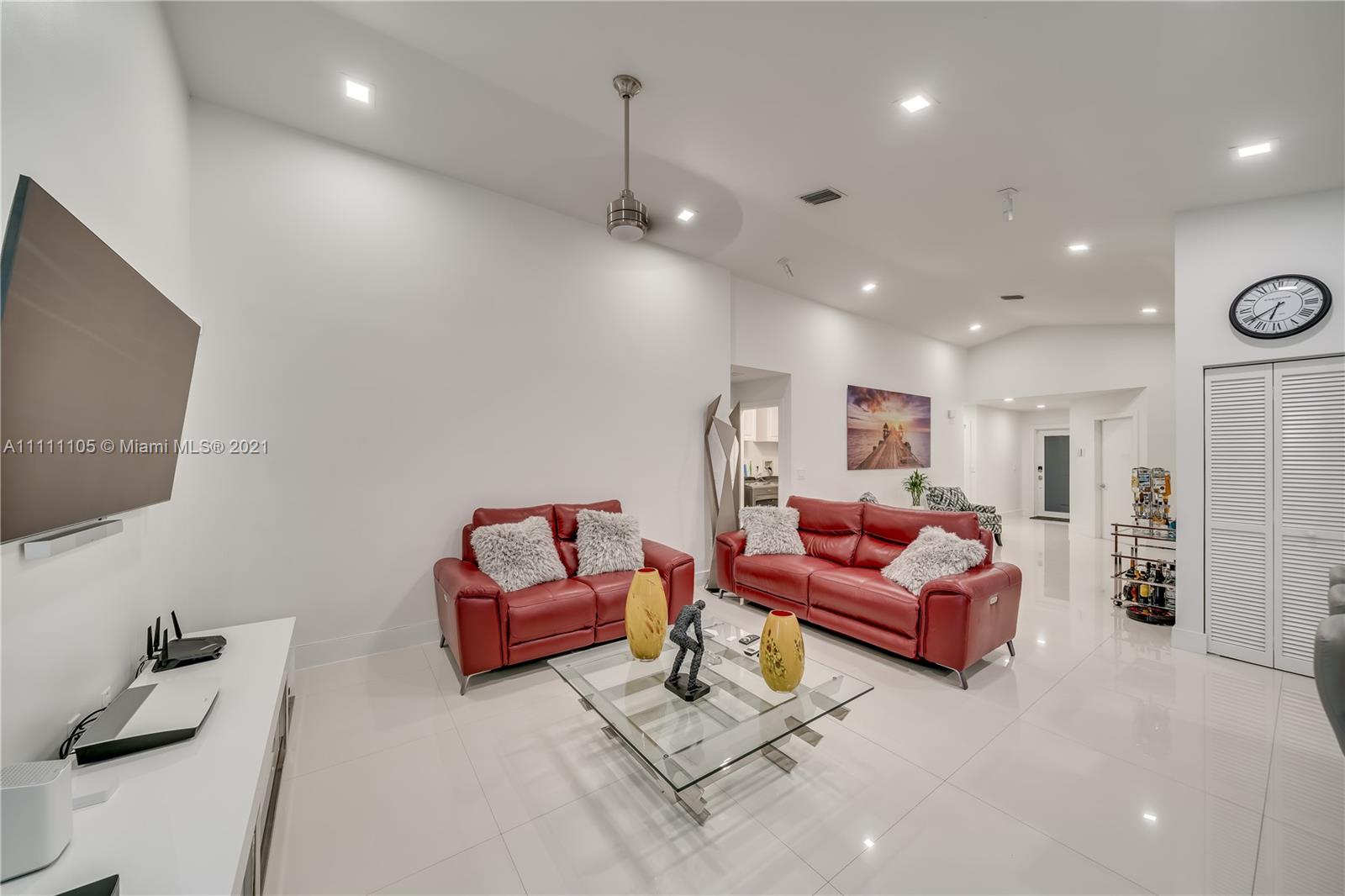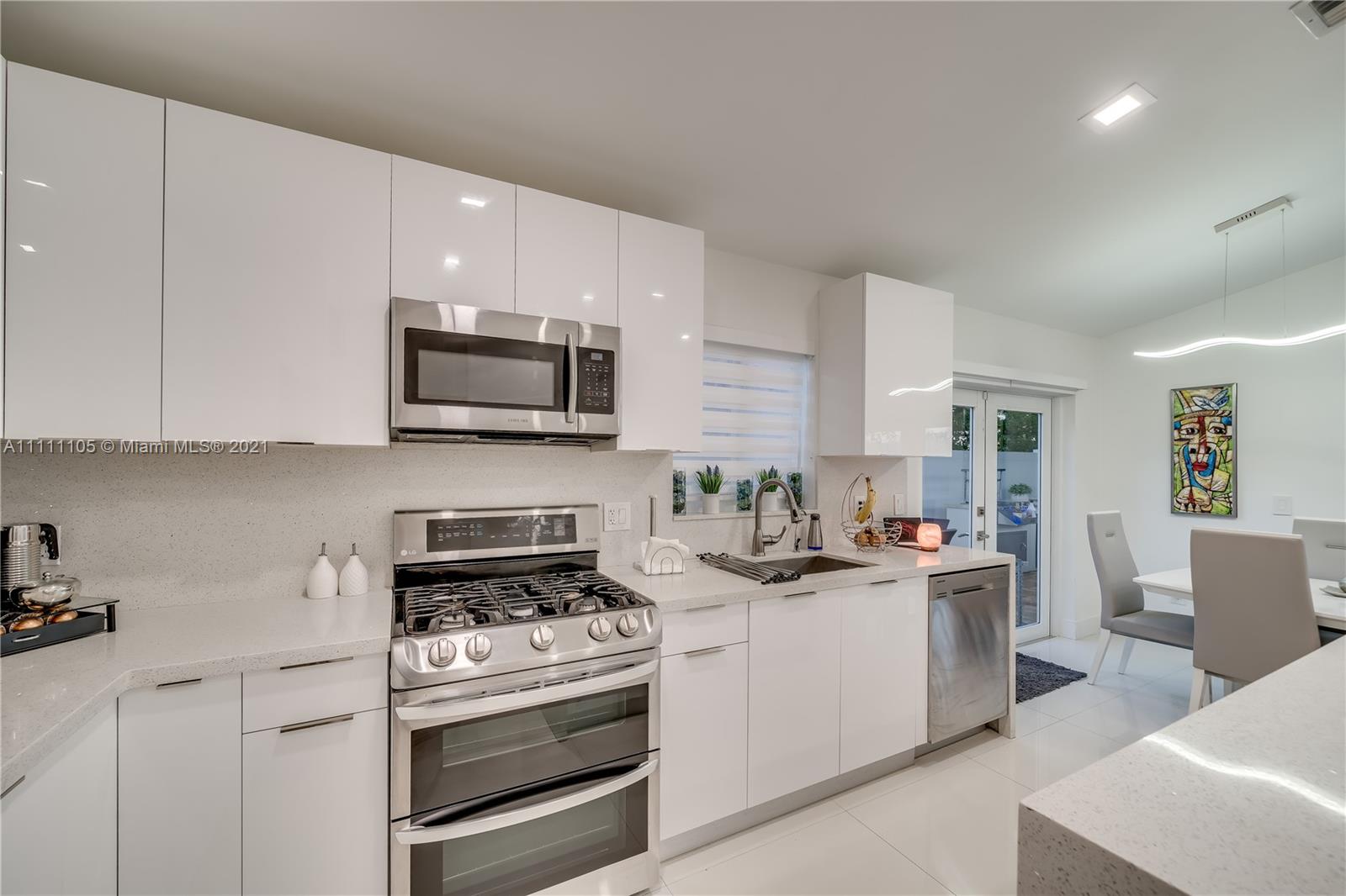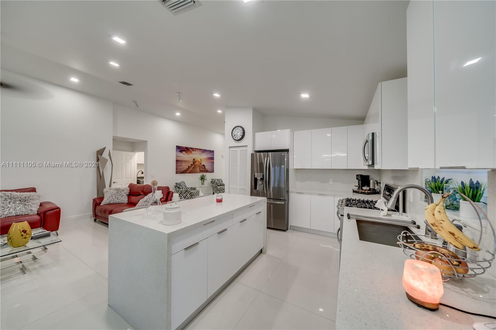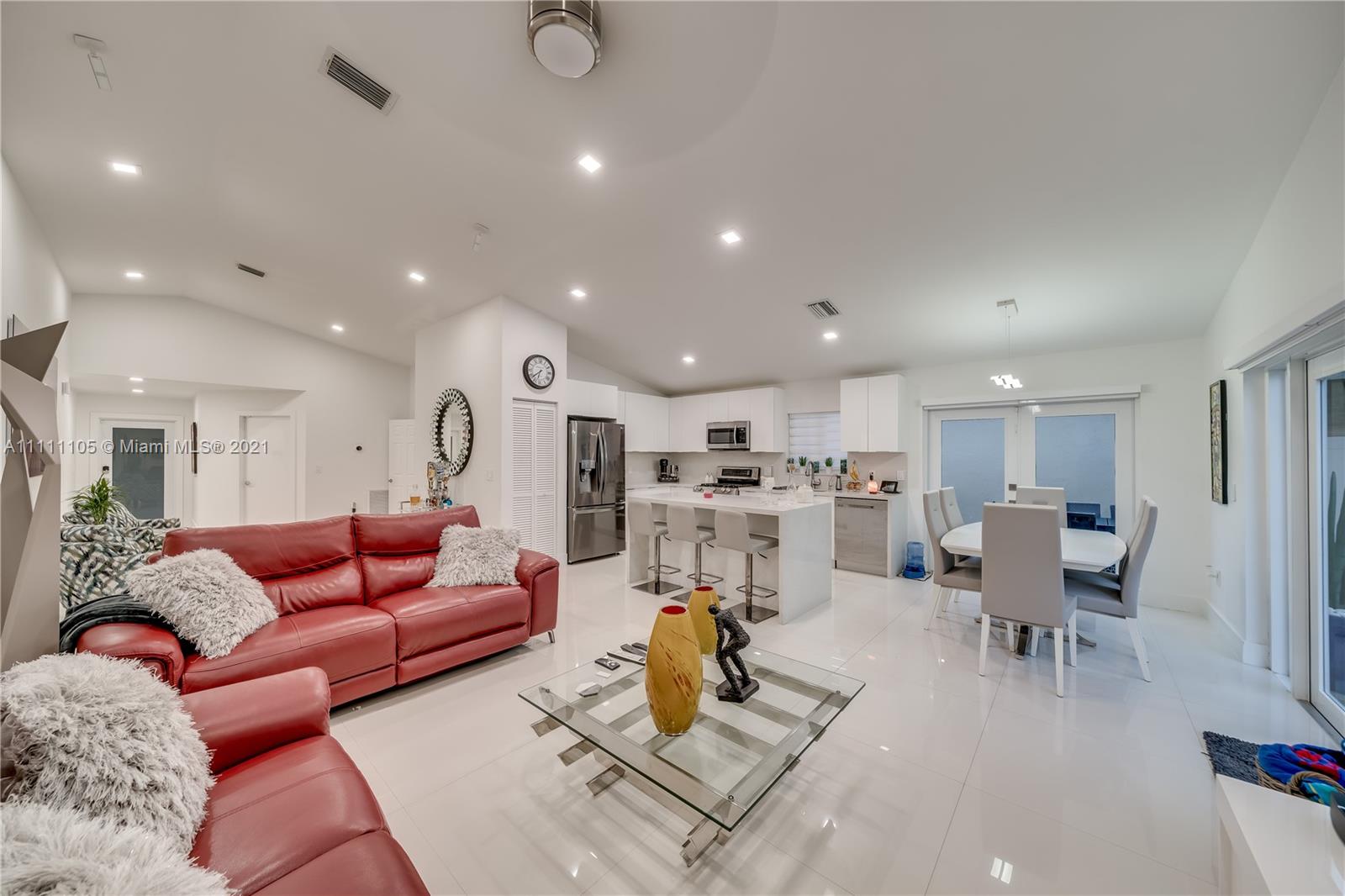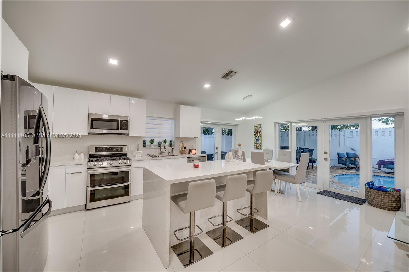 Beautifully fully remodeled 4/2 with Pool. Modern and Contemporary look. High Impact doors and windows, a new pool pump, also the pool was resurfaced in March this year, New Summer Kitchen with underground gas installation so forget about buying a gas tank, 2 mini fridge, wine fridge with dual temperatures in outdoor kitchen, travertine marble in patio, Vaulted ceilings, with LED Lights throughout and white glossy 32x32 porcelain floors. European Style white glossy Kitchen cabinets have an Open Floor concept overlooking the family room and pool. Quartz counters. Gas Stove, double over LG & fridge LG double ice maker are less than 1 yr, Gas Water heater/Gas dryer, smart outlet and switches in living area, kitchen and patio. Cable and Blast Internet included in HOA. Excellent schools.