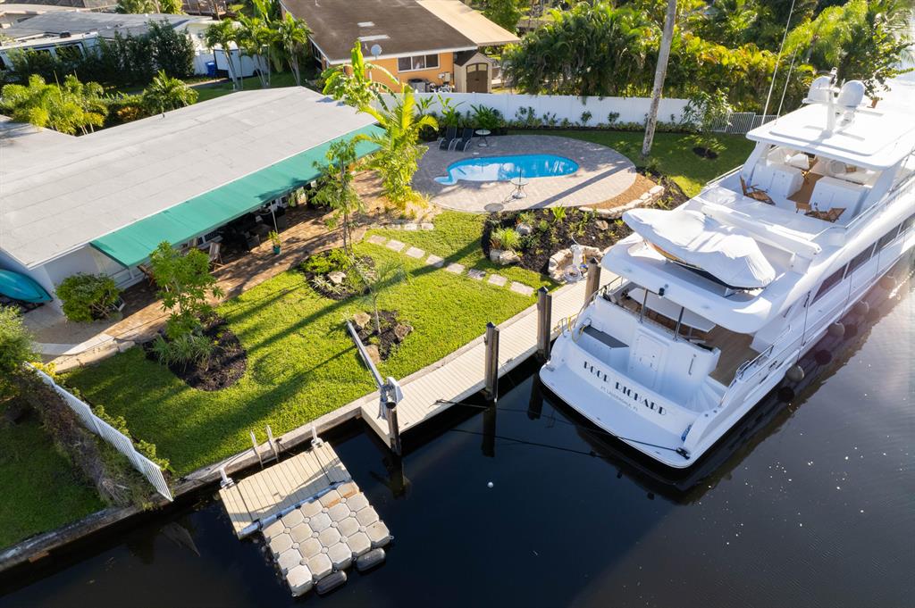 Rarely available point lot with wide water views of the new river. This amazing home has a new 100 foot dock and over 132 foot of non fixed bridge waterfront, perfect for up to 120 foot yacht. The dock has 150 amp electrical service and water. This waterfront dream is fully remodeled with high-end finishes and upgrades including a new roof, new HVAC, remodeled kitchen with stainless steel appliances. Both bathrooms are also fully remodeled. On the exterior new landscaping in the front and rear, white vinyl privacy fence, new extended paver patio around the pool and steps down to the dock. This is the only waterfront lot in the area for sale near this price point with over 100 foot of dock space for a mega yacht. Yacht owners dream, stop renting dock space and buy this house.
