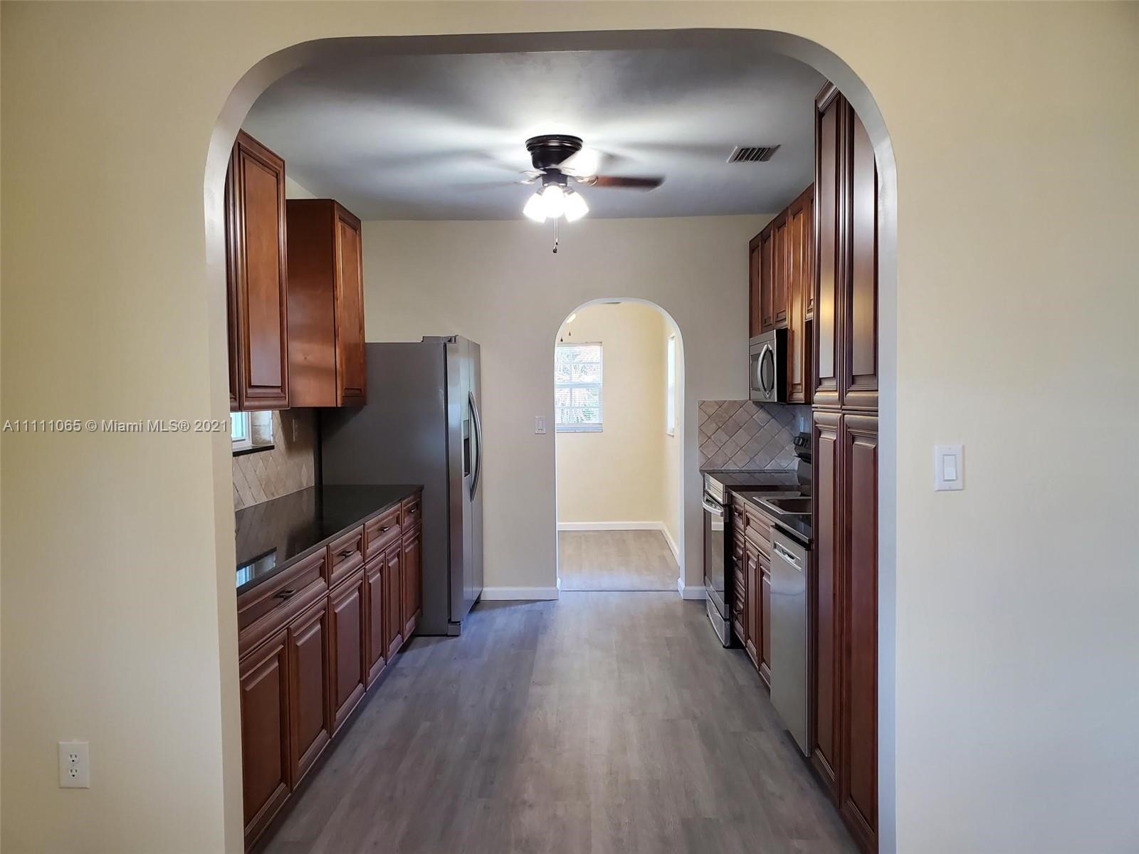 A special opportunity awaits you to be the lucky owner of a fully remodeled home. New flooring, cabinetry, SS appliances, fittings & fixtures, int./ext. lighting & doors, ceiling fans, window blinds, electric smoke/fire alarms, and electrical & plumbing throughout the home. Freshly painted inside & out. Convenient in-house laundry & utility room, too! Roof 3 yrs. new. Impact windows, sprinkler system, and freshly coated epoxy seal on carport & porch/patio surfaces. Spacious & peaceful backyard ideal for outdoor entertaining & large enough to add a pool! Fencing lines the entire perimeter of property. Fruit trees of mango, avocado, & banana dot the landscape. Make this move-in ready family house Your Home.