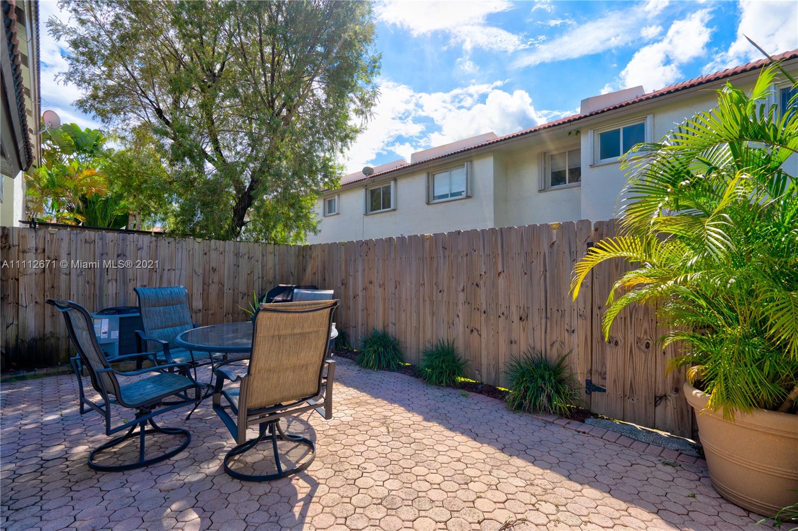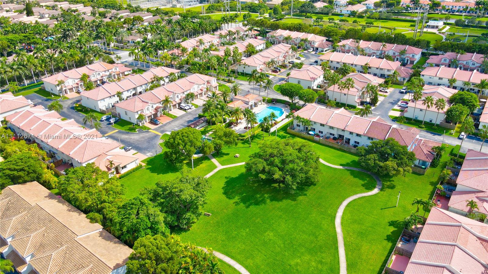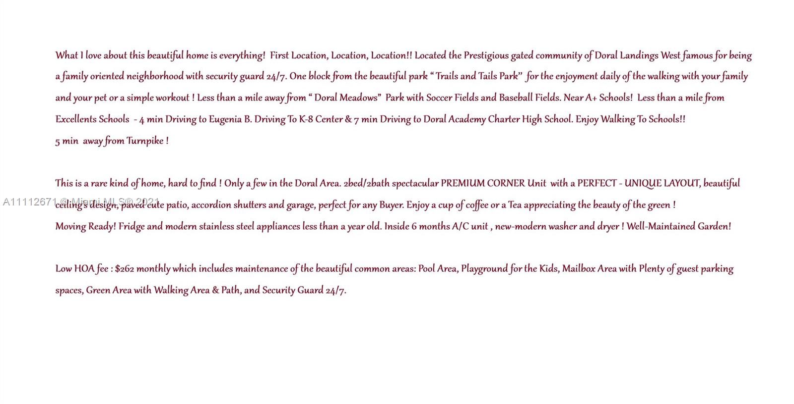 Located the Prestigious gated community of Doral Landings West famous for being a family oriented neighborhood with security guard 24/7. One block from the beautiful park “ Trails and Tails Park’’. Near A+ Schools! Less than a mile from Excellent Schools - 4 min Eugenia B. Driving To K-8 Center. This is a rare kind of home, hard to find ! Only a few in the Doral Area. 2bed/2bath spectacular PREMIUM CORNER Unit with a PERFECT - UNIQUE LAYOUT, beautiful ceiling's design, paved cute patio, accordion shutters and garage, perfect for any Buyer. Enjoy a cup of coffee or a Tea appreciating the beauty of the green! Moving Ready! Fridge and modern stainless steel appliances less than a year old. Inside 6 months A/C unit , new-modern washer and dryer ! Well-Maintained Garden! Low HOA $262 monthly.