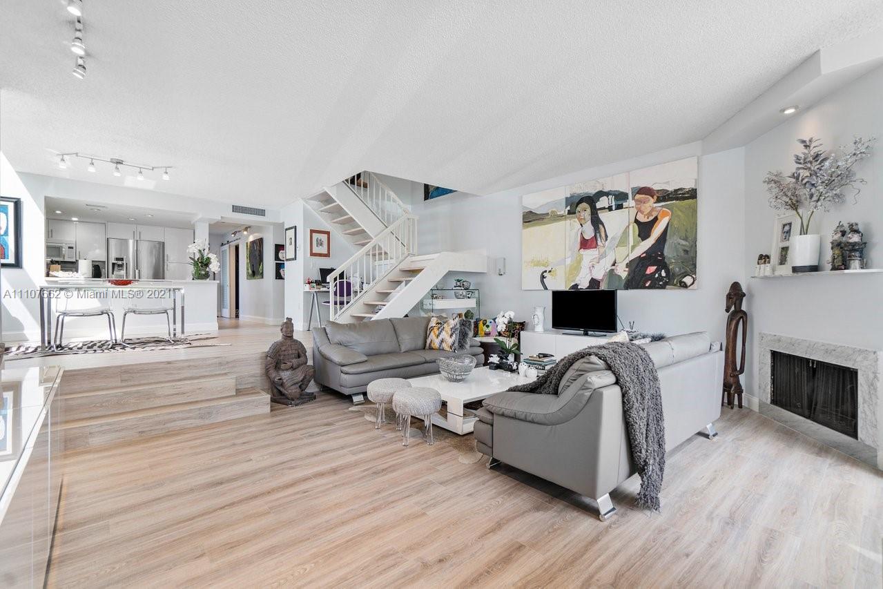 Admirals Port Townhome w/Lots & lots of Natural Light! High ceilings, lots of windows Spacious 3 br 2.5 ba or 2/2 with Den townhome offers a renovated kitchen with white custom cabinetry, Quartz countertops, and stainless-steel appliances All new Whitewashed wood laminate flooring throughout the first floor & wood burning fireplace. 2 En-suite bedrooms upstairs MB closet expanded for huge closet space Washer dryer in MB 1st floor bedroom has barn doors now used as a media room (closet easily re-installed) 2 assigned parking, Heated pool no rental restrictions 2 dogs allowed. Low HOA. Prime Aventura location walking distance to A Rated schools, Houses of Worship, Fresh Market, Publix and world-class shopping and dining at Aventura Mall mins to beaches of Sunny Isles. XL community pool.