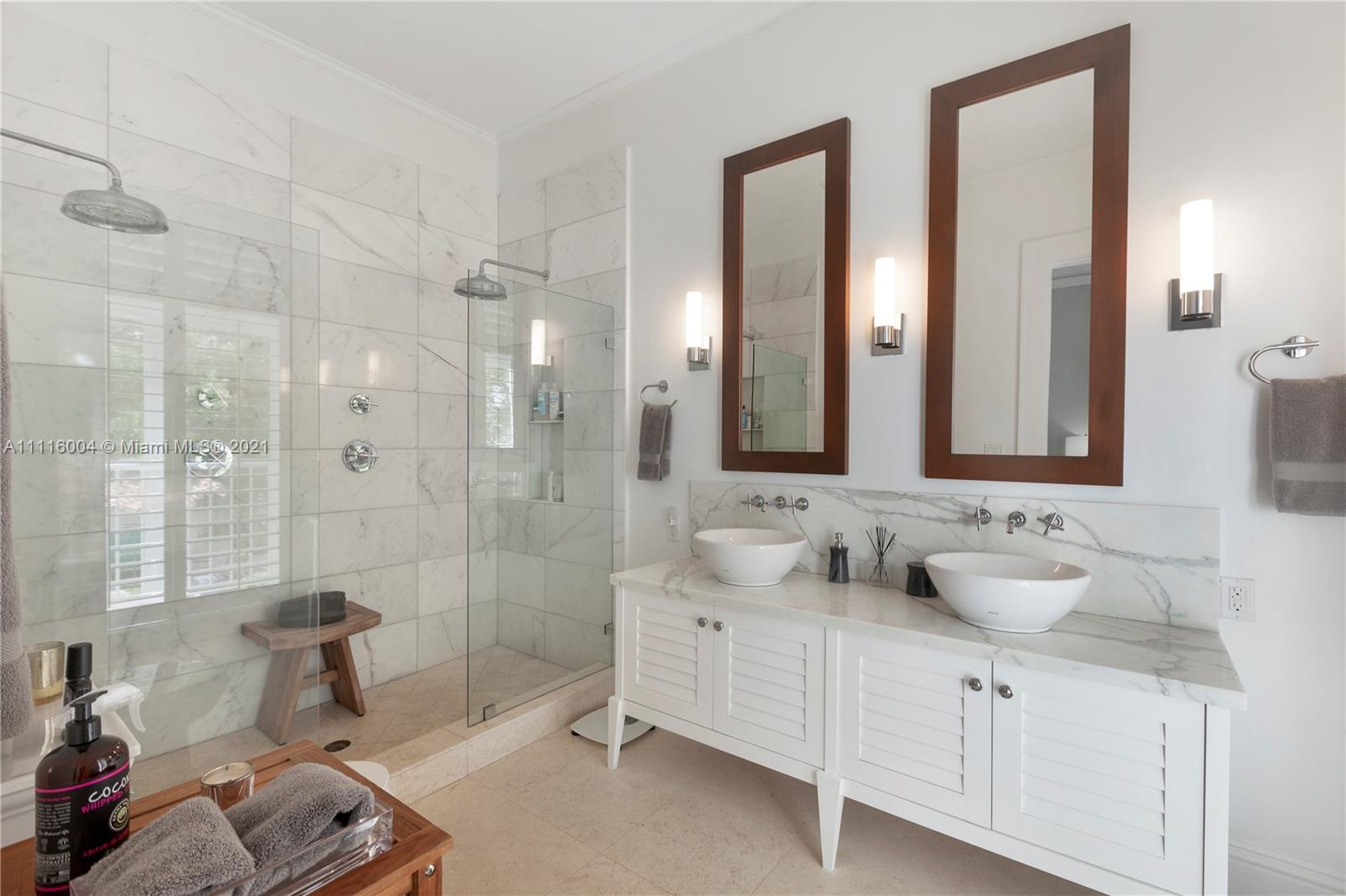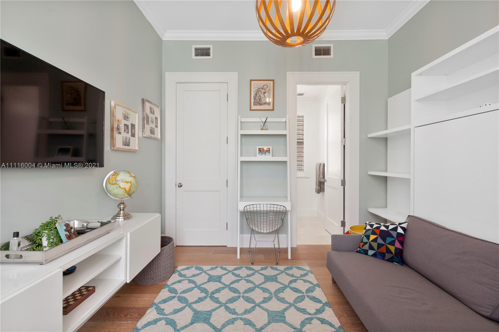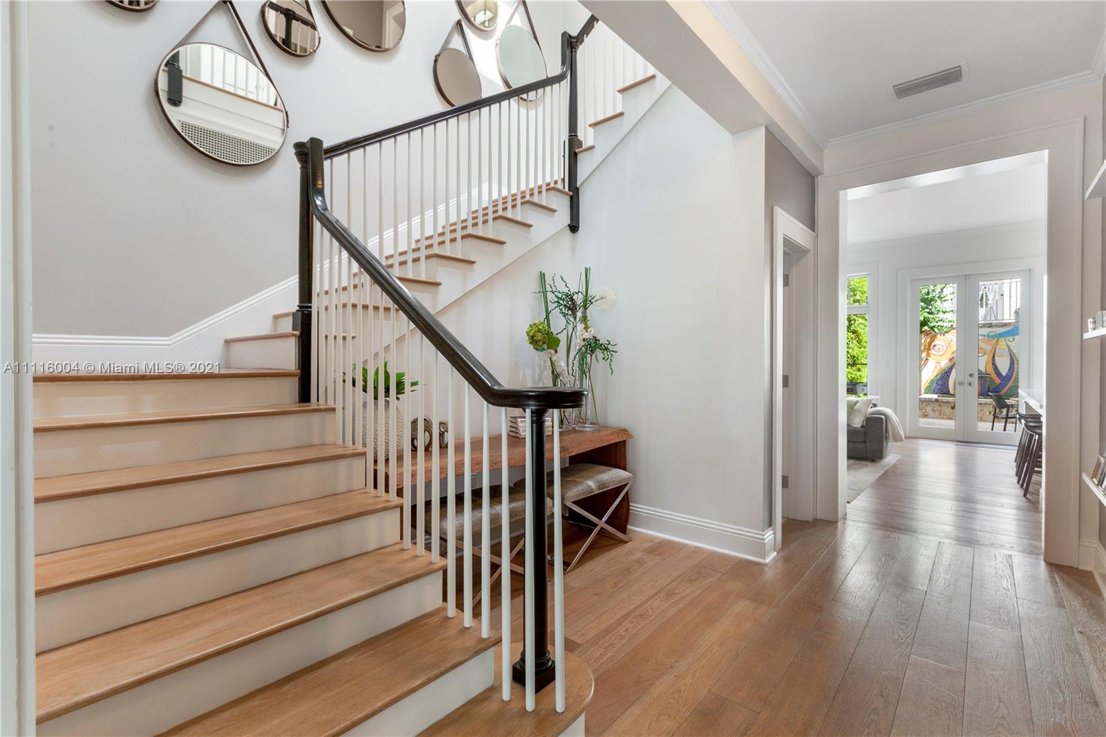 Almeria Row’s Phase II, No. 639, is graced with eleven and seventeen foot ceilings while the transom windows, marble + wood floors, wood shutters, 8-foot doors and skylight add to its allure. Almeria Row, a collective set of 10 row homes has garnered numerous architectural awards and has been featured in countless magazine articles. Offering a 2/2.5 main home + semi-detached 2/2 above the 2-car garage. The dreamy courtyard enjoys the sights and sounds of trickling water from the fountain and a roofed area ideal for al fresco dining. The home is storm-ready with its impact windows/doors and a whole-house generator that is connected to natural gas. This is a prime Gables location and very walkable to many restaurants, parks + cultural venues