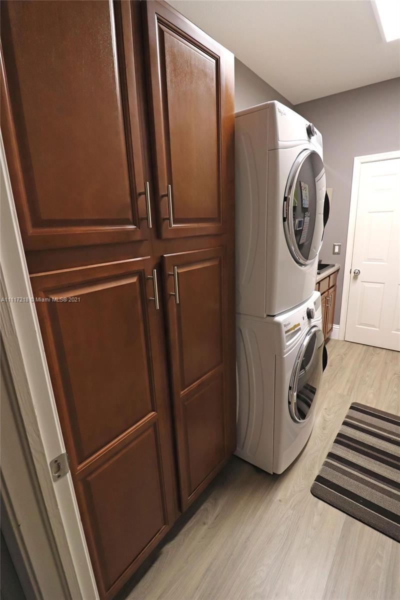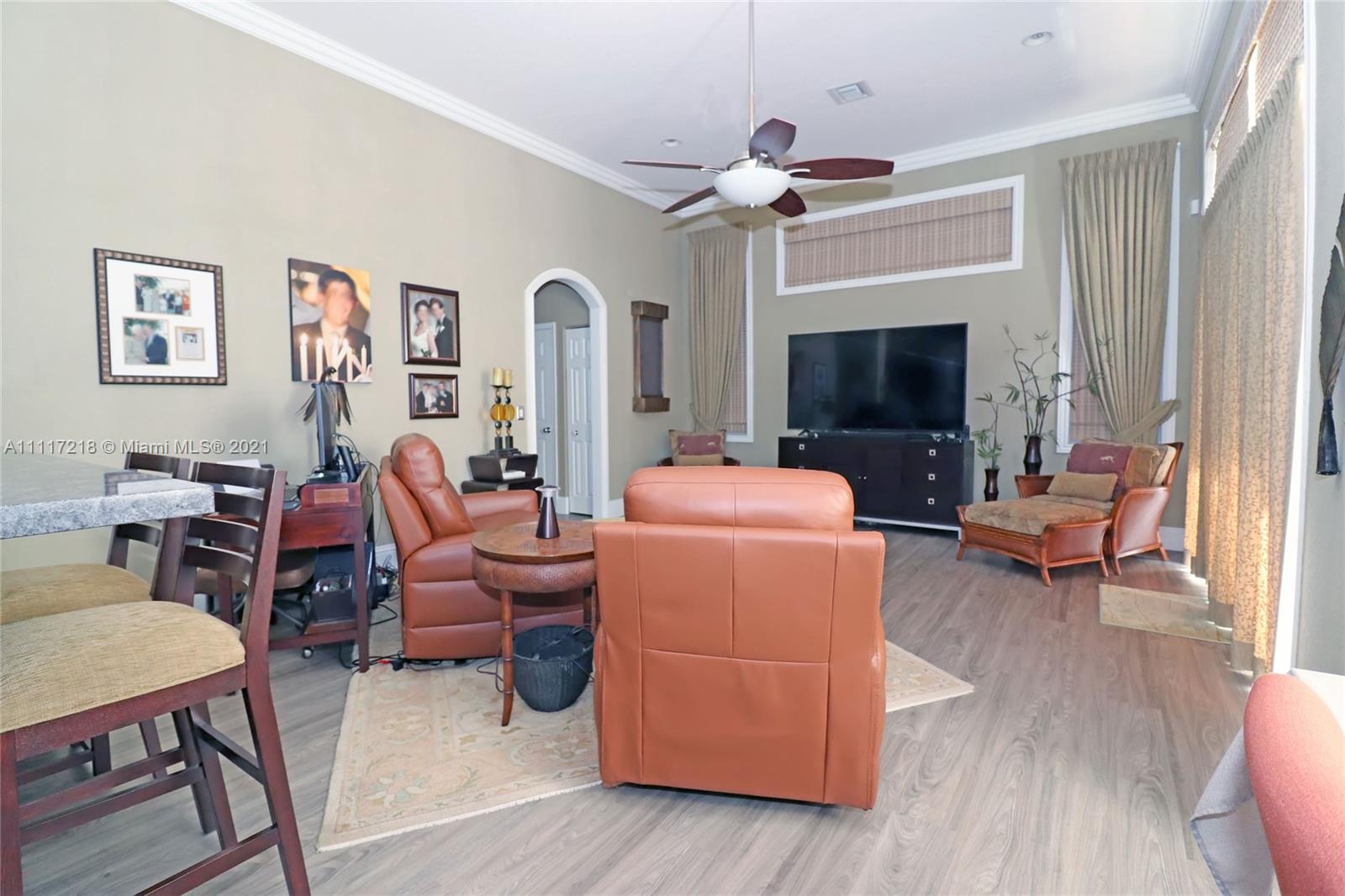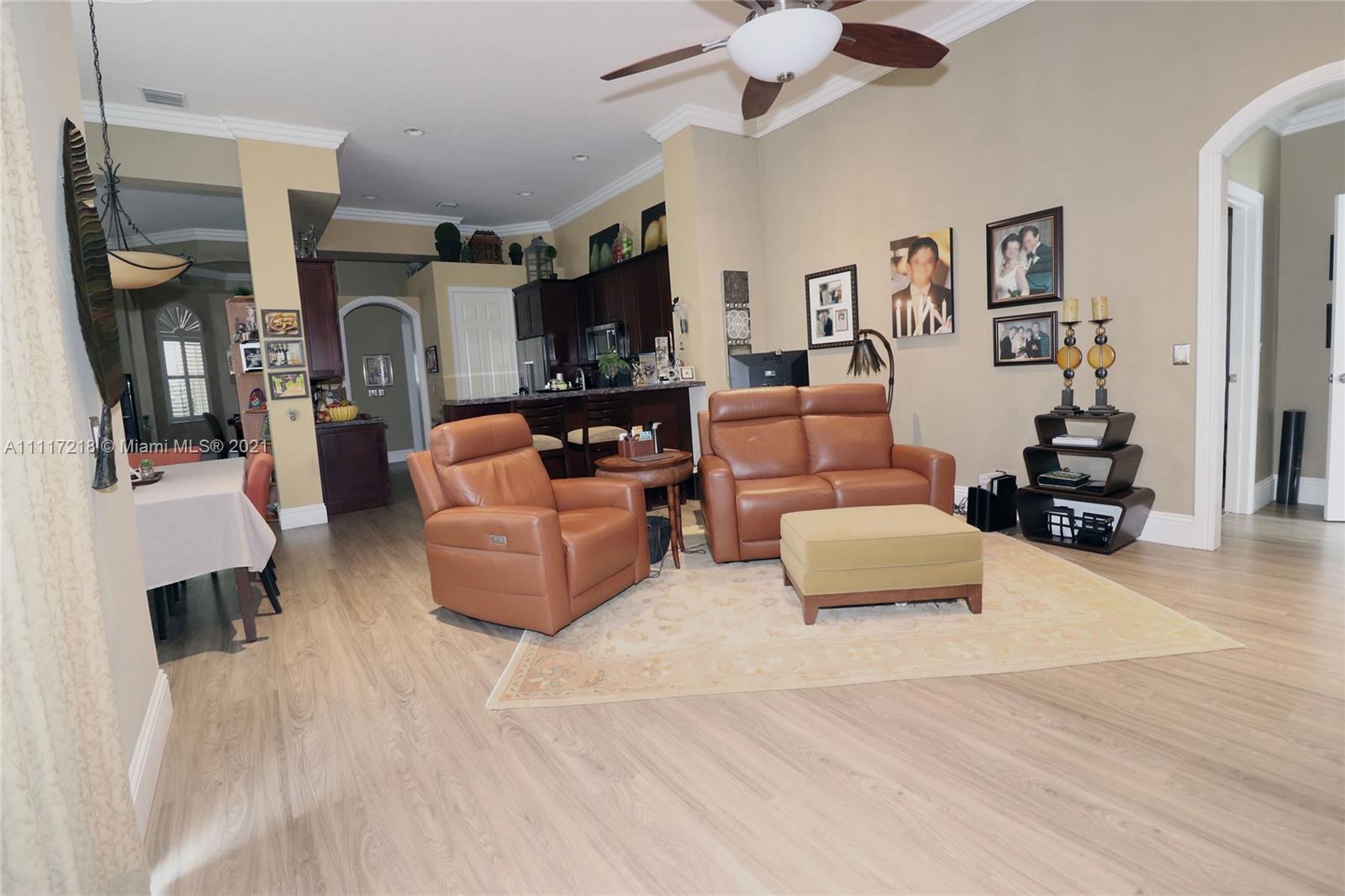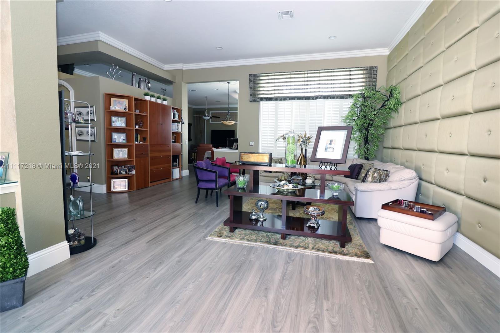 Four bed-3 bath, NEW impact Doors+Windows+Hurricane shutters. Remodeled: kitchen, new appliances (KitchenAid-2018), 3 remodeled bathrooms, new luxury vinyl floor, Pergo in 3 bedrooms, engineered wood in the master bedroom, crown molding. Upgraded baseboards. Beautiful faux painting in the dining room, master bedroom and bathroom. Plantation shutters in living room, dining room. Upholstered living room wall. Ethan Allen window treatments in the tv room. Custom closets in bedrooms and pantry. Remodeled Laundry Room. Upgraded ADT alarm system. Tiled floor in 3-car garage with storage cabinets. New (2020) High Efficiency Air Conditioner, New (2018) Washer and Dryer. New Rachio electronic smart sprinkler. Pool, landscape lighting. Walking distance to ‘A RATED’ MIDDLE and HIGH SCHOOL.