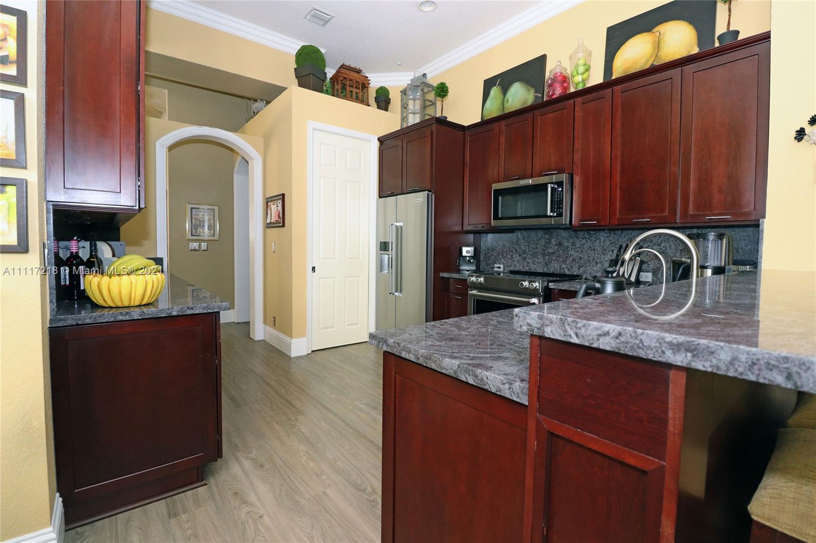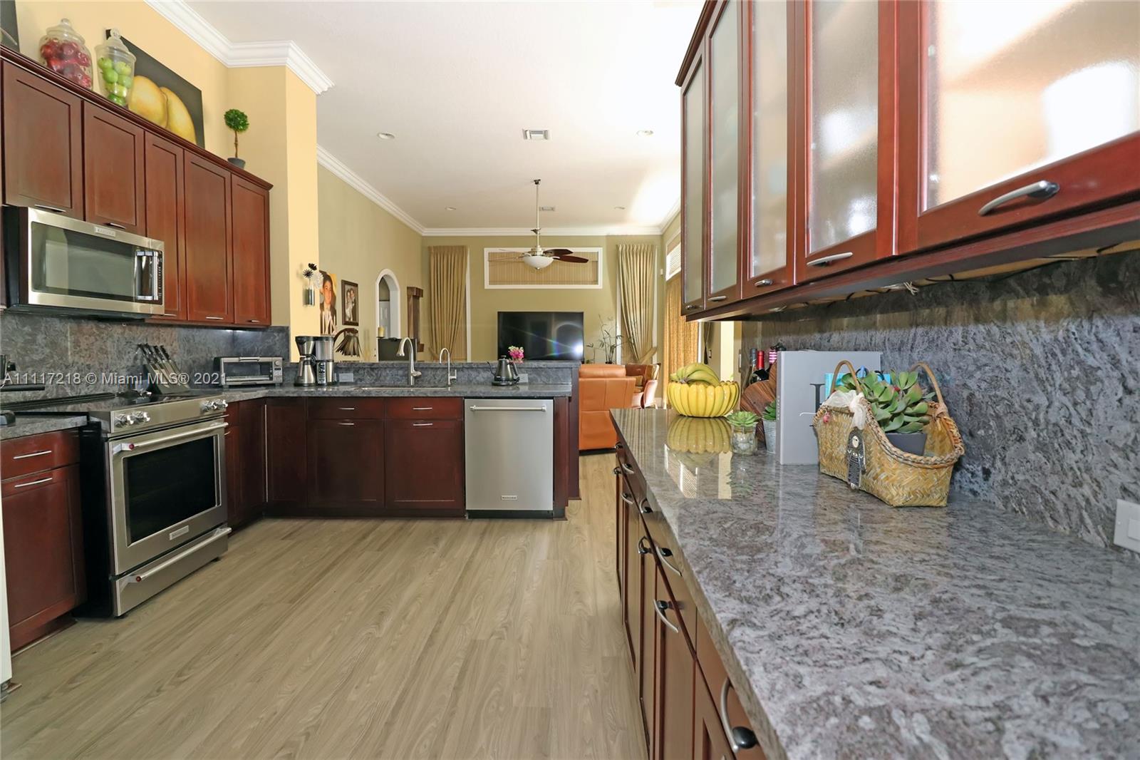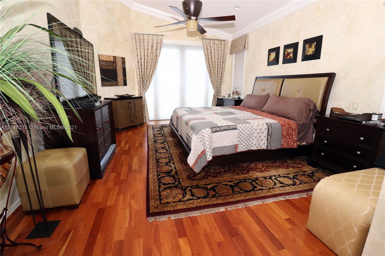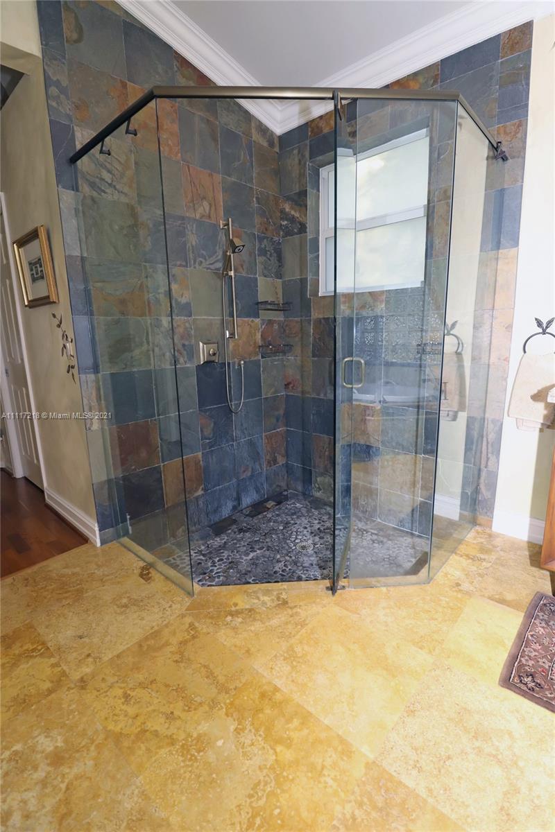 Four bed-3 bath, NEW impact Doors+Windows+Hurricane shutters. Remodeled: kitchen, new appliances (KitchenAid-2018), 3 remodeled bathrooms, new luxury vinyl floor, Pergo in 3 bedrooms, engineered wood in the master bedroom, crown molding. Upgraded baseboards. Beautiful faux painting in the dining room, master bedroom and bathroom. Plantation shutters in living room, dining room. Upholstered living room wall. Ethan Allen window treatments in the tv room. Custom closets in bedrooms and pantry. Remodeled Laundry Room. Upgraded ADT alarm system. Tiled floor in 3-car garage with storage cabinets. New (2020) High Efficiency Air Conditioner, New (2018) Washer and Dryer. New Rachio electronic smart sprinkler. Pool, landscape lighting. Walking distance to ‘A RATED’ MIDDLE and HIGH SCHOOL.