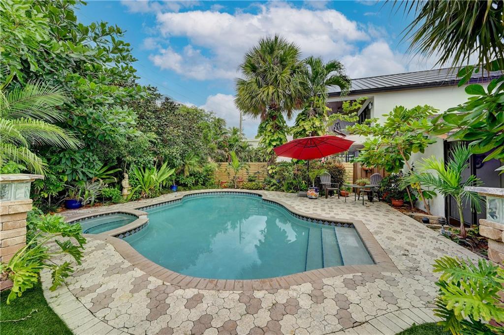 Breathtaking sunrises & Lauderdale Beach life in all its glory is only two blocks away! This 3 bed /3 bath home features a beautiful private hedged in front yard and Chicago brick driveway. Could convert to 4 or 5 Bedrooms easily... Front foyer entry leads to the formal living room and open staircase. 1 downstairs Bedroom. The kitchen remodel includes newer tile floors, fixtures, wood cabinets, granite counter tops, decorative back splash, stainless steel appliances.. Open-concept style kitchen overlooks the family room & dining with access to a large screened-in porch with Mexican tile floor. Completely fenced-in yard includes a private pool with built-in Jacuzzi & lush tropical landscaping. Additional features include hardwood & Tile floors, and a 1 car garage. Good daily rental too.