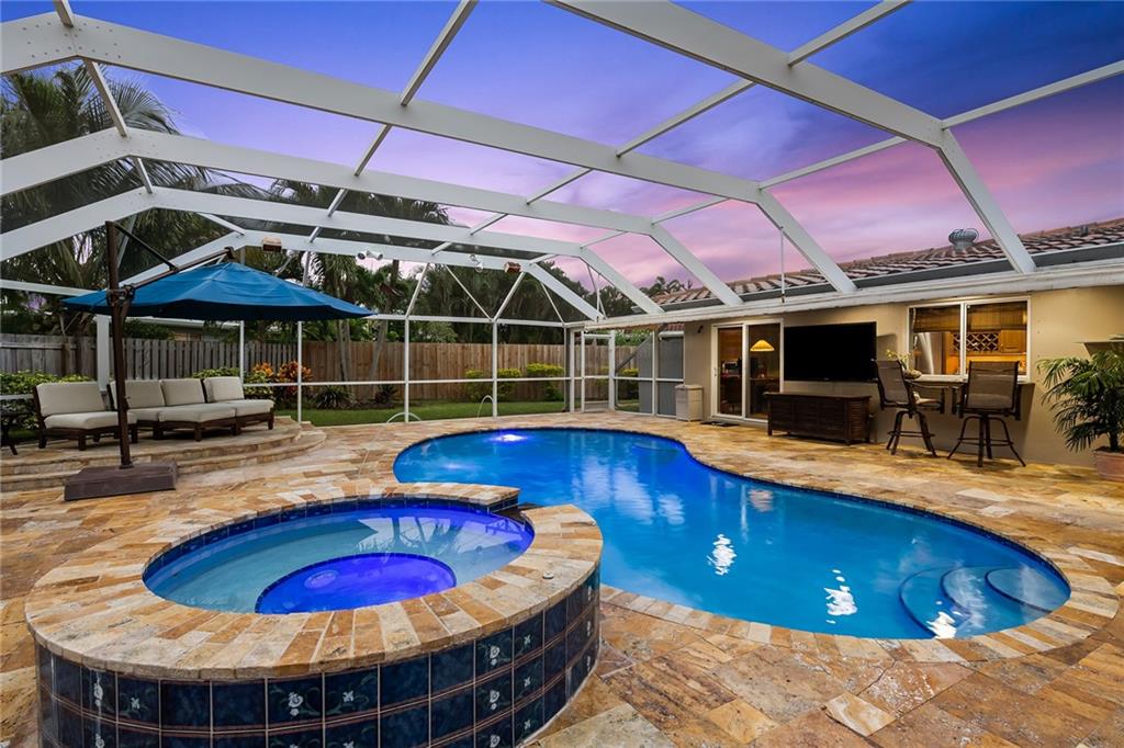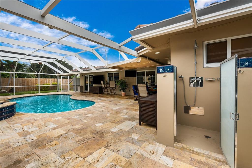 Welcome to the highly desirable Imperial Point. This spectacular single story home boasts 3 bedrooms, 2 bathrooms, long Chicago brick driveway & 2 car garage. Meticulously landscaped with privacy gate and Koi pond at entrance: the curb appeal is like no other. Spacious family room and kitchen overlook sprawling, screened-in Travertine patio with heated salt water pool, spa, outdoor shower, and fenced-in yard. Galley kitchen with stainless steel appliances, wood cabinets, granite countertops, breakfast area. Built-in cabinet storage in laundry room & garage. Master suite has access to the pool from bedroom slider and bathroom cabana door. Roof 2009, AC 2010, impact windows & doors (front door with panels). Close proximity to Westminster Academy & Pine Crest Private Schools, shops & beaches!
