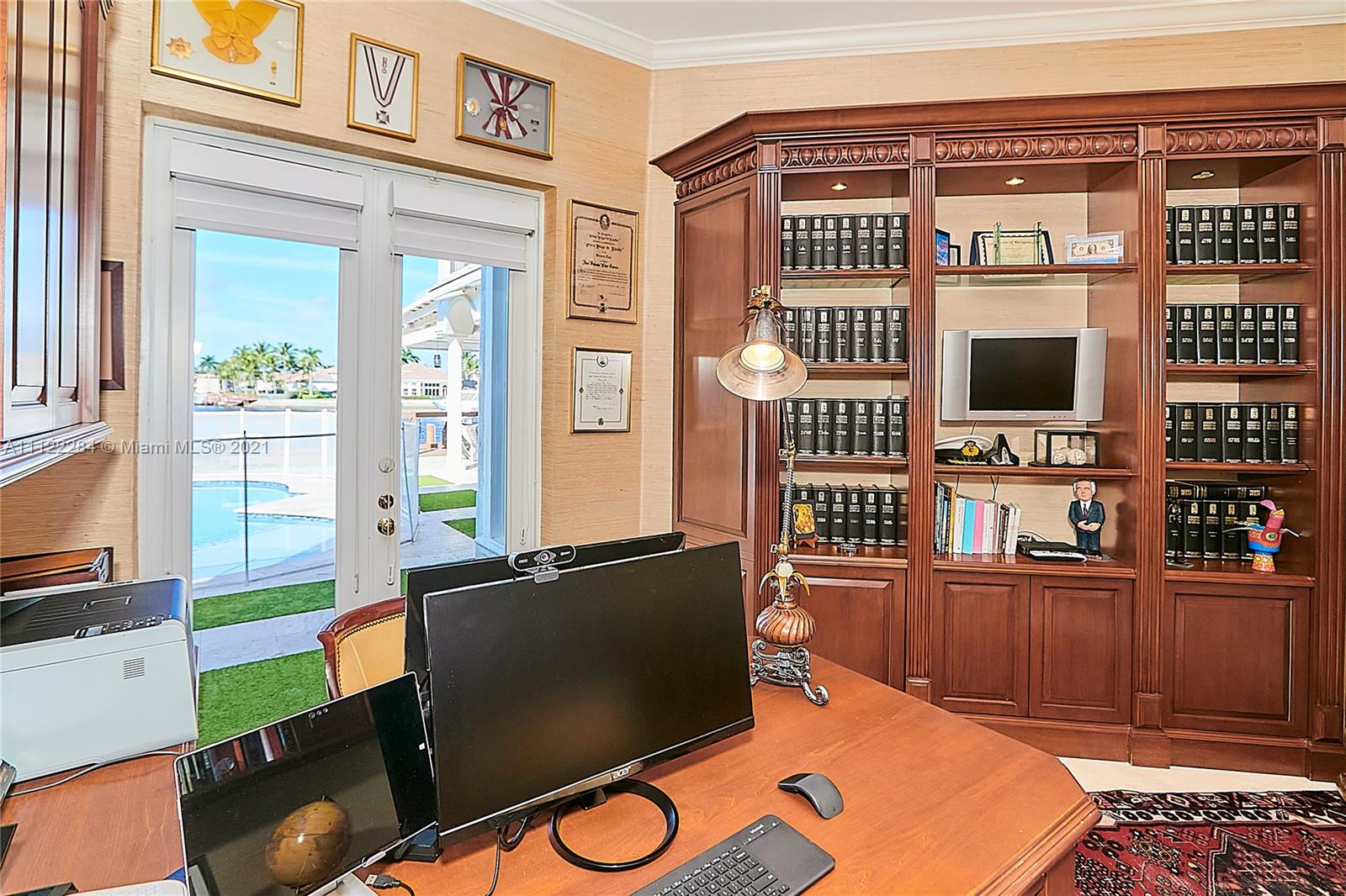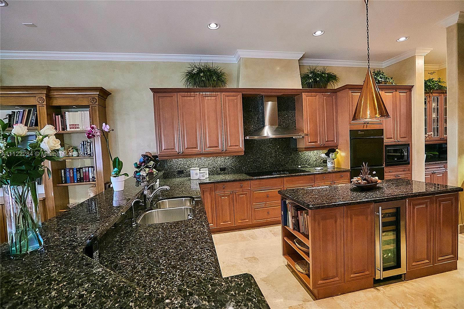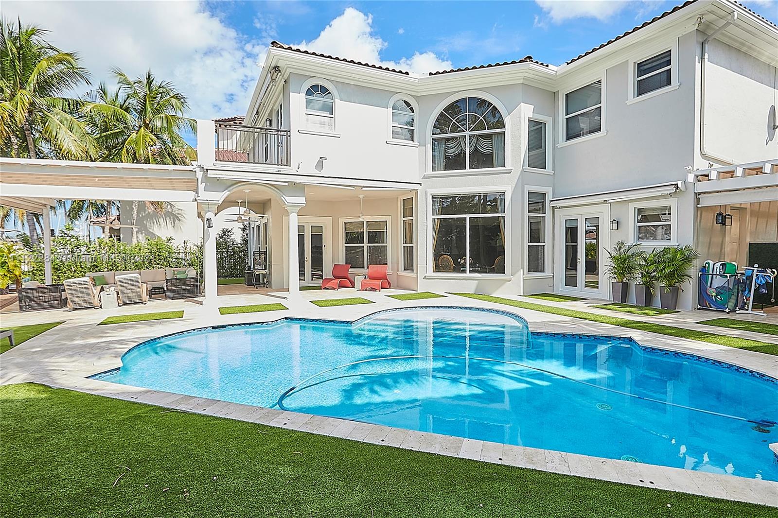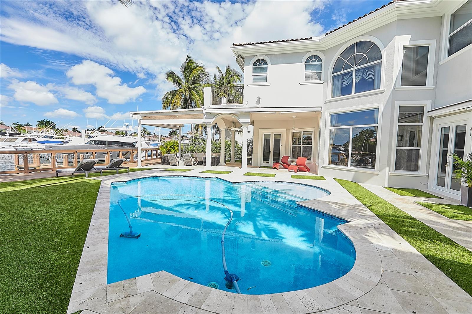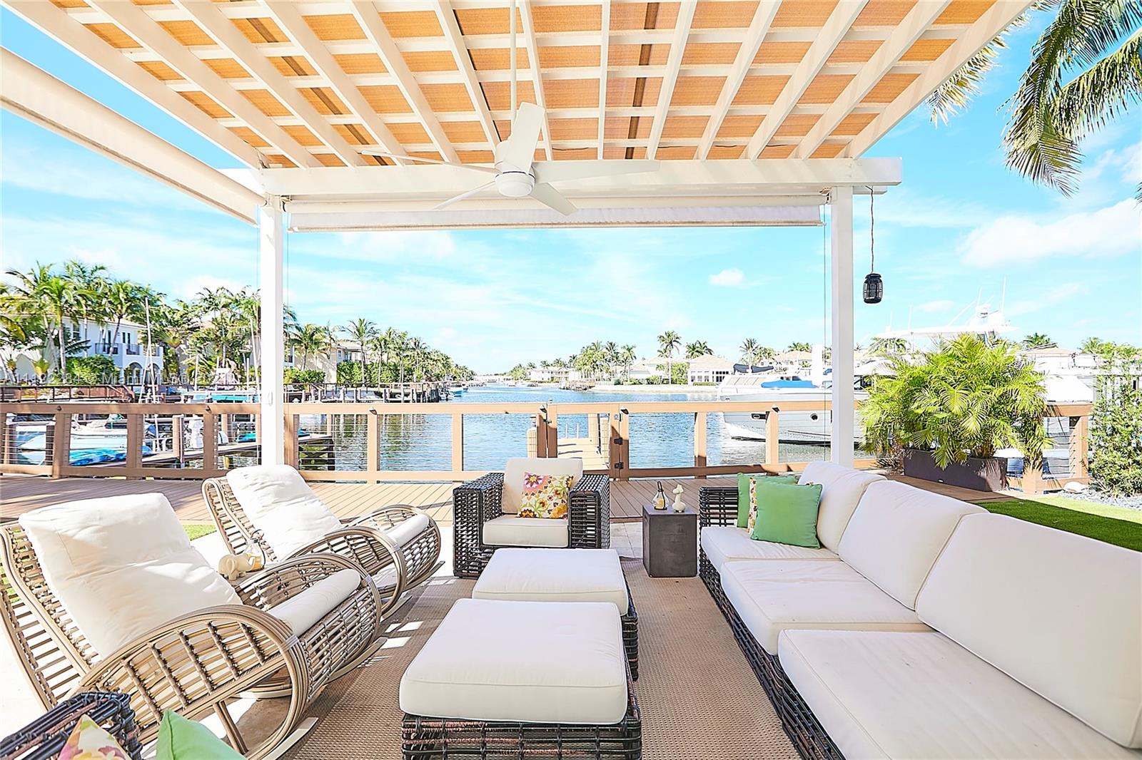 UNIQUE AND EXQUISTE WATERFRONT PROPERTY, HARBOR ISLAND. COMMODORE ESTATE. HOLLYWOOD. FL. 70 feet over the bay plus a dock where 2 boats up to 50 ft could be moored. No bridges to the Atlantic Ocean, Corner lot. 5 Bedrooms with en suite bathrooms plus 2 studios. Large windows, waterfront views, double high ceilings in the reception area, sub zero fridge and separate freezer, top of the line appliances, kitchen island and wine cooler, granite countertops, adjacent butler corner and large pantry, formal dining and family area with informal dining over water views all around. Magnificent outdoor area and fixtures, climatized saltwater pool, summer kitchen and 2 pergolas for “al fresco” enjoyment. 3 A/C zones, 3-car garage. Saturnia floors and much more. Furniture not included.