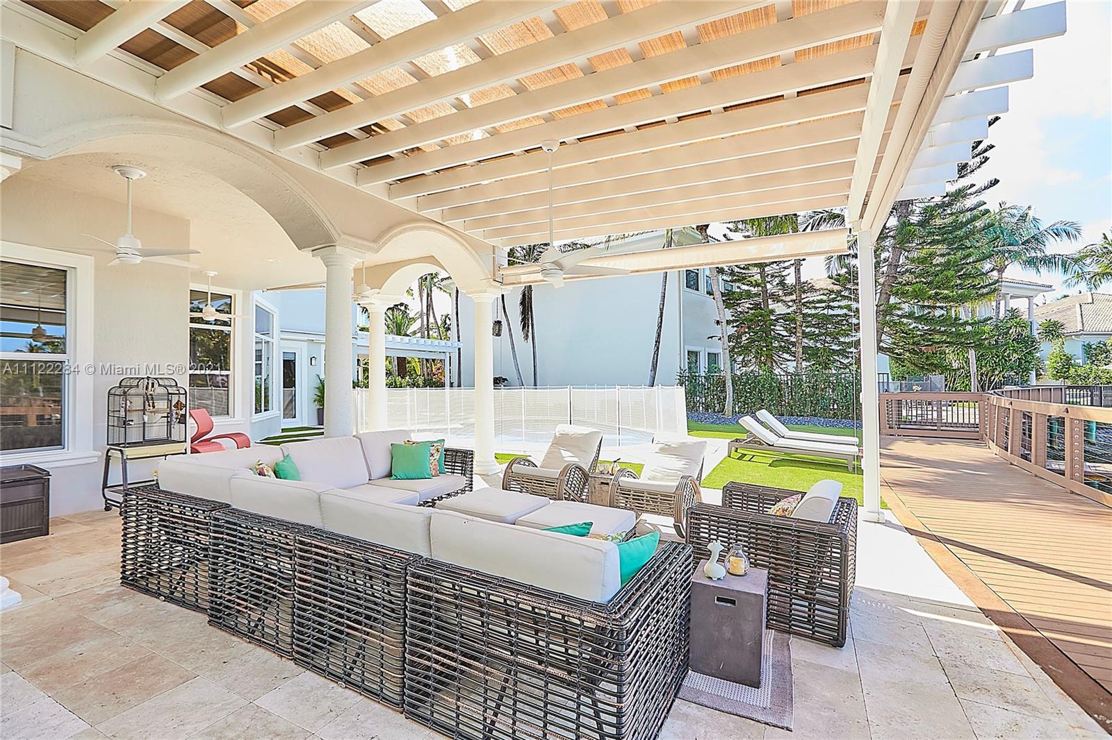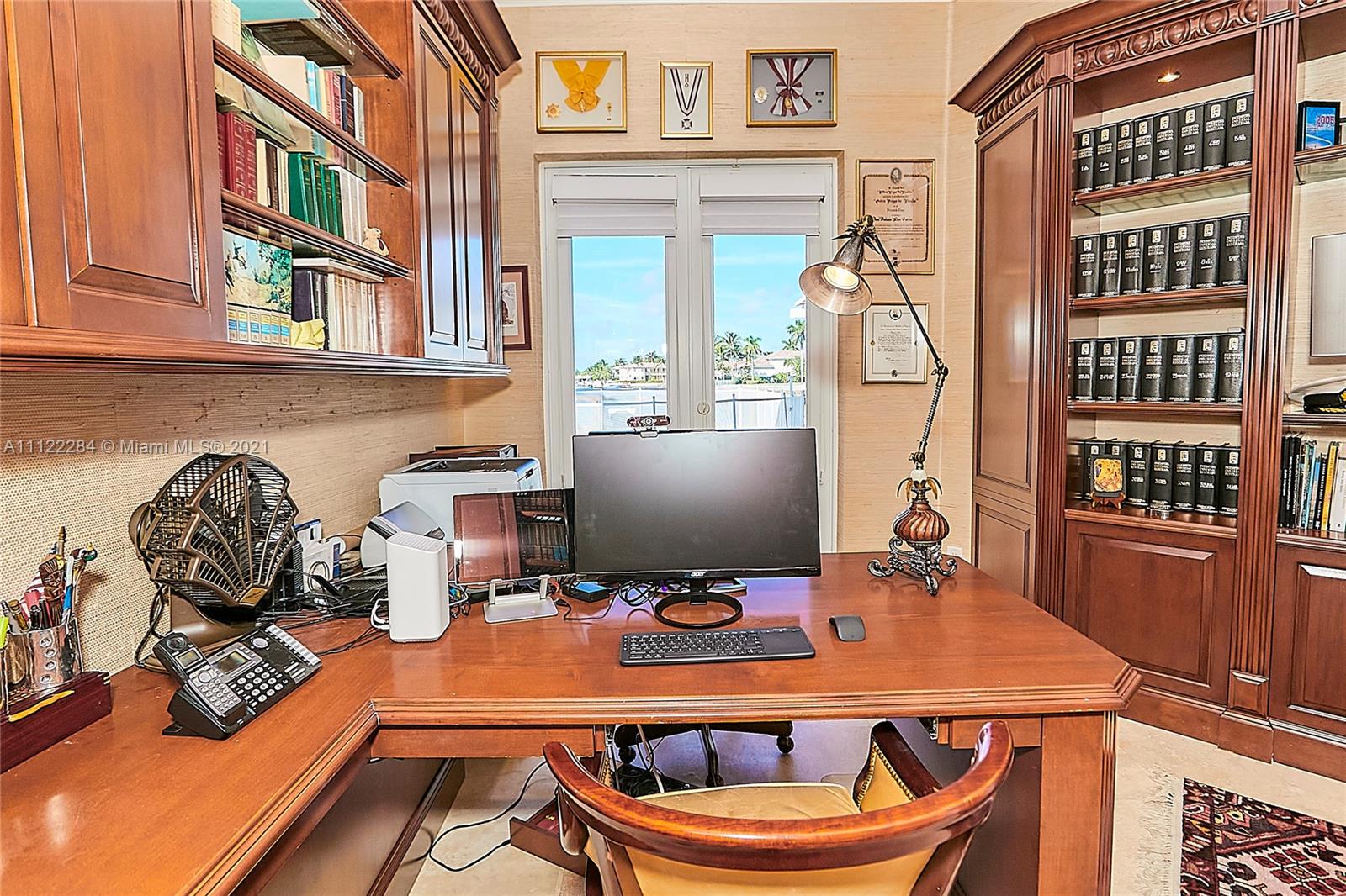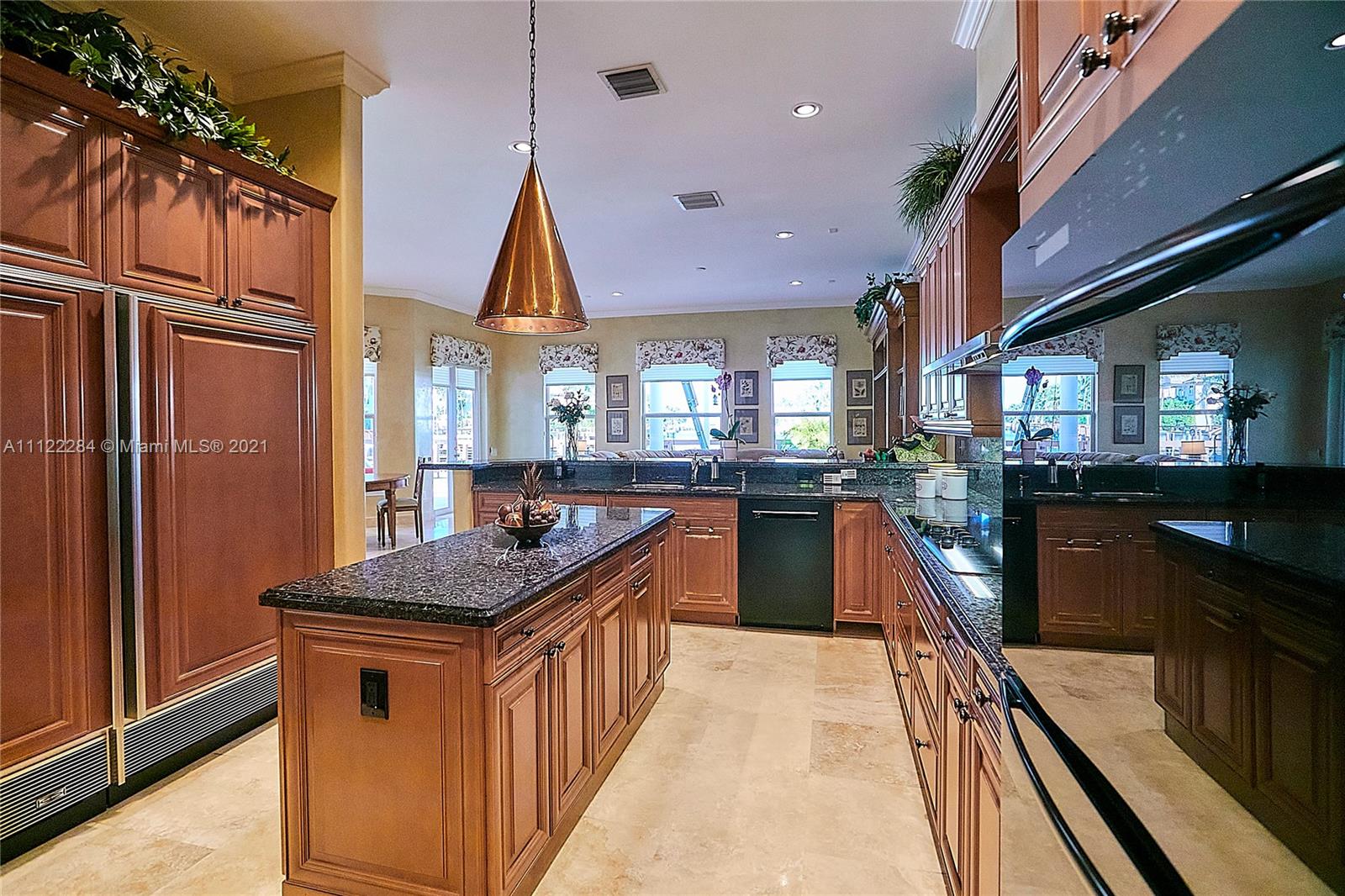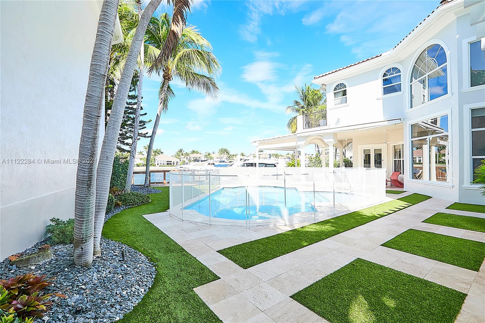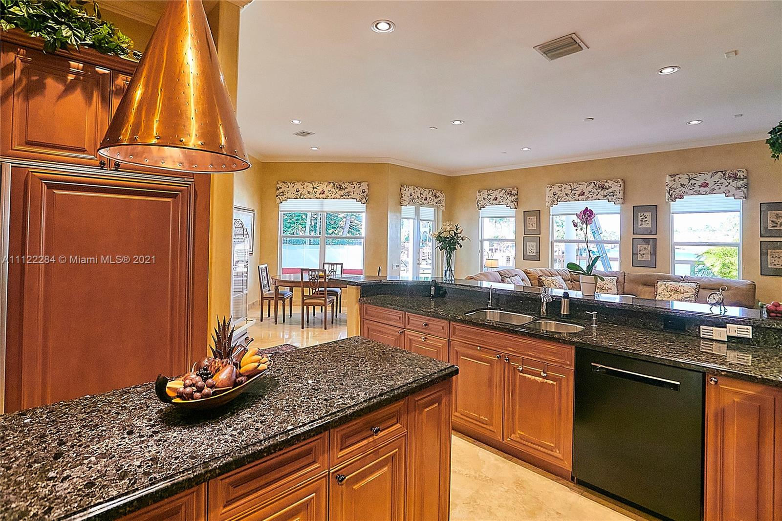 UNIQUE AND EXQUISTE WATERFRONT PROPERTY, HARBOR ISLAND. COMMODORE ESTATE. HOLLYWOOD. FL. 70 feet over the bay plus a dock where 2 boats up to 50 ft could be moored. No bridges to the Atlantic Ocean, Corner lot. 5 Bedrooms with en suite bathrooms plus 2 studios. Large windows, waterfront views, double high ceilings in the reception area, sub zero fridge and separate freezer, top of the line appliances, kitchen island and wine cooler, granite countertops, adjacent butler corner and large pantry, formal dining and family area with informal dining over water views all around. Magnificent outdoor area and fixtures, climatized saltwater pool, summer kitchen and 2 pergolas for “al fresco” enjoyment. 3 A/C zones, 3-car garage. Saturnia floors and much more. Furniture not included.