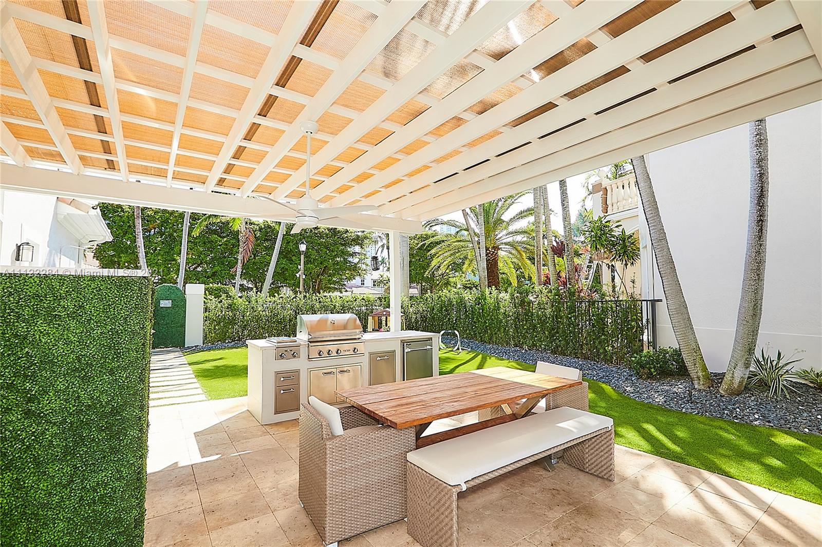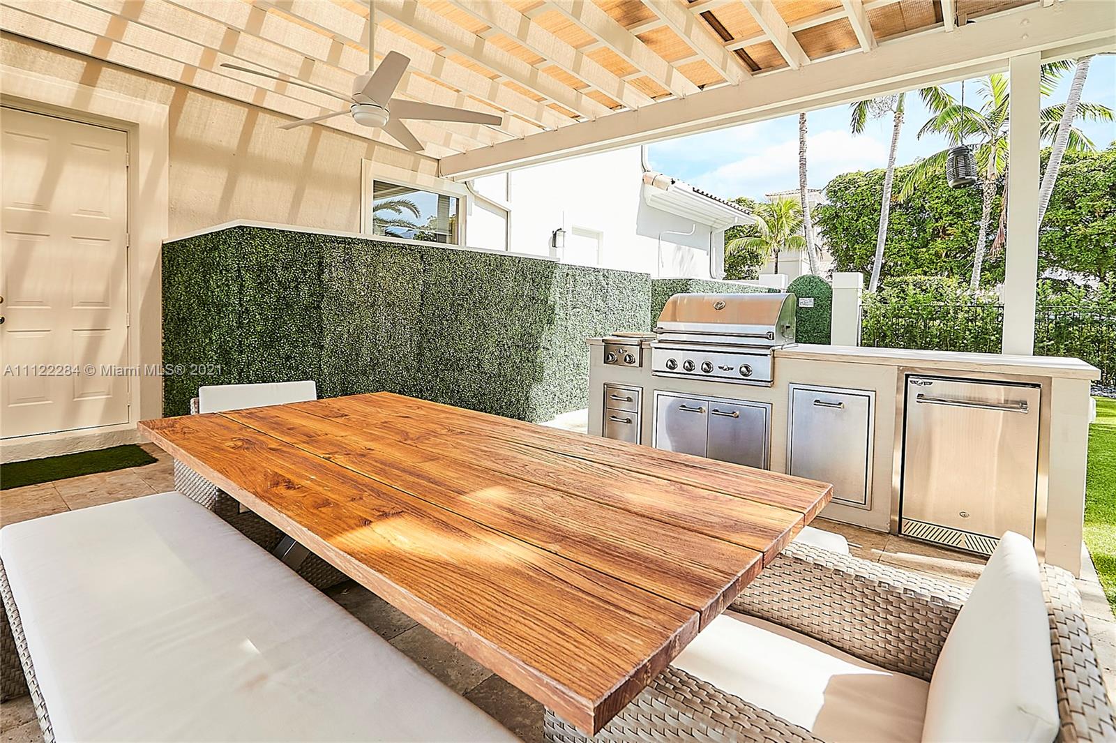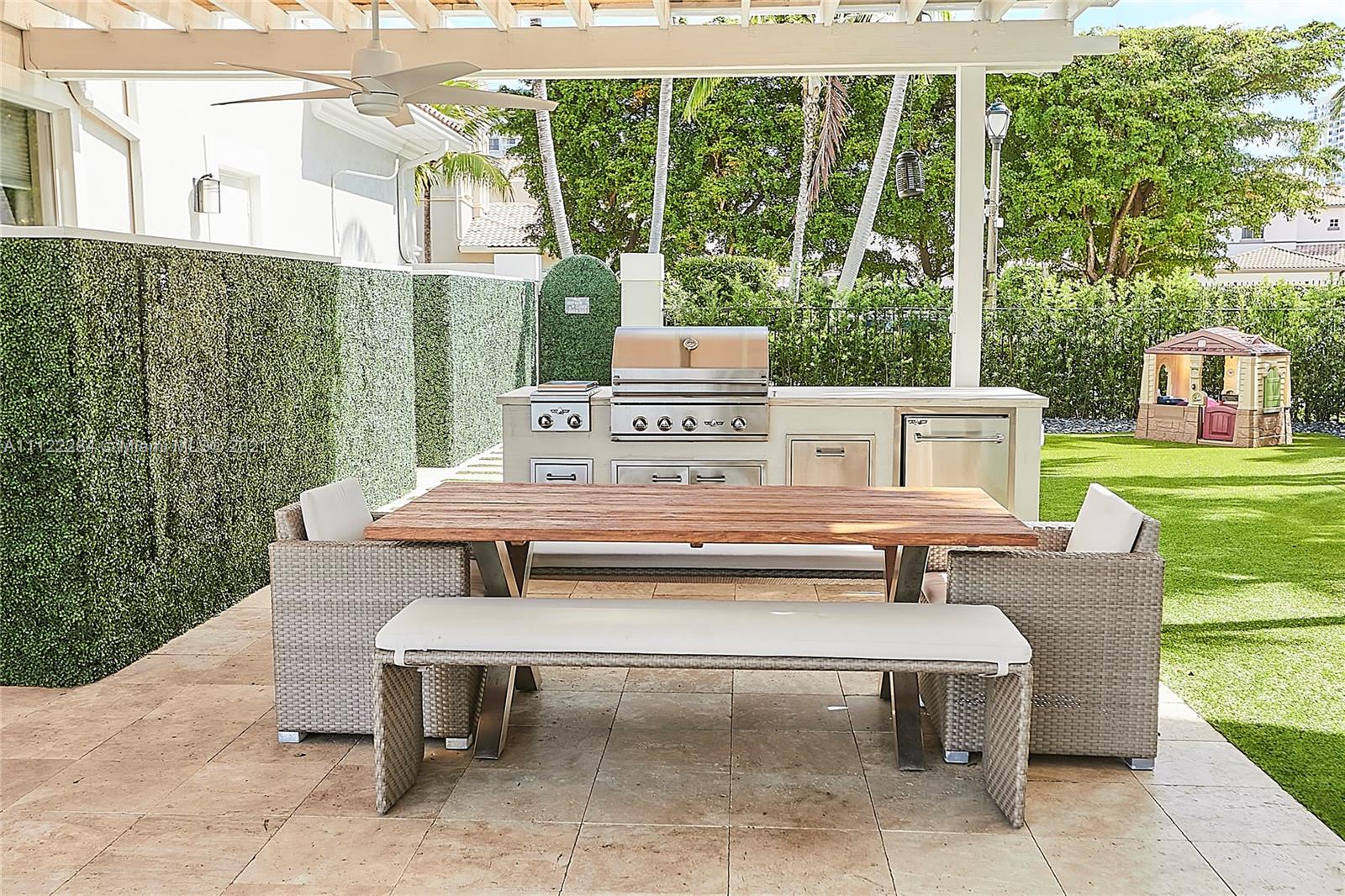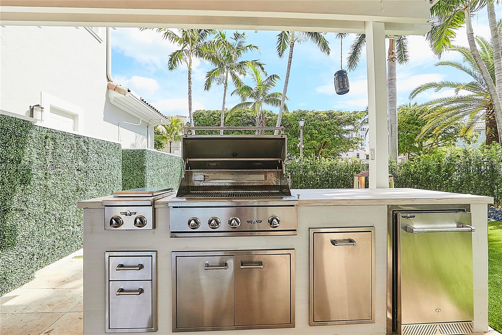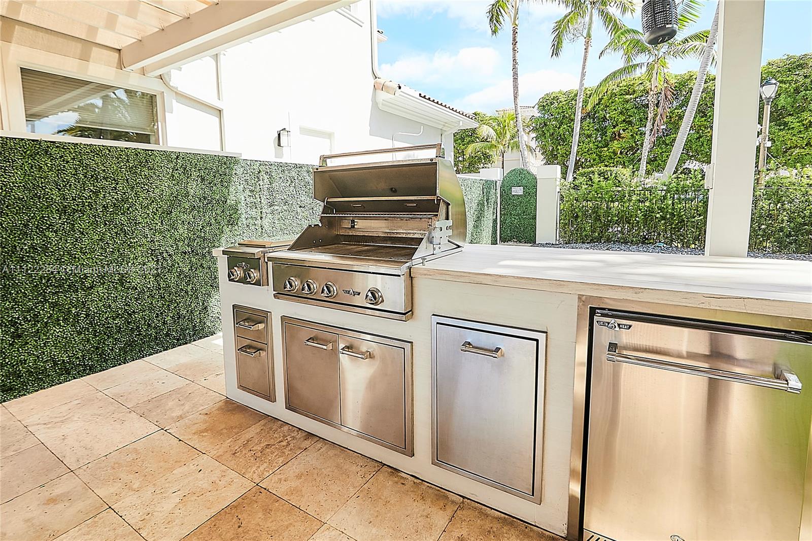 UNIQUE AND EXQUISTE WATERFRONT PROPERTY, HARBOR ISLAND. COMMODORE ESTATE. HOLLYWOOD. FL. 70 feet over the bay plus a dock where 2 boats up to 50 ft could be moored. No bridges to the Atlantic Ocean, Corner lot. 5 Bedrooms with en suite bathrooms plus 2 studios. Large windows, waterfront views, double high ceilings in the reception area, sub zero fridge and separate freezer, top of the line appliances, kitchen island and wine cooler, granite countertops, adjacent butler corner and large pantry, formal dining and family area with informal dining over water views all around. Magnificent outdoor area and fixtures, climatized saltwater pool, summer kitchen and 2 pergolas for “al fresco” enjoyment. 3 A/C zones, 3-car garage. Saturnia floors and much more. Furniture not included.