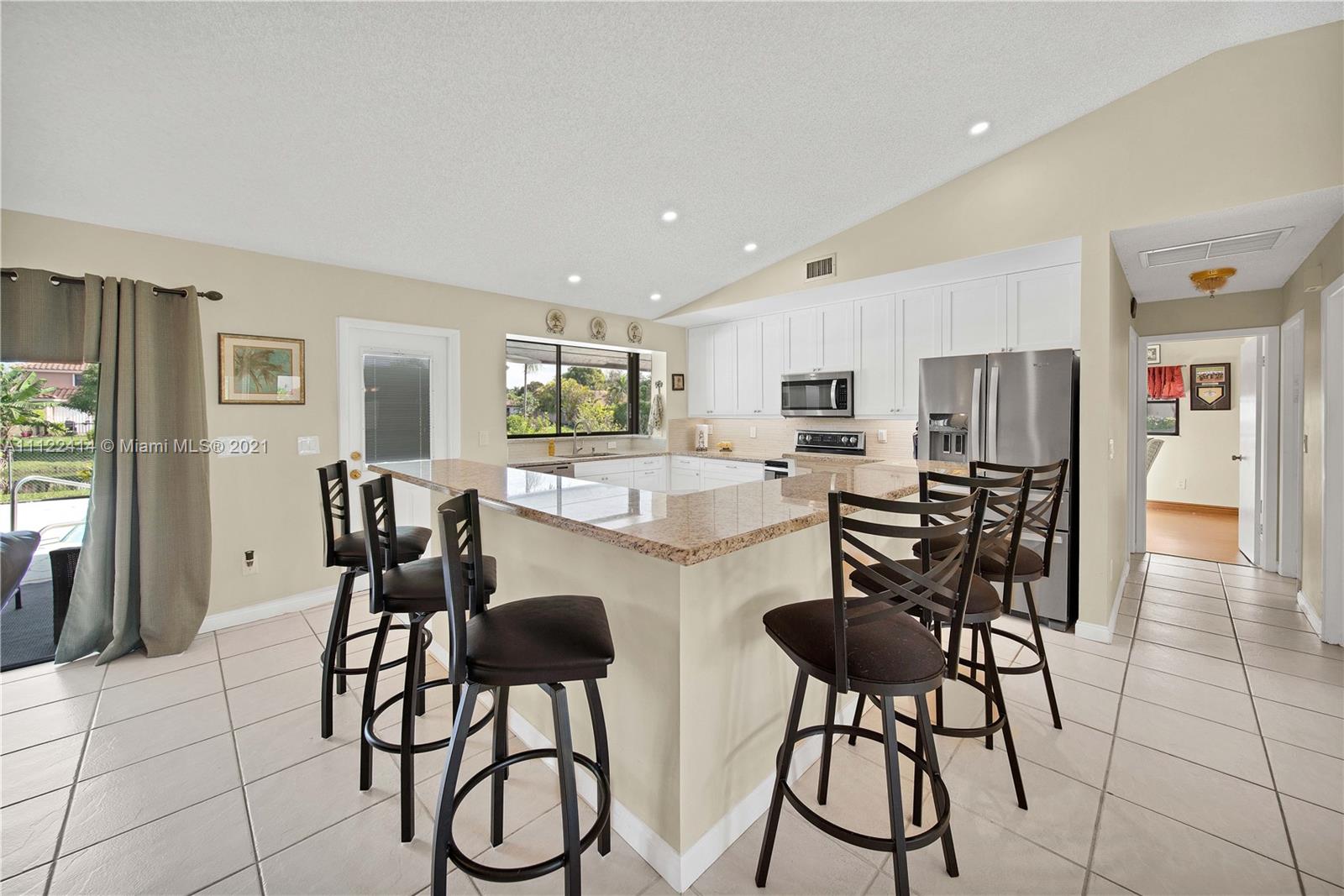 You'll love this meticulously kept home! Located on a quiet interior street in Ivanhoe, this lakefront pool home has a modern, open floor plan. Gorgeous recently renovated kitchen features a huge breakfast bar, stainless appliances including a double oven, granite countertops, small appliance elevation platform, and a great view of the pool and lake. The spacious master bedroom has two walk-in closets and an en suite bathroom with double vanities. Living areas with ceramic tile; all bedrooms with newer waterproof laminate. 4th bedroom has a functional Murphy bed and a walk-in closet now used as a private office (easy to convert back). Covered patio. 2-zone A/C. Maintenance only $150 a year. EXCELLENT SCHOOLS! Great location with easy access to i-75, shopping, restaurants, airports,etc.