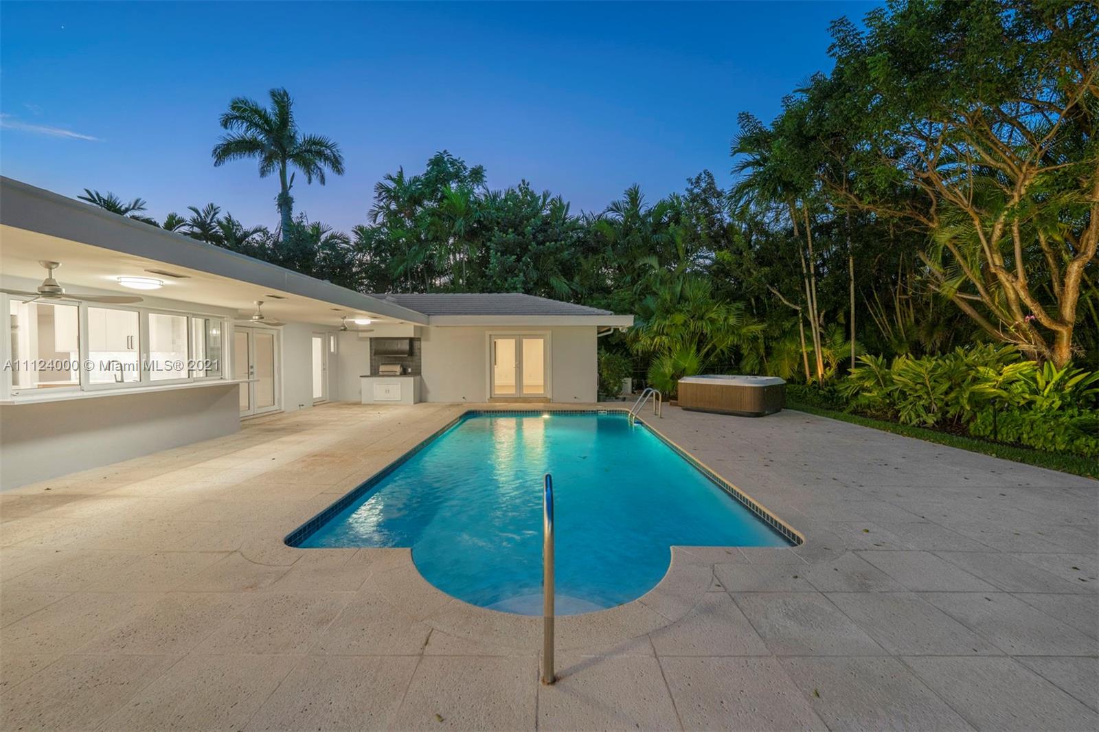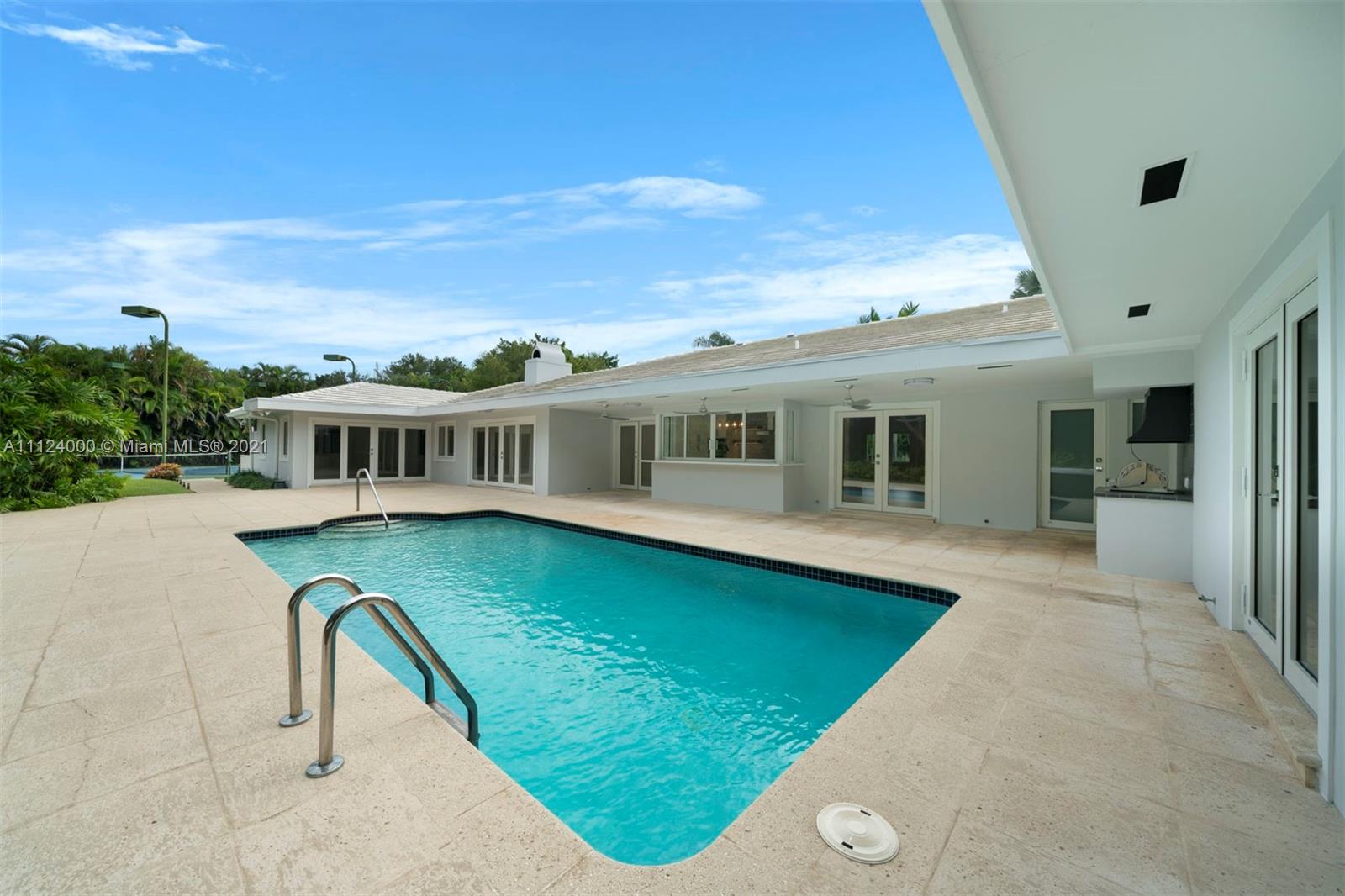 Beautiful and completely renovated 5,069 Sq. Ft. 5 bedroom, 3.5 bath home in a peaceful cul-de-sac community. Natural light illuminates the entire floor plan, including a beautifully scaled living room with stone fireplace, formal dining room and family room. The chef’s kitchen has custom modern cabinets, quartz countertops, high-end appliances and breakfast area overlooking a large sparkling pool. The main suite is a spacious retreat, with an adjacent area ideal for a private office or den, bathroom with double vanities and separate modern shower and bathtub. Other highlights include an outdoor jacuzzi, lighted tennis court, covered patio with built-in barbeque grill, tropical landscaping, two-car garage, and two additional rooms with separate entrance, for use as buyer determines.