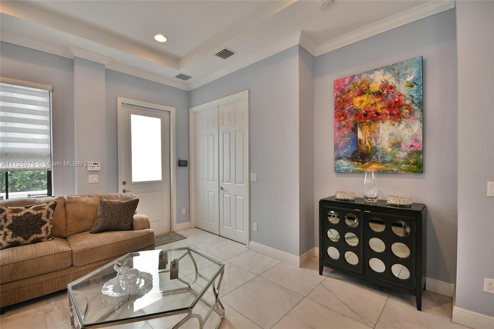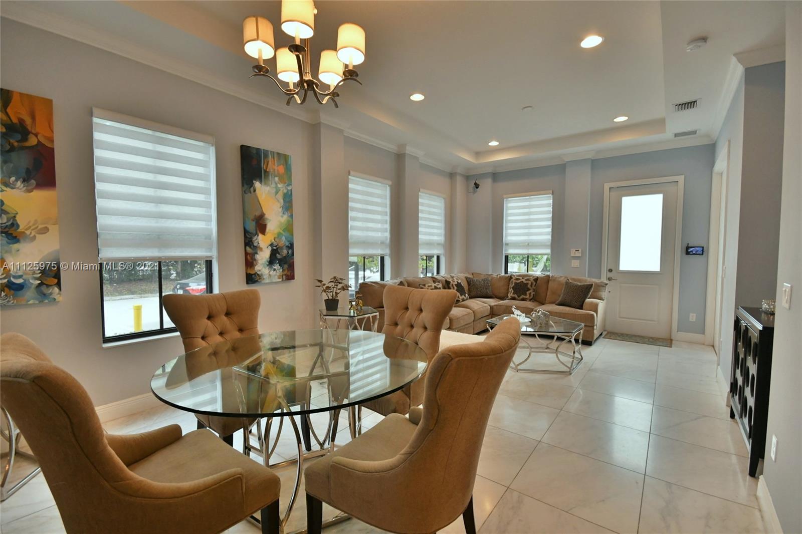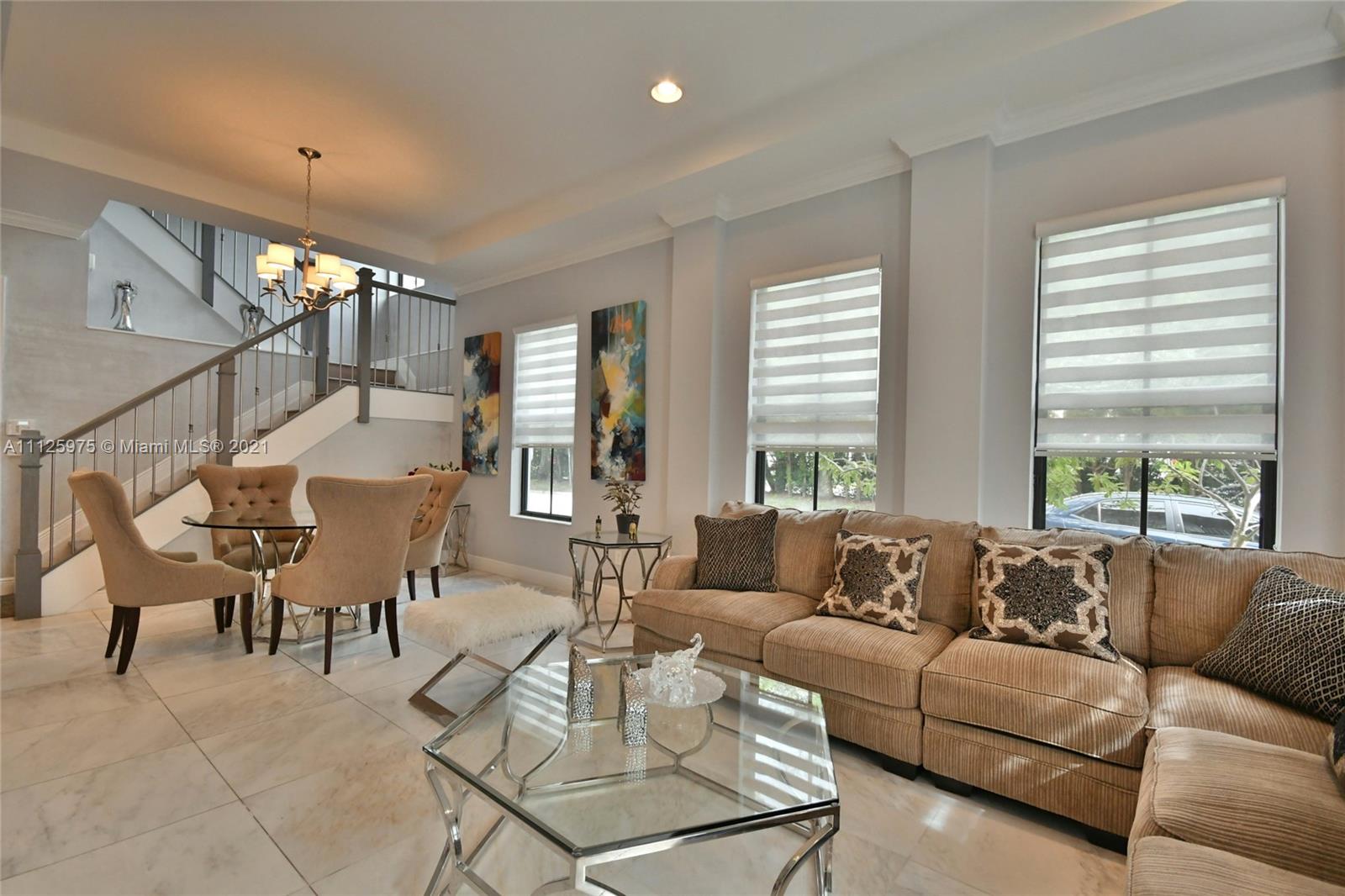 Bright, Homely and Spacious 4 bed/3 bath 2-story Corner Townhouse in the heart of Downtown Doral. Cozy Porch opens up to the High Ceiling Living-Dining area. Marble and Wood flooring wrap around the complete space. One Bedroom and one full Bathroom downstairs are very convenient for many uses. This property features High Impact Windows and Doors, Marble countertops & Top of the line Stainless Steel Appliances, Freshly painted huge 2-car Garage. Laundry Room with GE Washer & Dryer and Mop/Multi use side Sink located upstairs. Enjoy the quiet and cozy Community Pool a few steps from the property as well as one block away from the finest Charter School. Very Low Assoc Maintenance. Please contact the Listing Agent to accommodate the showings of this magnificent property/unique opportunity.