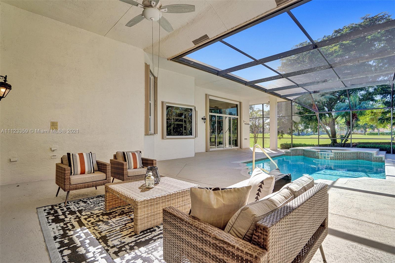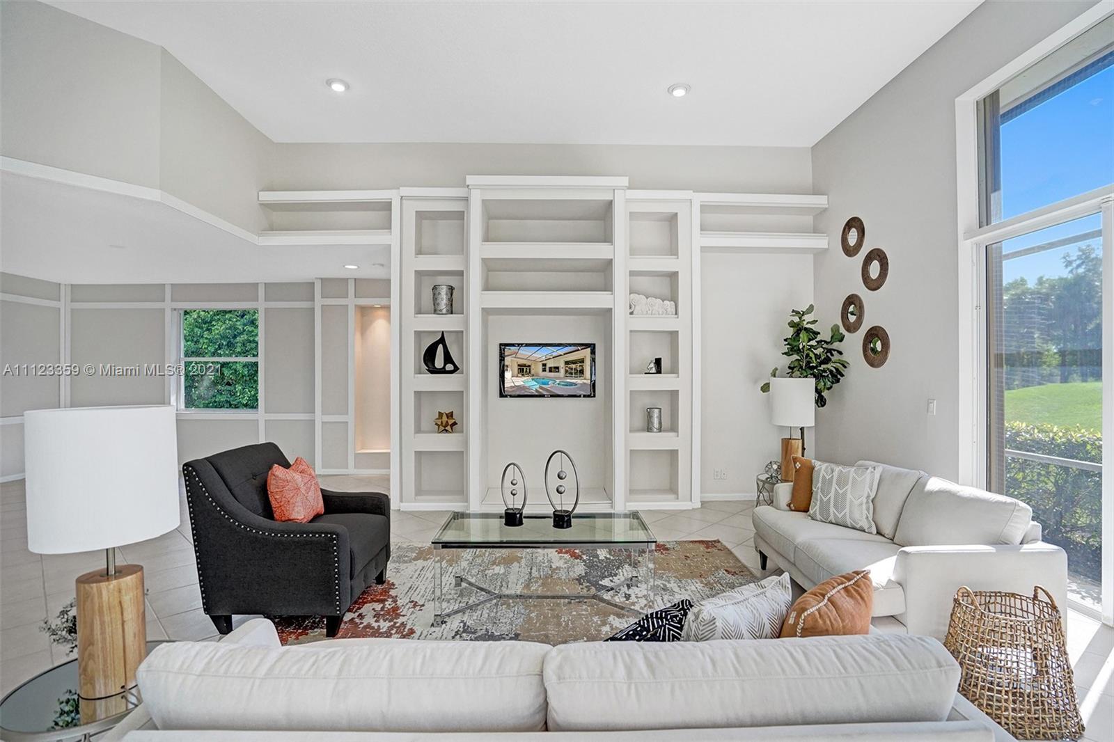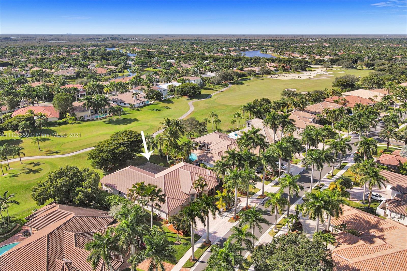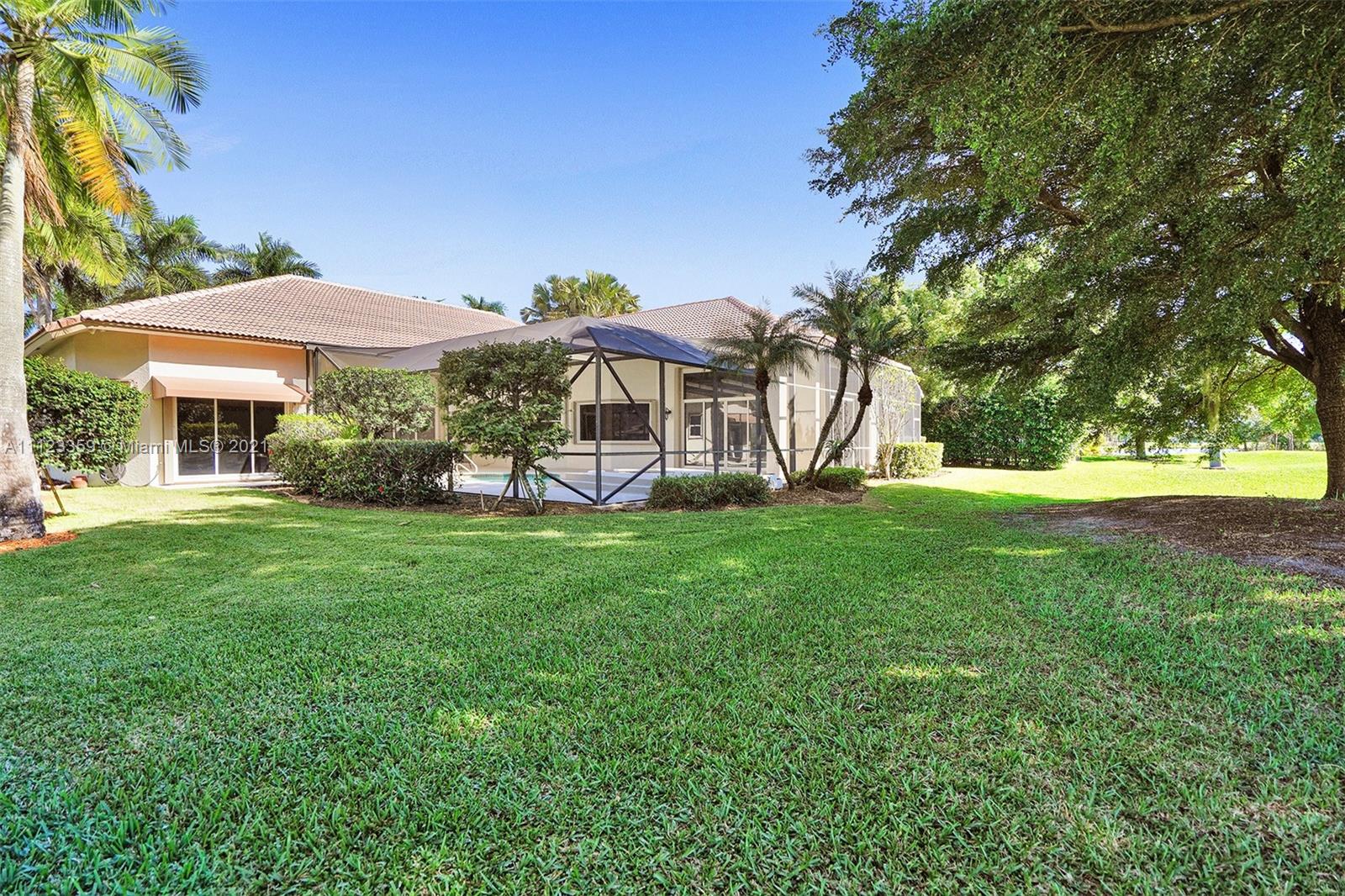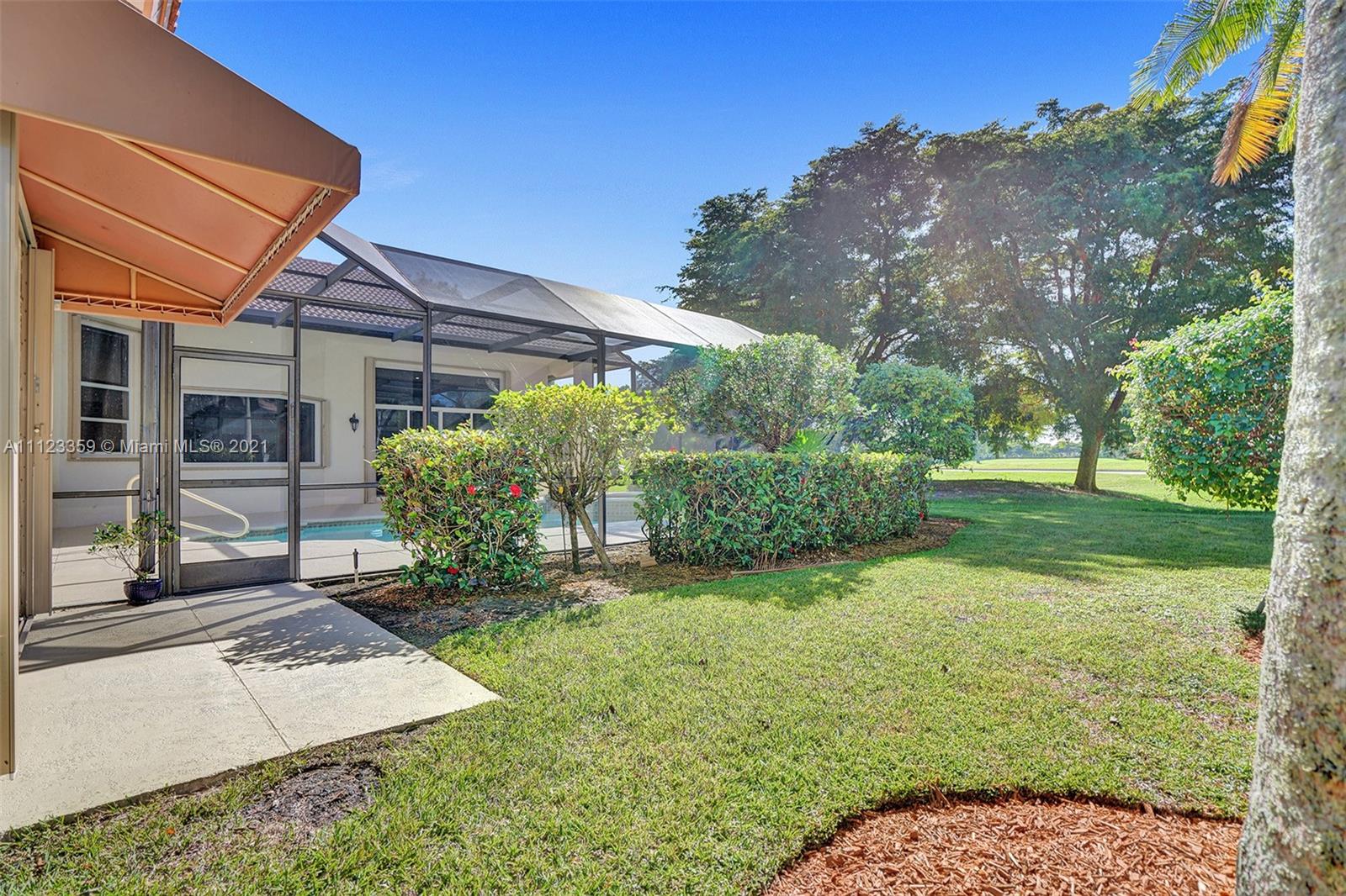 TUCKED ON A ROYAL PALM TREE LINED STREET. THIS MAGNIFICENT HOME BACKS TO GOLF WITH A SCREENED PATIO WITH POOL AND SPA. OVERSIZED 15,046 SQUARE FOOT LOT TO ENJOY. GRAND CIRCULAR PAVER DRIVEWAY WELCOMES YOU HOME. FULL ACCORDION PROTECTION. CUSTOM ONE STORY FRESHLY PAINTED IN TODAY'S NEUTRAL COLORS. PRIMARY BEDROOM HAS FRENCH DOORS TO THE POOL AND PATIO. TWO SPACIOUS CLOSETS WITH A RENOVATED BATH, DUAL SINKS, OVERSIZED SHOWER. KITCHEN WITH MAPLE WOOD CABINETS AND GRANITE COUNTERTOPS. NEUTRAL TILE FLOORING THROUGHOUT LIVING AREAS. GRAND BILLIARD/PLAYROOM (CAN BE CONVERTED TO BEDROOM) PLUS CABANA BATH.