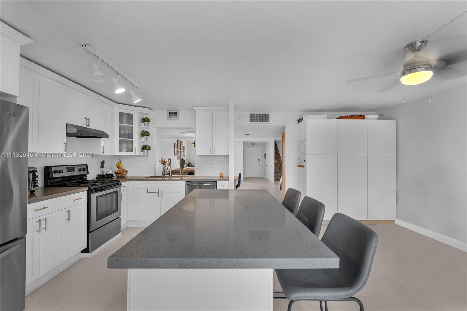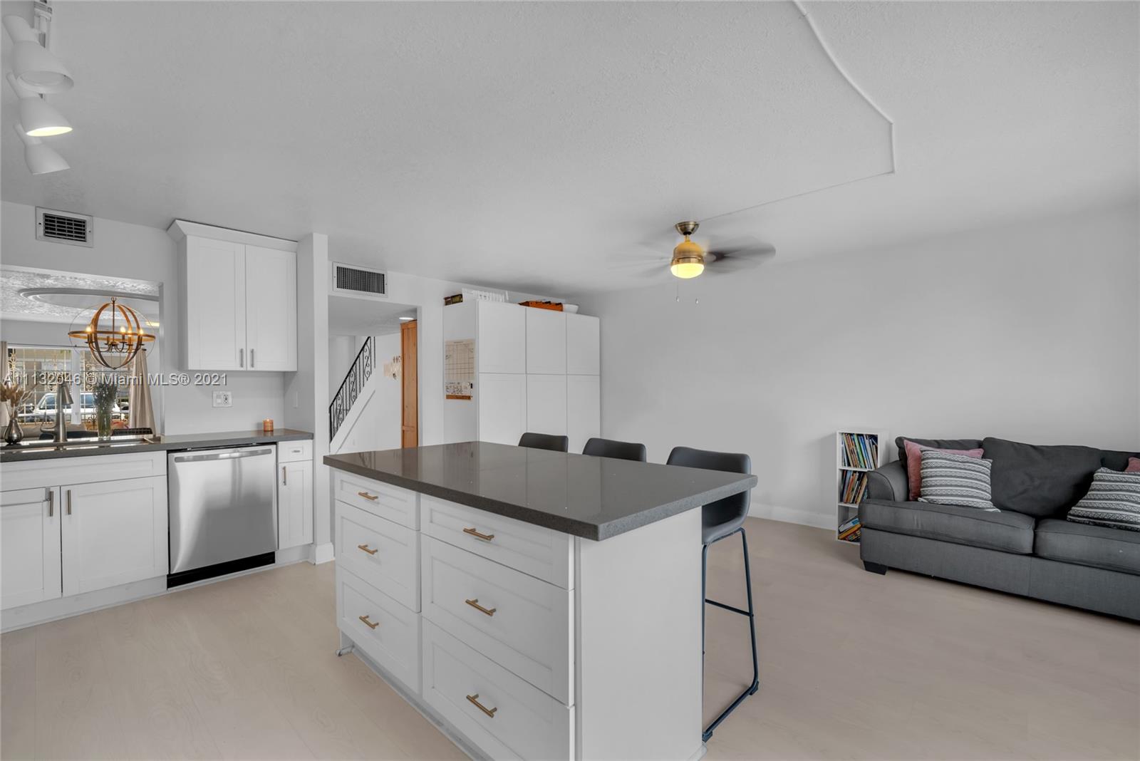 CHARM, LOCATION, CONVENIENCE AND BEAUTY is what describes this amazing townhouse with over 1,696 SQFT of living space in prime Hallandale Beach location. Featuring, 2 beds/2.5 baths, office/den (possible 3rd bedroom), front porch and patio. This beauty it’s warm, inviting and has lots of natural light. GORGEOUS and completely remodeled chef kitchen w/ quartz counter tops, stainless steel appliances, soft closing cabinets, snack-bar island and ample storage…perfect to entertain family and friends. The master bedroom is huge w/ walk-in closet and overlooks the gorgeous Joseph Scavo Park. The master bath has a combination of shower and tub. In addition, 2020 floors, accordion shutters, 2015 appliances (Dishwasher '21 and Washer '19) and privacy wood fence. CHEERFUL SETTING FOR A HAPPY HOME!