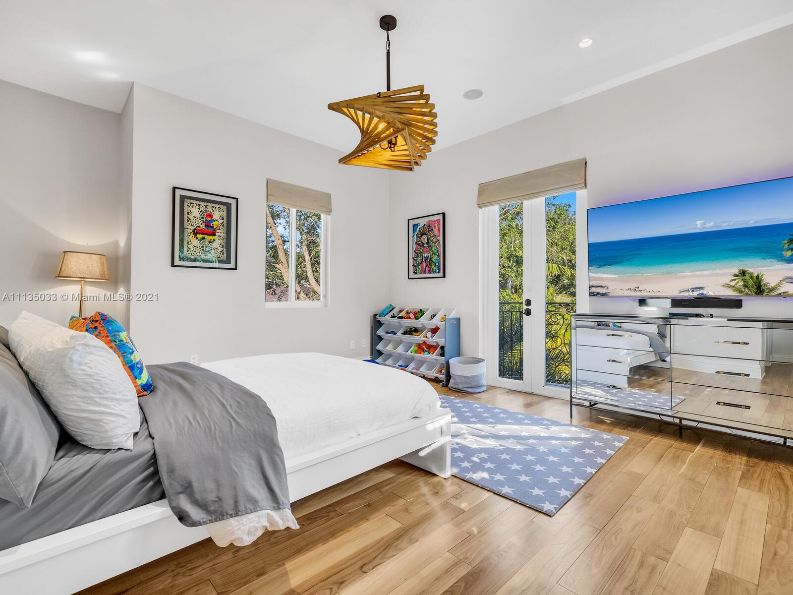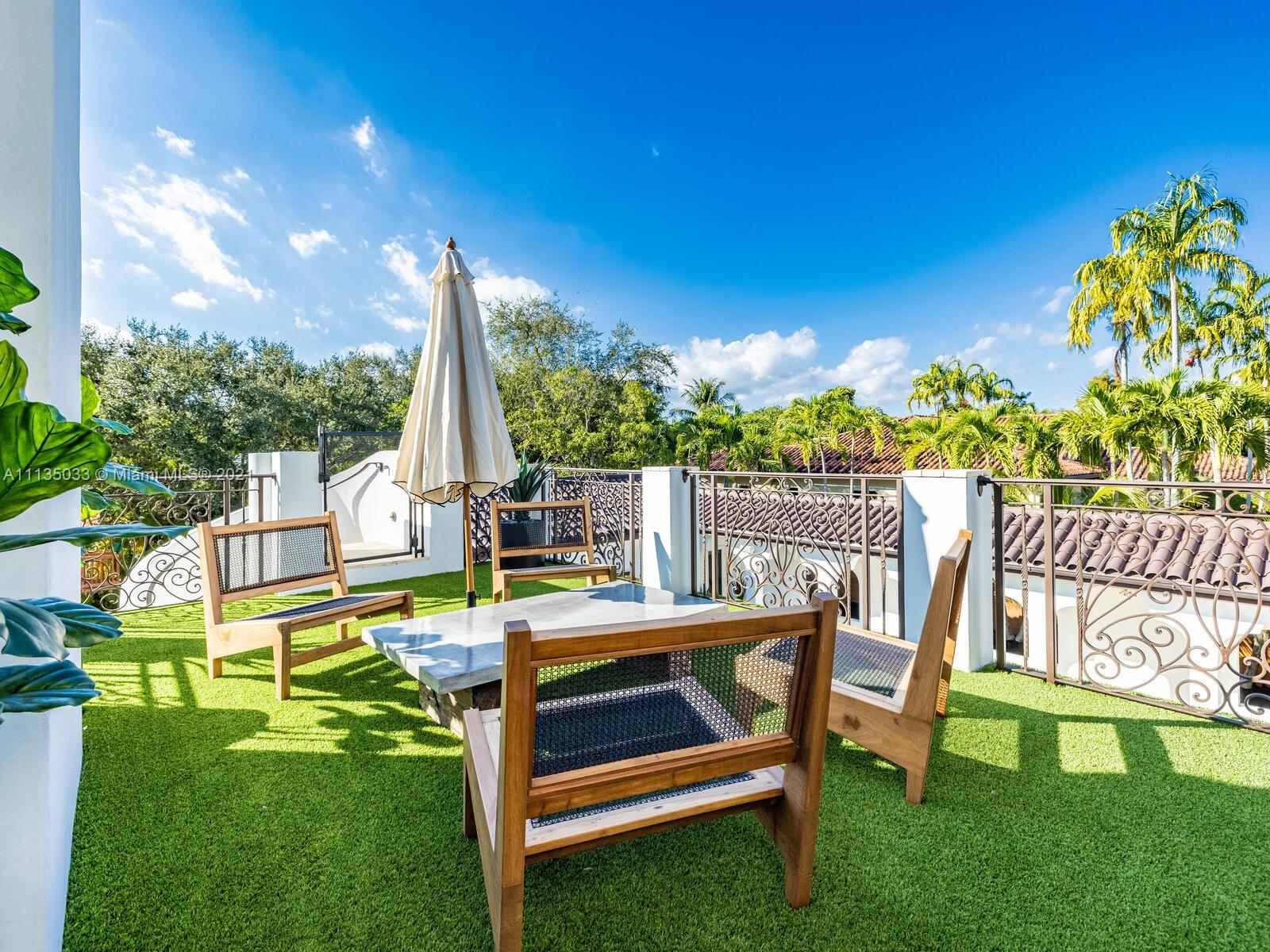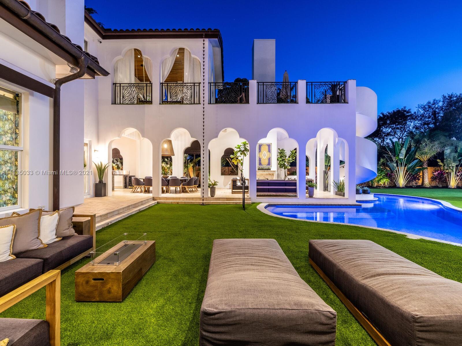 This Modern-Mediterranean resort style home is expertly designed for Miami entertaining, including a 2-bed Guest house! Impressive arrival through oversized doors lead to hacienda inspired courtyard with custom water fountain and koi pond, complete with viewing deck. Highly coveted covered outdoor entertainment area including full outdoor Mia Cuccina kitchen with top appliances. All new lush landscape, premium turf, and light system installation. Spectacular Lagoon style pool curls around stunning outdoor spiral staircase leads to oversized loggia, perfect for sunset viewings. Extensive interior renovation-all new custom designer bathrooms, surround sound movie theatre, wine bottle display, and entertainment bar to name a few. Separate living quarters and plenty of parking.Turn-key estate.