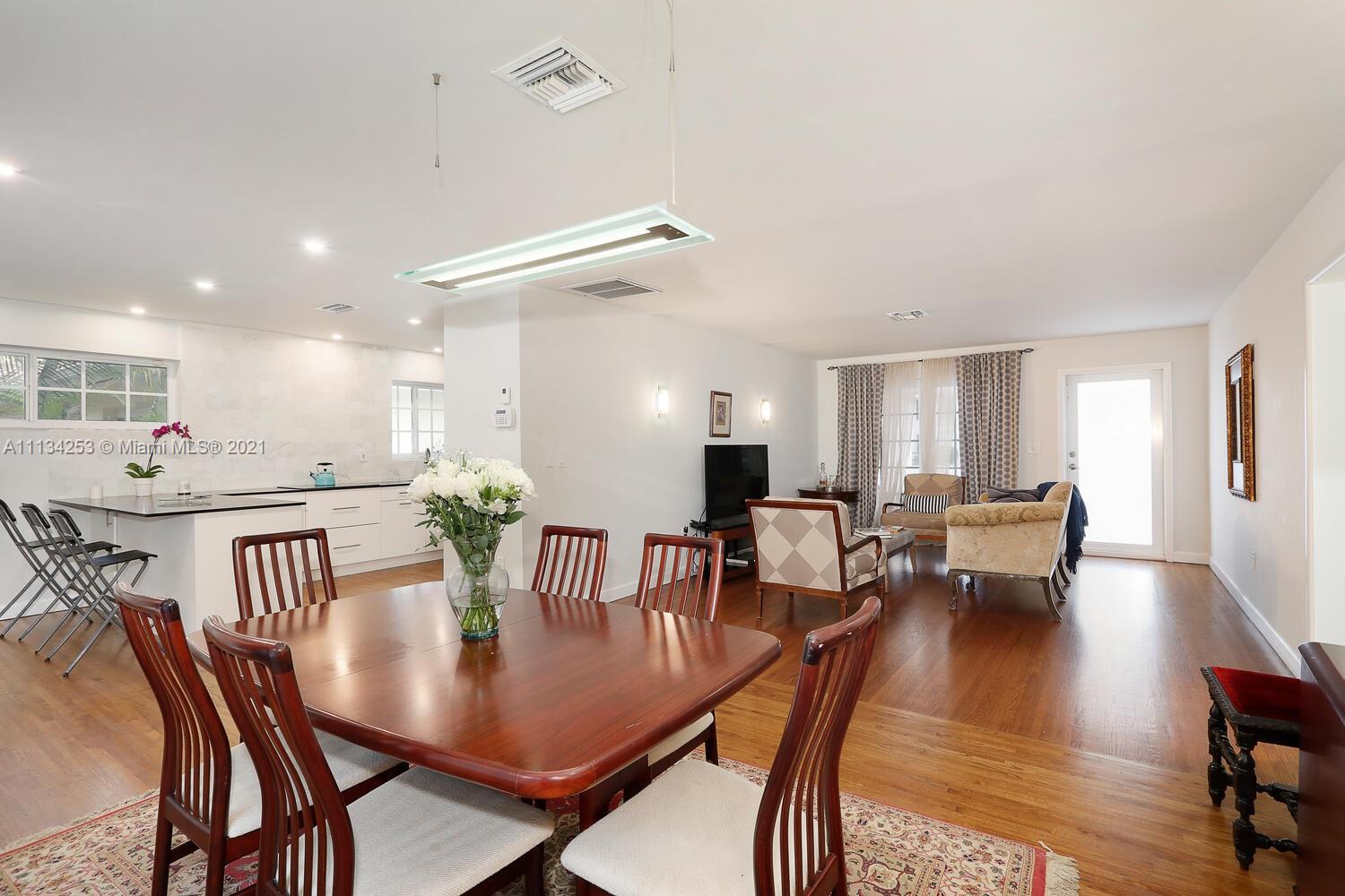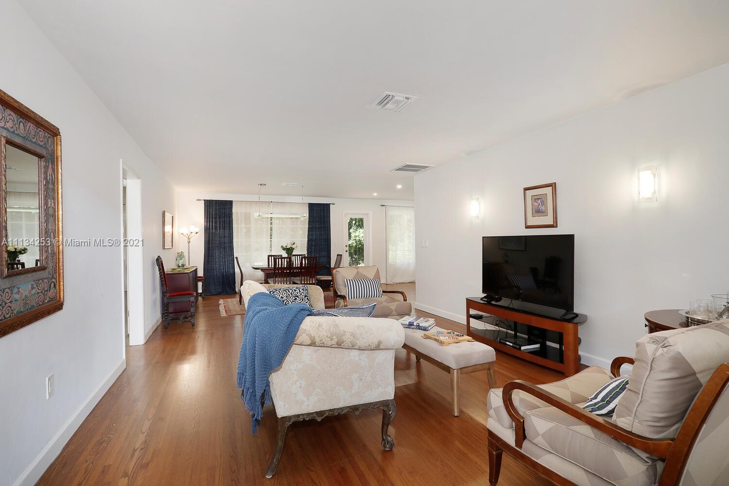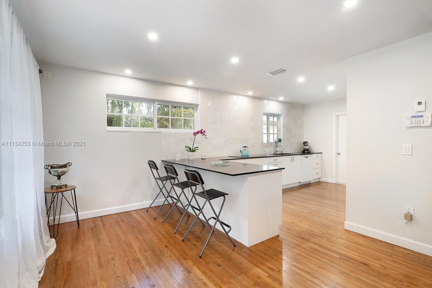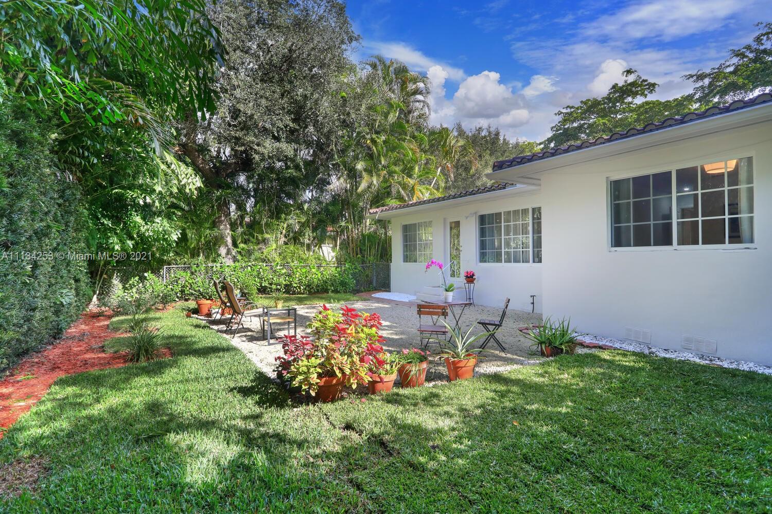 Charming home on a quiet, tree-lined North Gables street. Minutes to world-class shopping, dining & entertainment in downtown Coral Gables. Light-filled living spaces with beautiful hardwood flooring throughout. Updates include impact windows & doors, both bathrooms & AC system. New, modern-style kitchen features white cabinetry, stone countertops & breakfast bar. Enjoy outdoor living in the private back yard with lush tropical foliage & ample room to add a pool. One-car garage. Close to Coconut Grove & Miami International Airport.