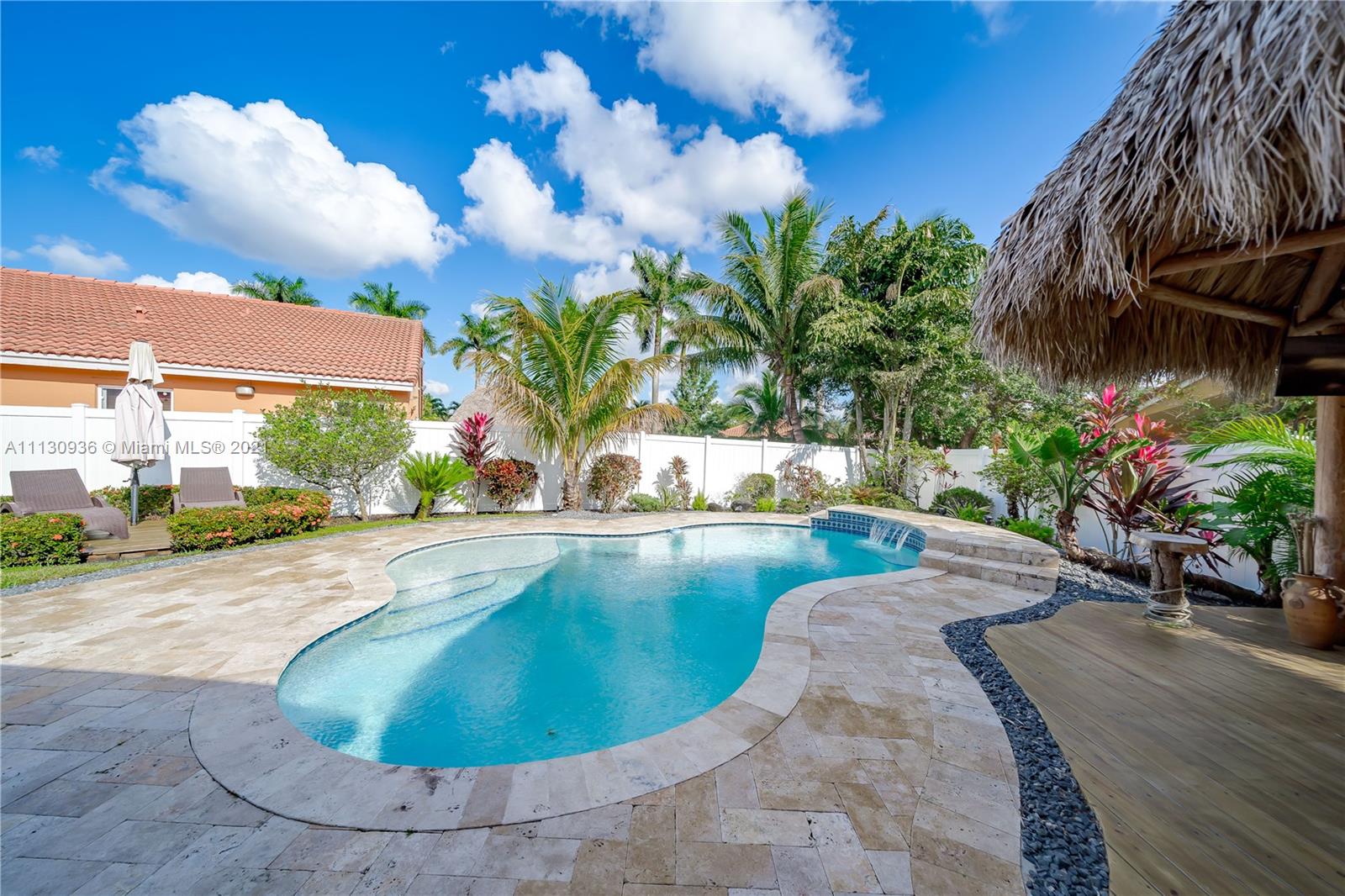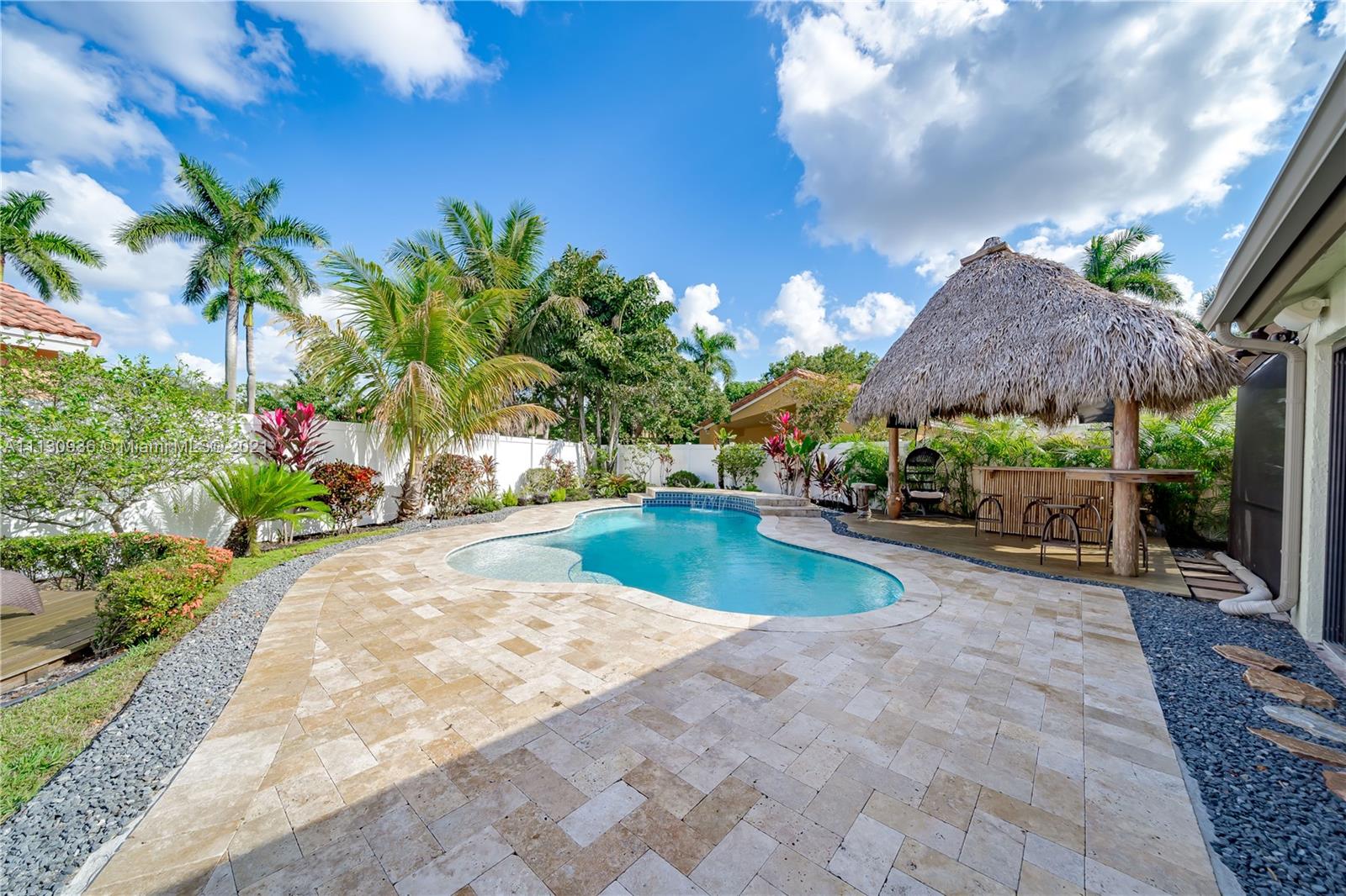 Enjoy South Florida resort style living at Somerset Country Club of Vizcaya. The beautiful remodeled pool home boasts of an open floor plan with 24 x 24 porcelain tile, wood finished tile in the bedrooms, kitchen with chocolate brown wood cabinets, breakfast bar, dual stainless steel sink, and Samsung stainless steel appliances. Impact windows and doors, custom zebra sunshades, tankless water heater. The primary bedroom offers wood tile floors, large, double door, walk-in closet and bathroom featuring exquisite tile floors and wall and frameless custom shower with dual rain shower heads. The resort style yard offers a glistening pool with color lights, a Tiki Hut with Electrical, gazebo, a sundeck and screened in lounge with ceiling fans. Tankless WH, Pool, Window, Fence 2016. AC 2017