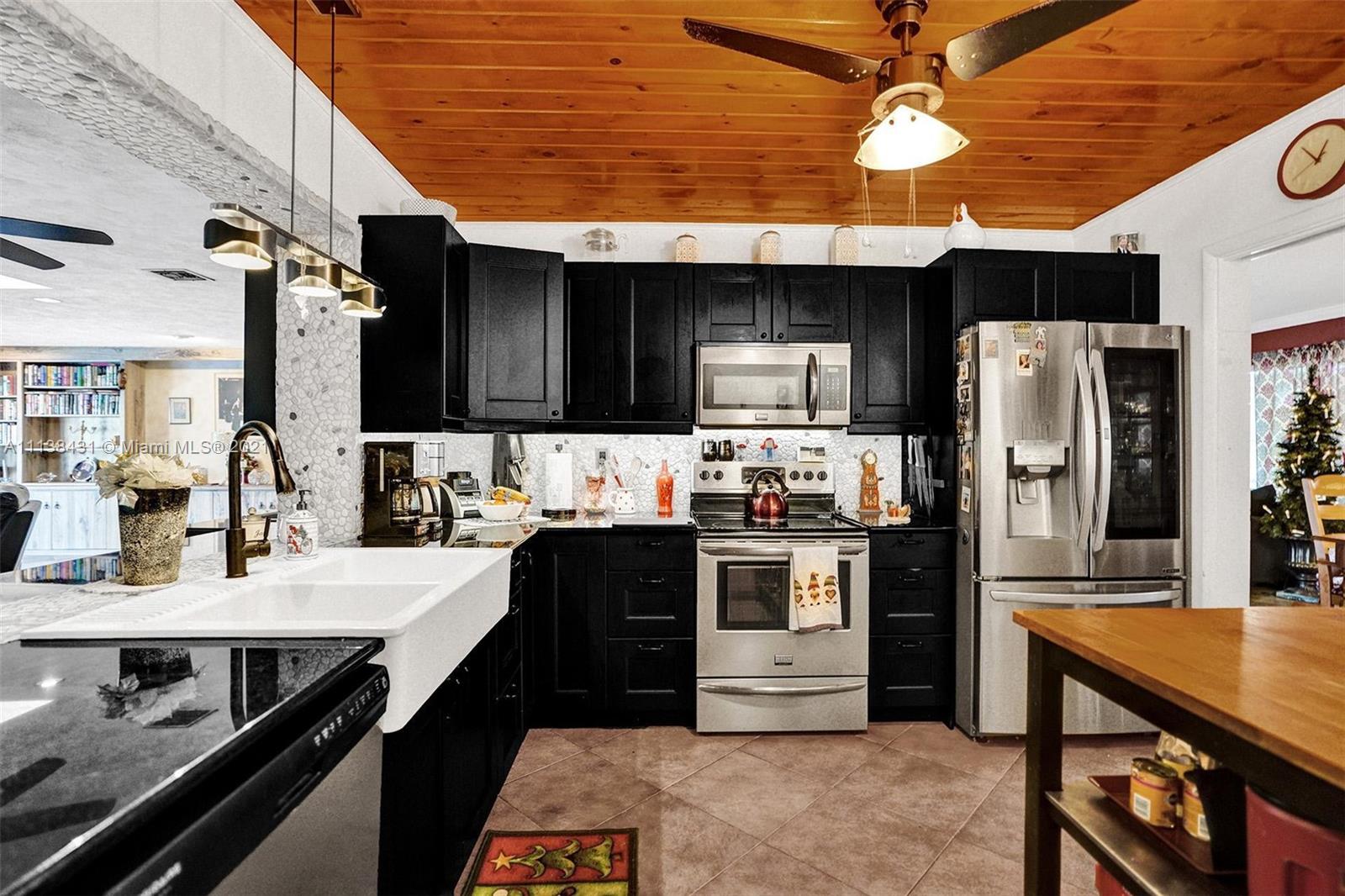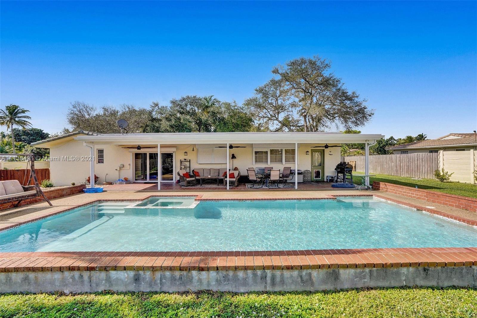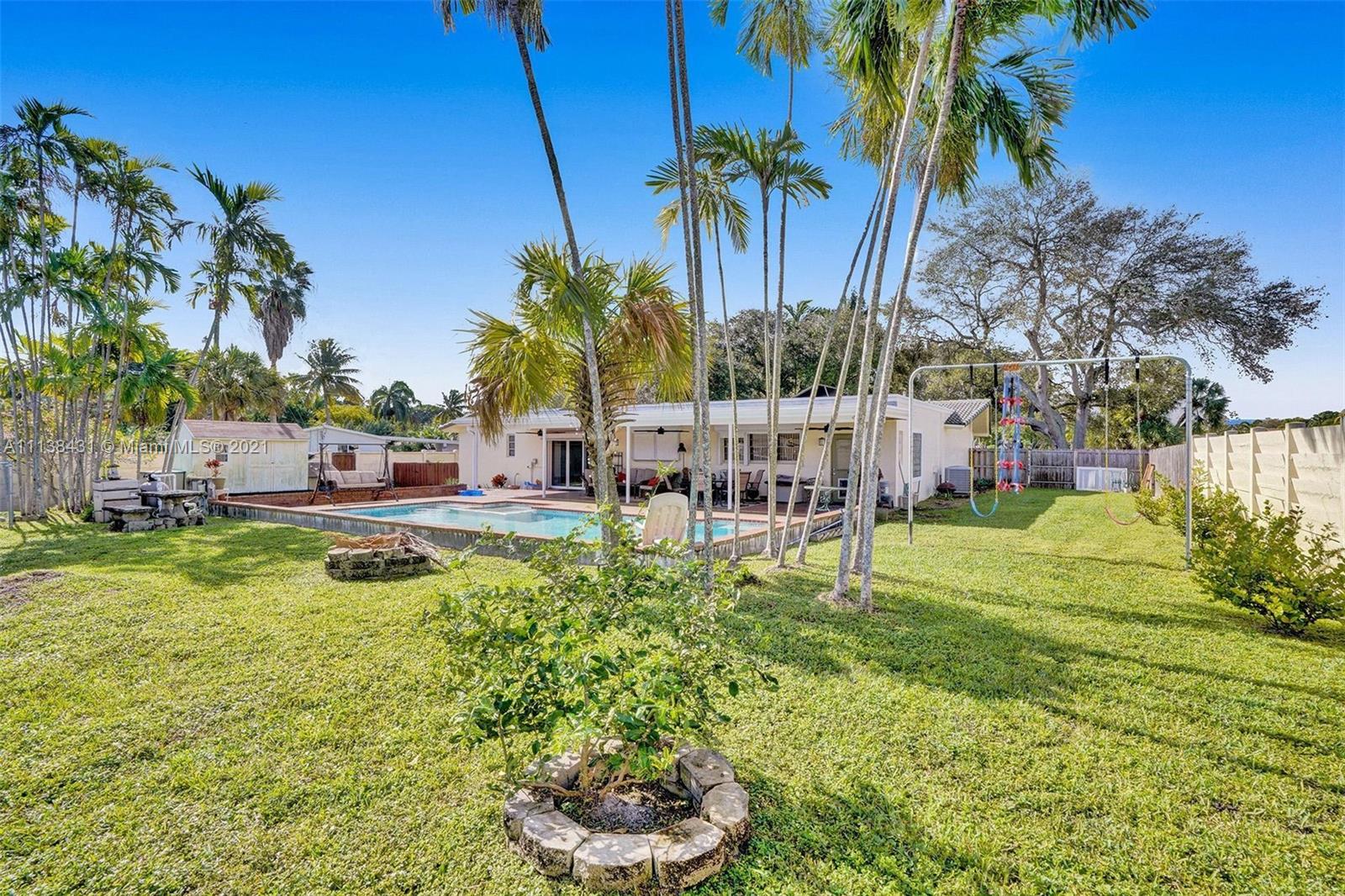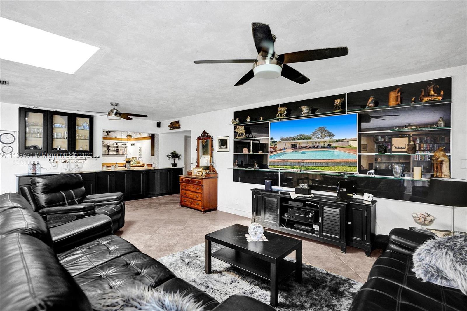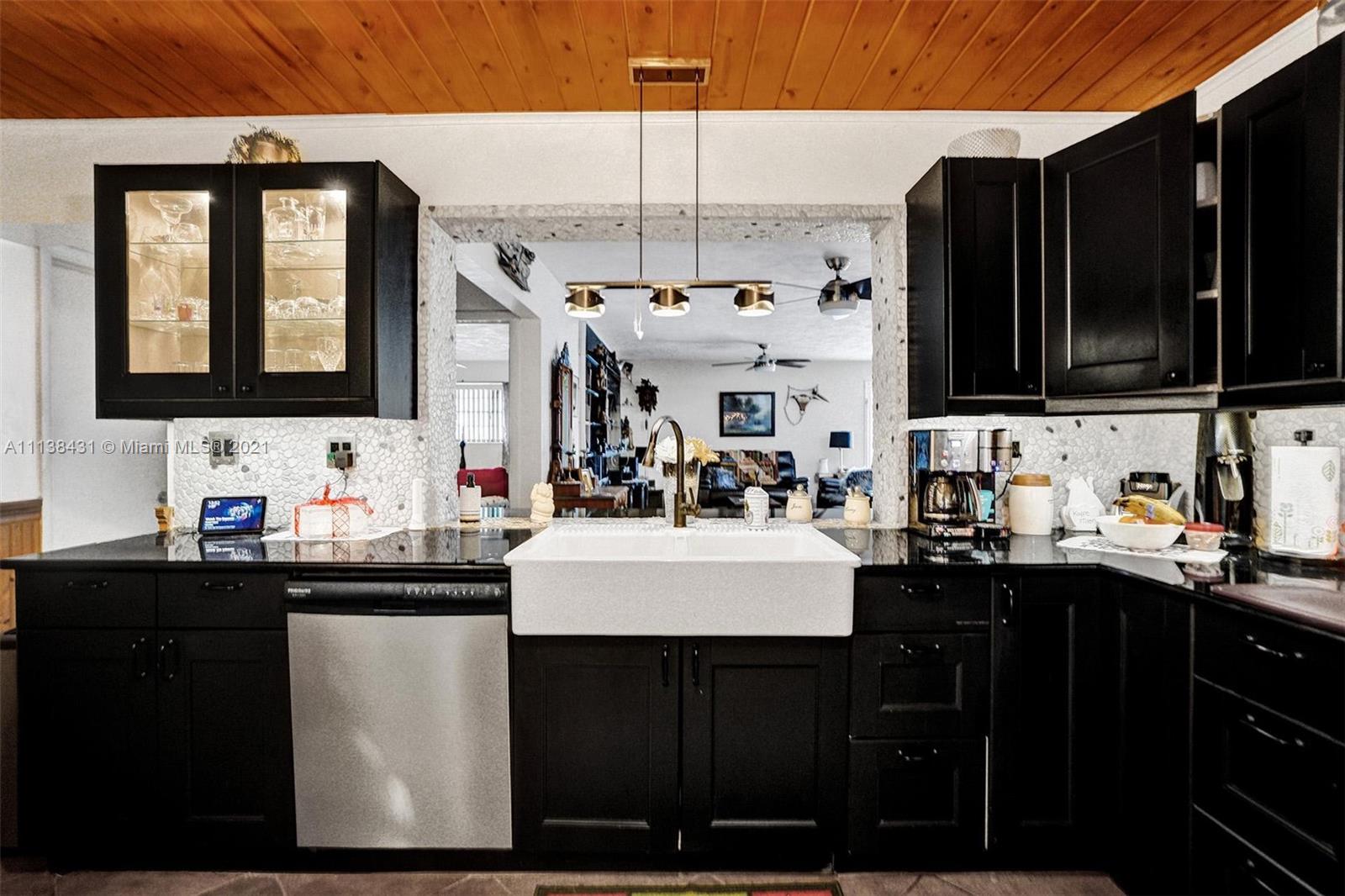 Welcome into the front living area; it attaches to the dining area with crown molding and tile flooring throughout. The unique kitchen is located around the corner, and comes with excellent upgrades including glass-front cabinets, stainless steel appliances, and exposed wood ceilings. The spacious rear living area has plenty of room to relax and unwind, and features access to the pool and patio. The primary bedroom offers tile flooring, excellent light, and a fabulous ensuite bathroom. The secondary bedrooms are ideal for accommodating guests and share a common hallway bath. Out back, float lazily in the impressive backyard pool, which is surrounded by palm trees and attached to the covered patio.