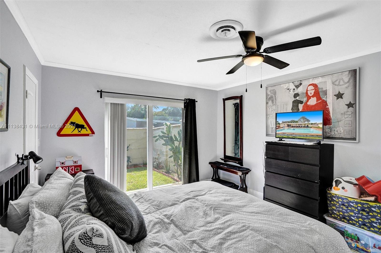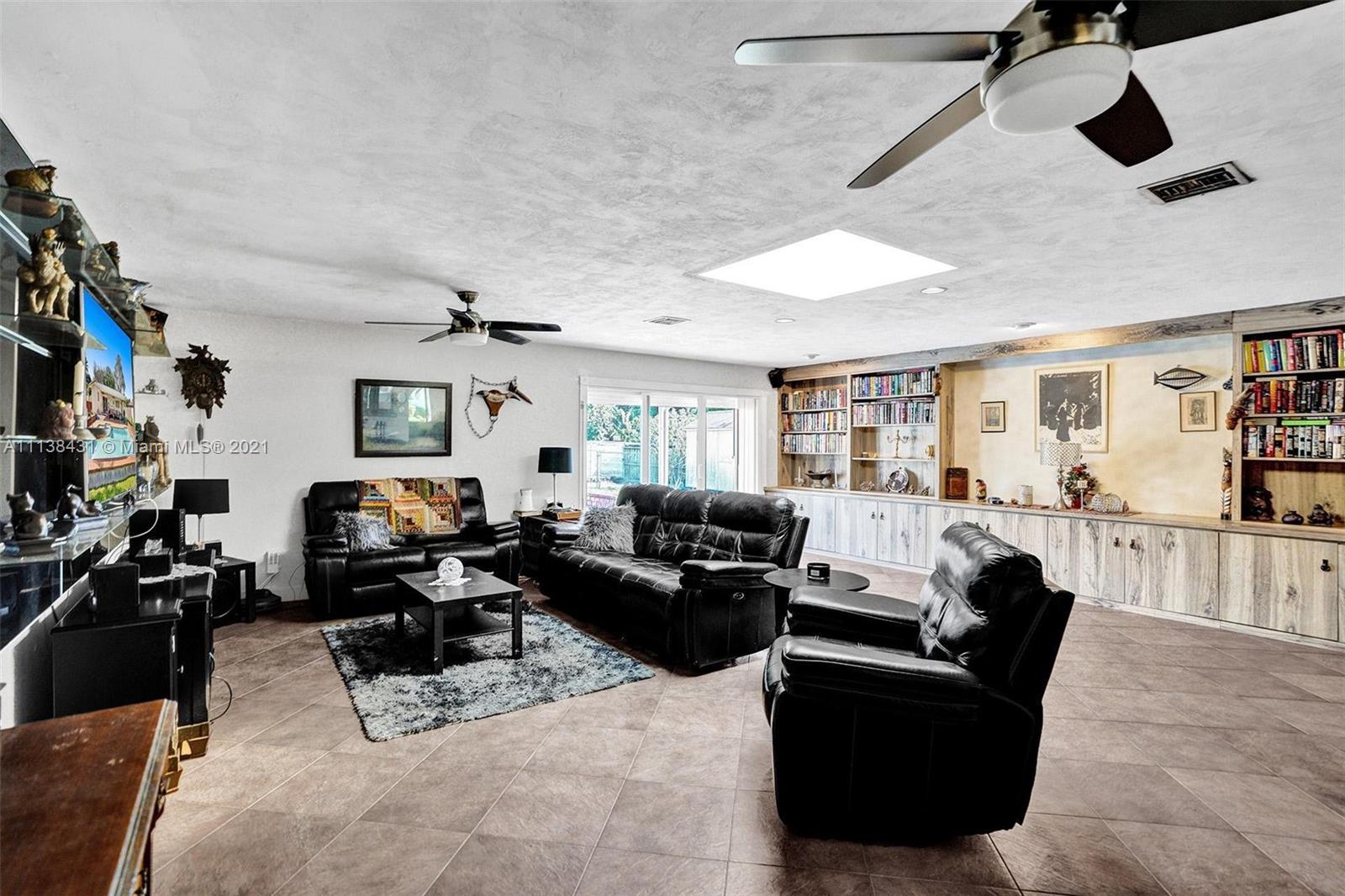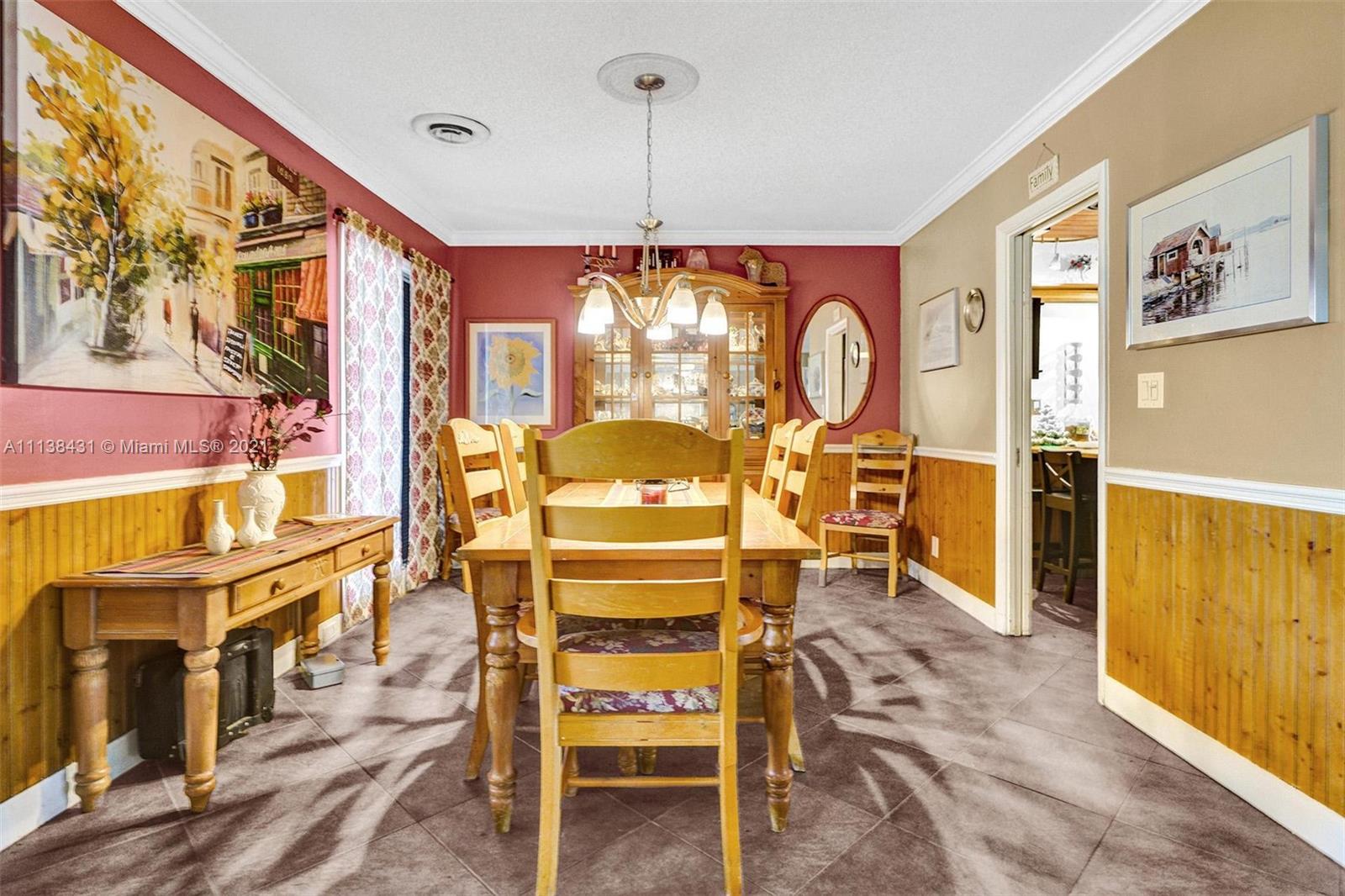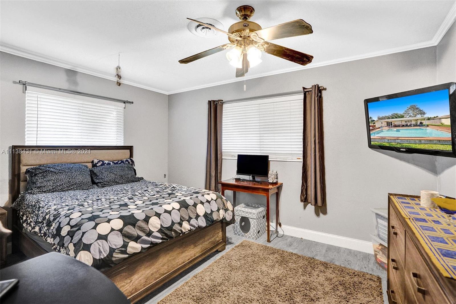 Welcome into the front living area; it attaches to the dining area with crown molding and tile flooring throughout. The unique kitchen is located around the corner, and comes with excellent upgrades including glass-front cabinets, stainless steel appliances, and exposed wood ceilings. The spacious rear living area has plenty of room to relax and unwind, and features access to the pool and patio. The primary bedroom offers tile flooring, excellent light, and a fabulous ensuite bathroom. The secondary bedrooms are ideal for accommodating guests and share a common hallway bath. Out back, float lazily in the impressive backyard pool, which is surrounded by palm trees and attached to the covered patio.