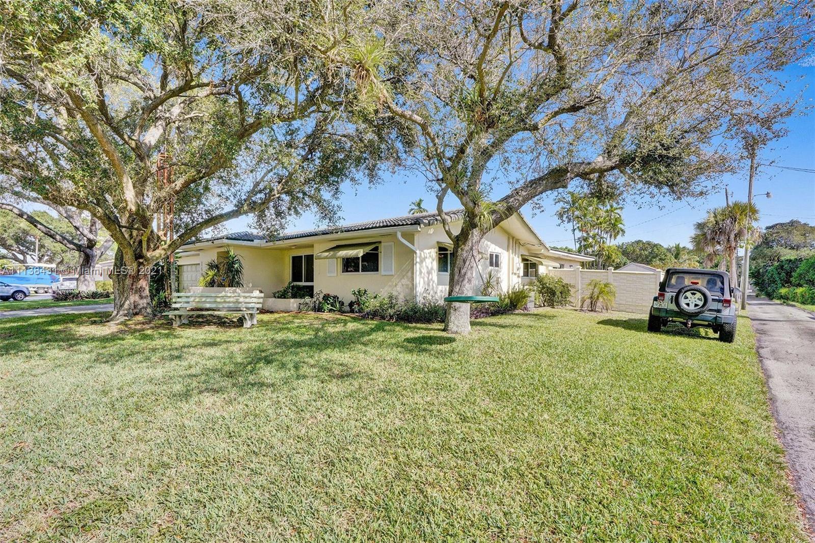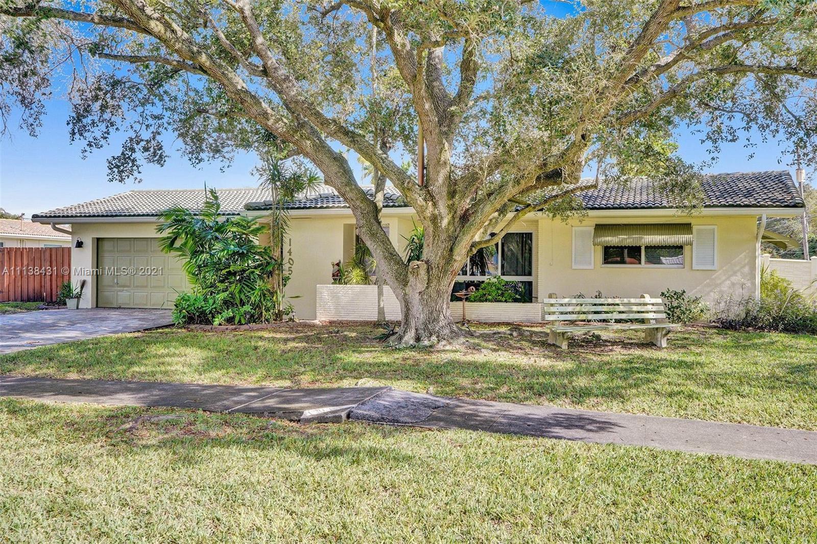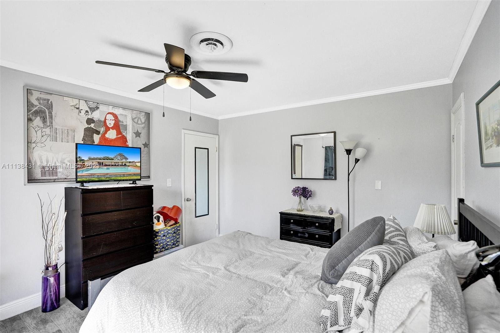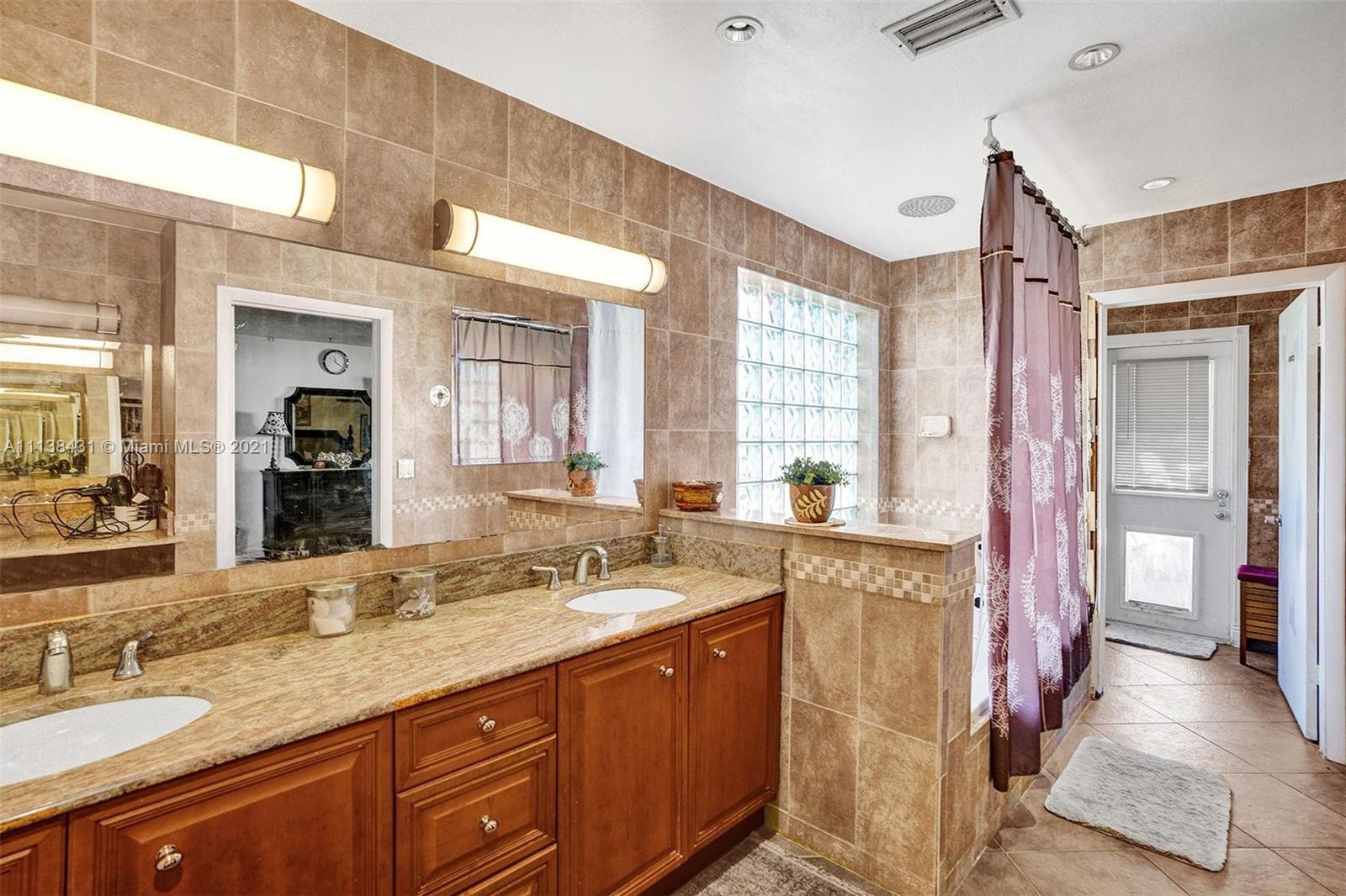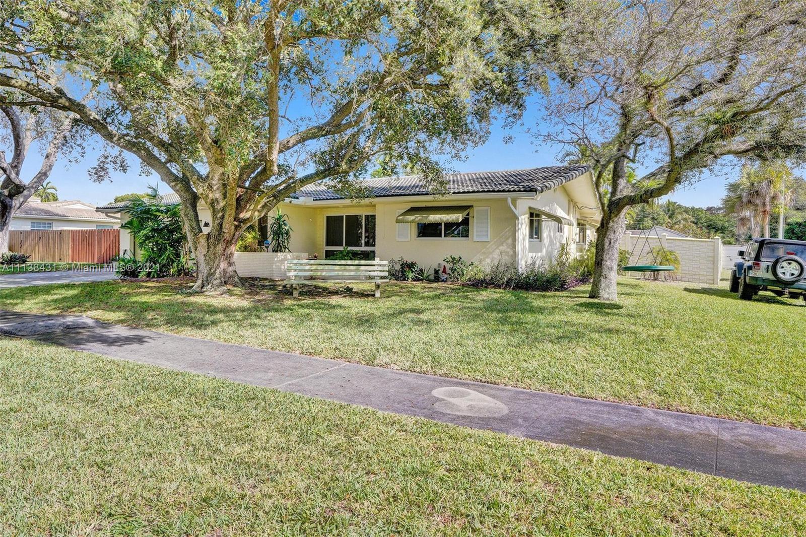 Welcome into the front living area; it attaches to the dining area with crown molding and tile flooring throughout. The unique kitchen is located around the corner, and comes with excellent upgrades including glass-front cabinets, stainless steel appliances, and exposed wood ceilings. The spacious rear living area has plenty of room to relax and unwind, and features access to the pool and patio. The primary bedroom offers tile flooring, excellent light, and a fabulous ensuite bathroom. The secondary bedrooms are ideal for accommodating guests and share a common hallway bath. Out back, float lazily in the impressive backyard pool, which is surrounded by palm trees and attached to the covered patio.
