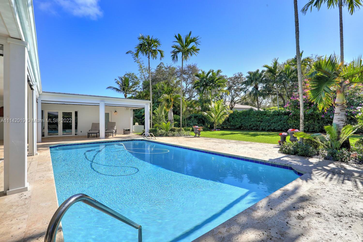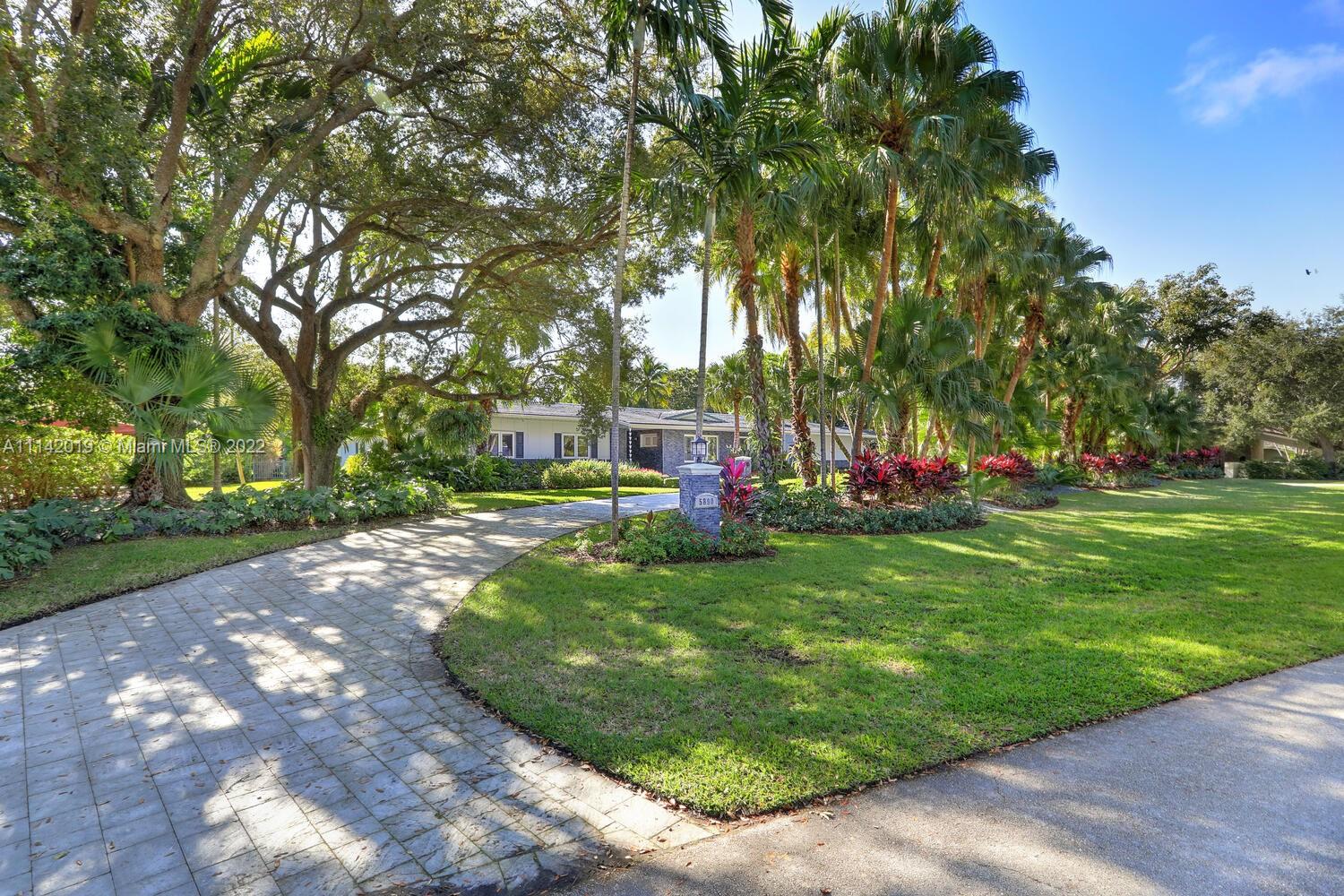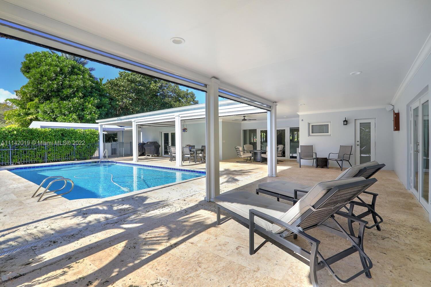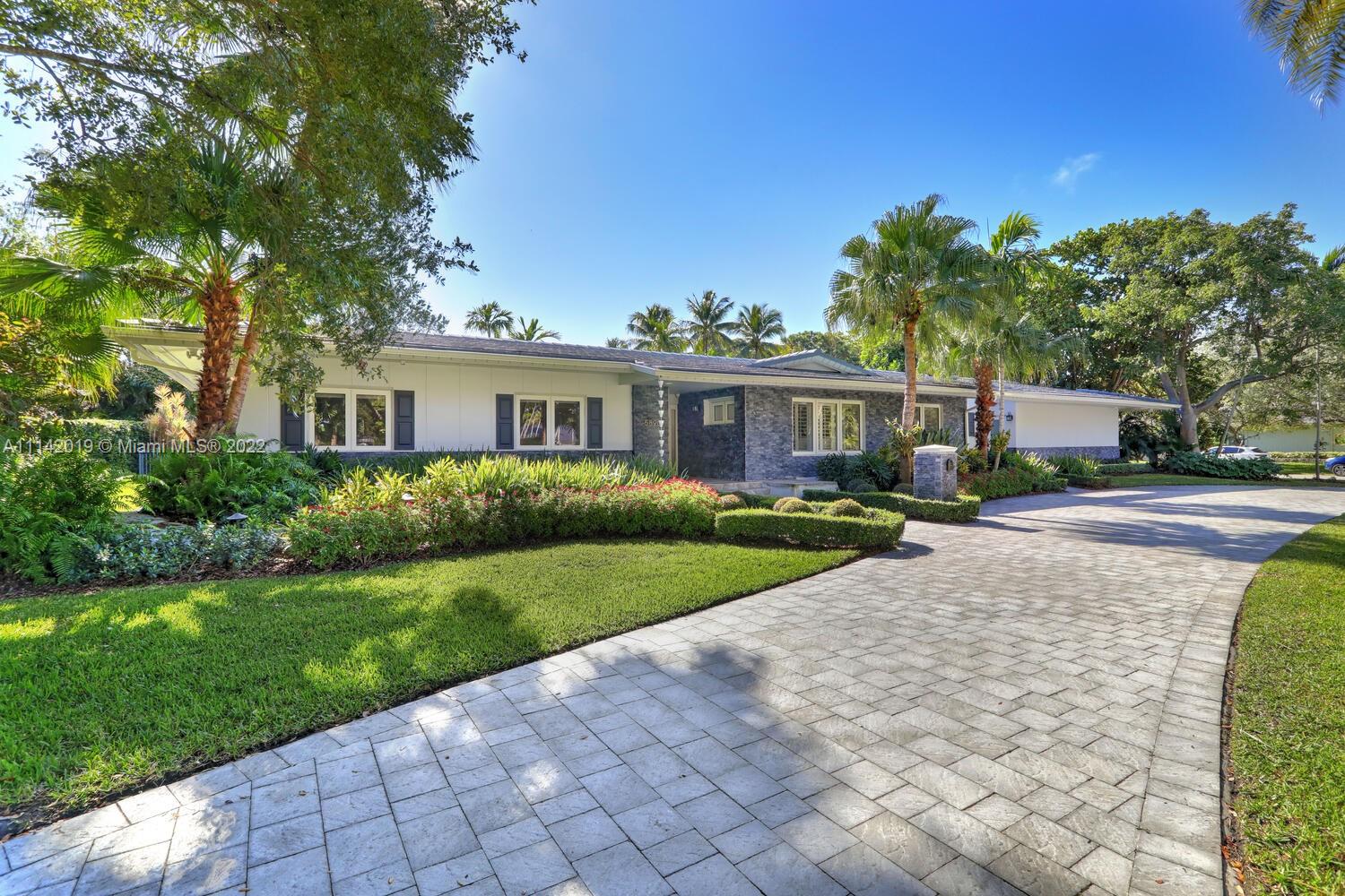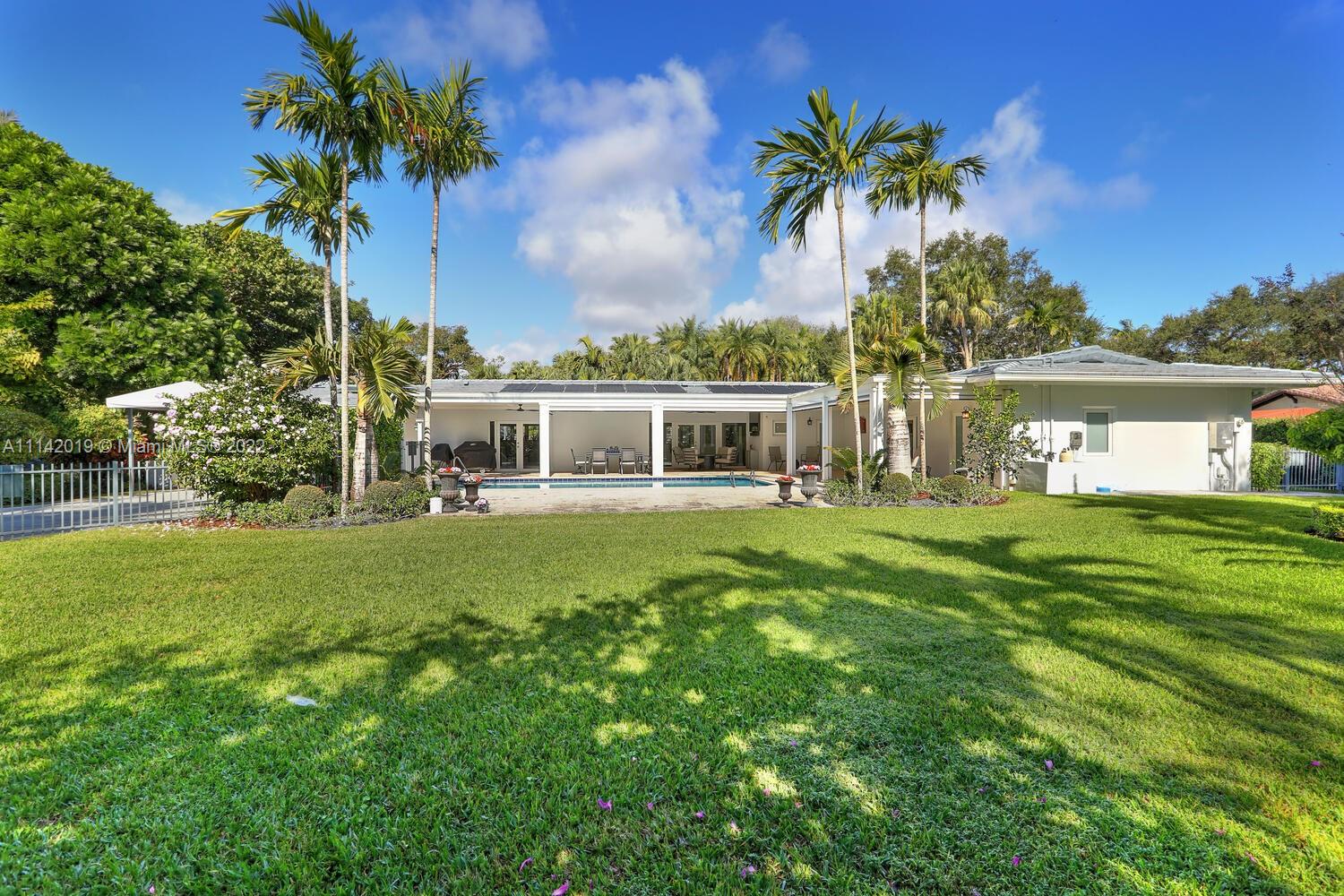 Exclusive Pine Bay Estates, rarely a home listed for sale in this small community in South Coral Gables. This mid-century ranch, sitting on a 3/4 acre corner lot has been meticulously updated to today's standard of living. 4 bedroom and 3 baths with complete hurricane protection including newly installed high impact glass windows and doors. Total Sonos sound package provides entertainment inside and out. The newly resurfaced salt water swimming pool has a Diamond Bright interior. Set way back off the street, the newly done circular driveway was paved with brick pavers. The huge backyard can be enjoyed through walls of glass or by using the large entertaining screened in porch next to the pool. The screen panels can be raising or lowered electronically with a remote. Enjoy the privacy!