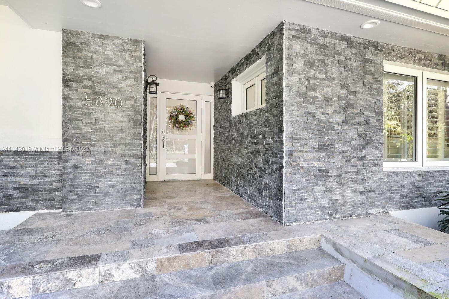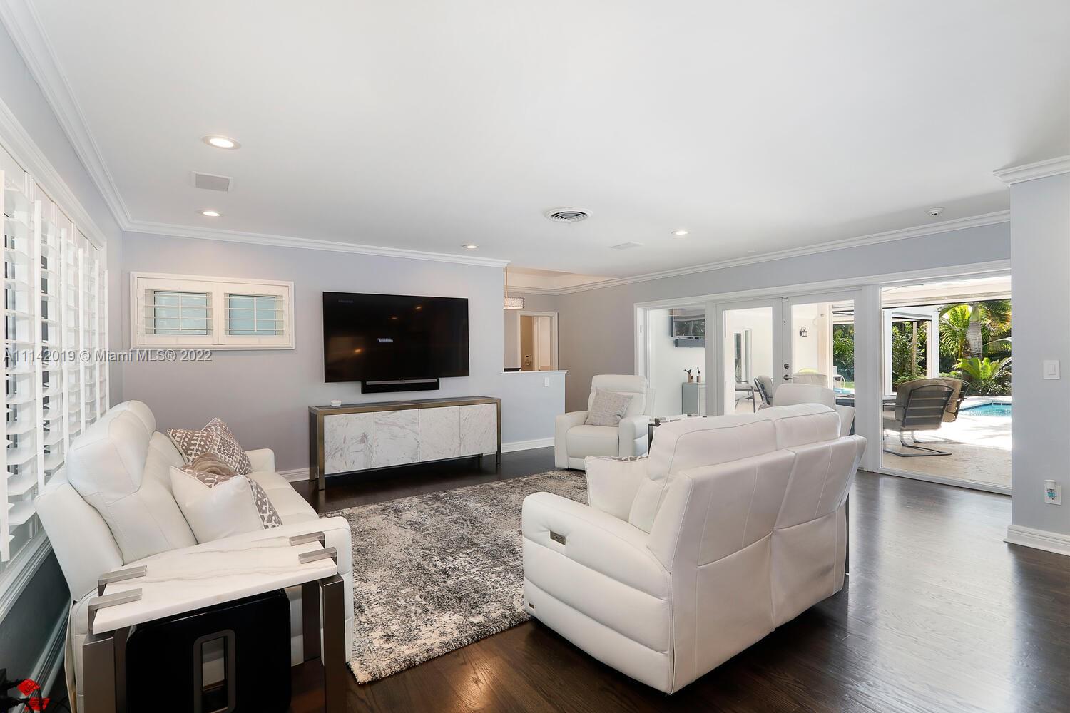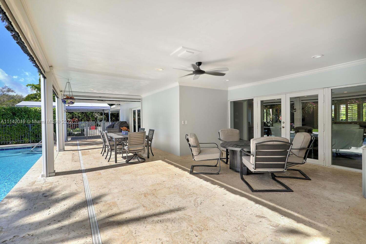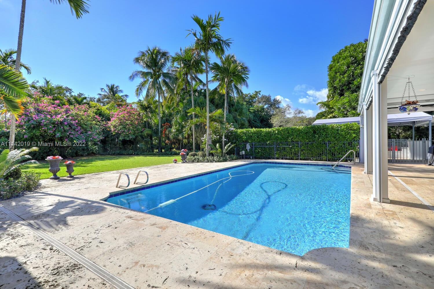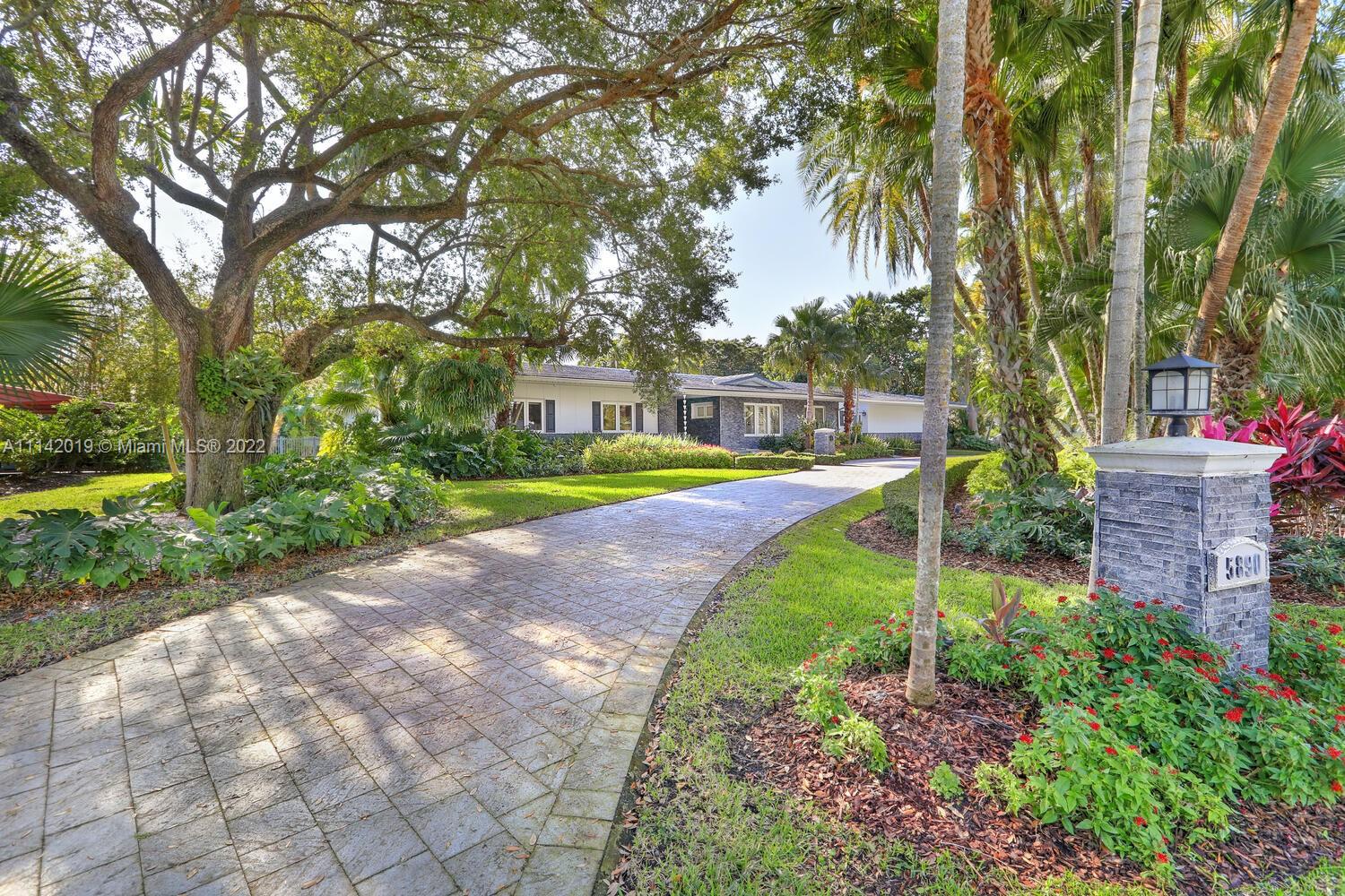 Exclusive Pine Bay Estates, rarely a home listed for sale in this small community in South Coral Gables. This mid-century ranch, sitting on a 3/4 acre corner lot has been meticulously updated to today's standard of living. 4 bedroom and 3 baths with complete hurricane protection including newly installed high impact glass windows and doors. Total Sonos sound package provides entertainment inside and out. The newly resurfaced salt water swimming pool has a Diamond Bright interior. Set way back off the street, the newly done circular driveway was paved with brick pavers. The huge backyard can be enjoyed through walls of glass or by using the large entertaining screened in porch next to the pool. The screen panels can be raising or lowered electronically with a remote. Enjoy the privacy!