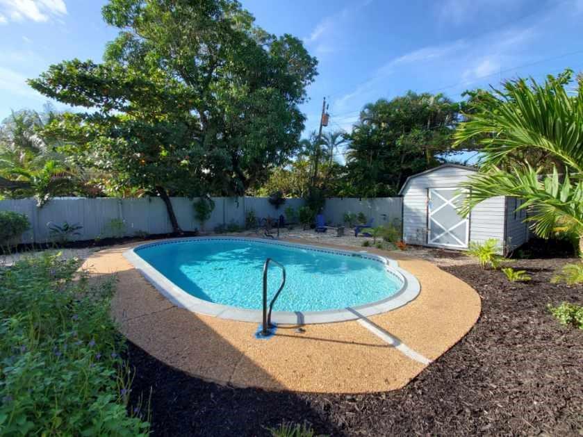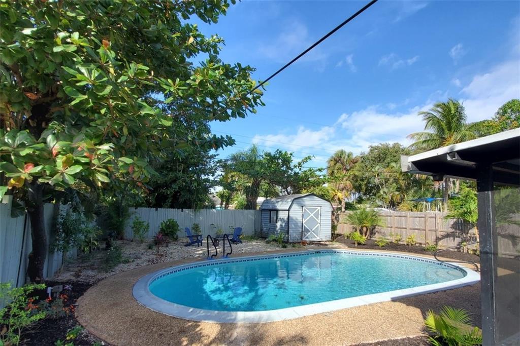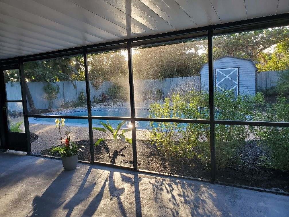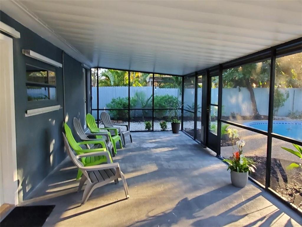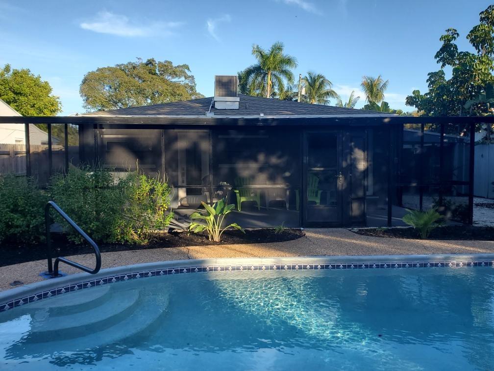 Perfect for AirBnB or home to entertain! Airy and Bright! Move in ready! Upgraded 2/2 with a sun room. Separate space has a laundry room with a brand new full sized stackable washer and dryer and office space. Open living room extends towards the kitchen and dining area. The refrigerator is new. Primary bedroom has an attached bathroom with a spa tub with jets and LED changing lights that also opens onto the screened porch. Second bedroom is large and the bathroom has been redone. Large pool home with a well manicured and private yard, new landscaping and resort style feel. Roof is 2019, AC newer, newer hot water heater, new toilet in second bath, partial sewer pipe replacement and extra clean out box installed, city permitted full aluminum storm shutters - brand new.